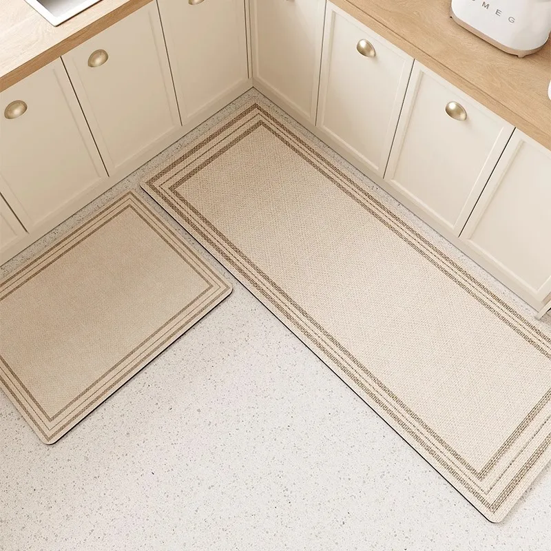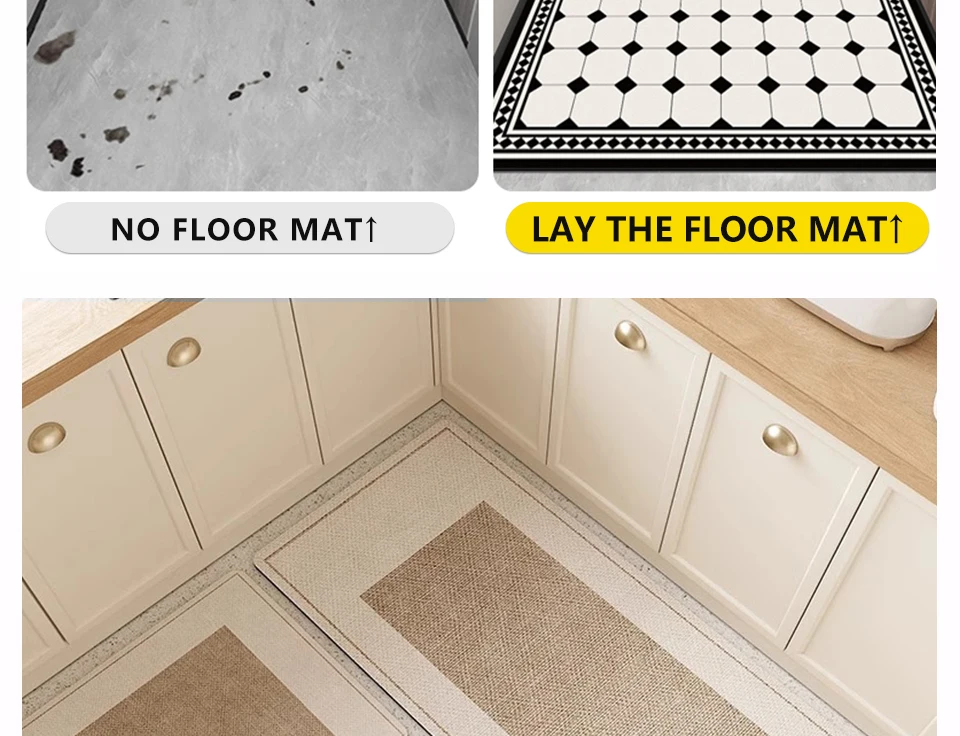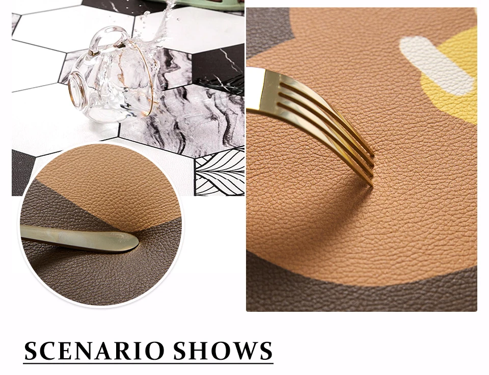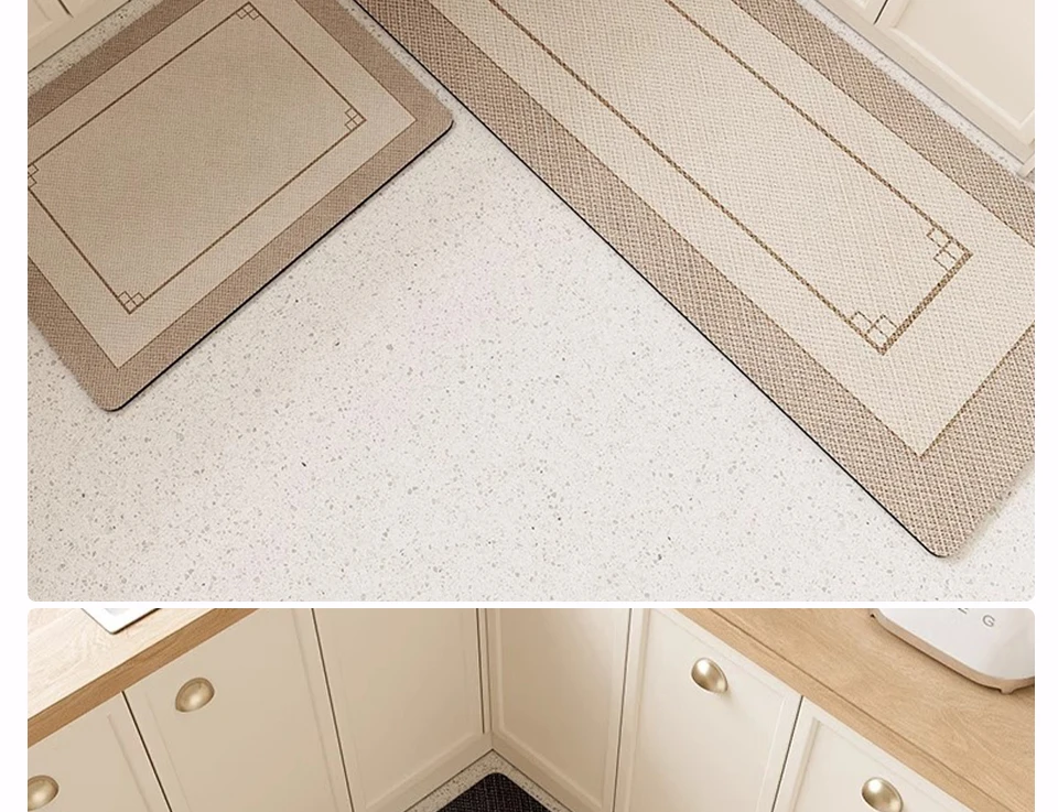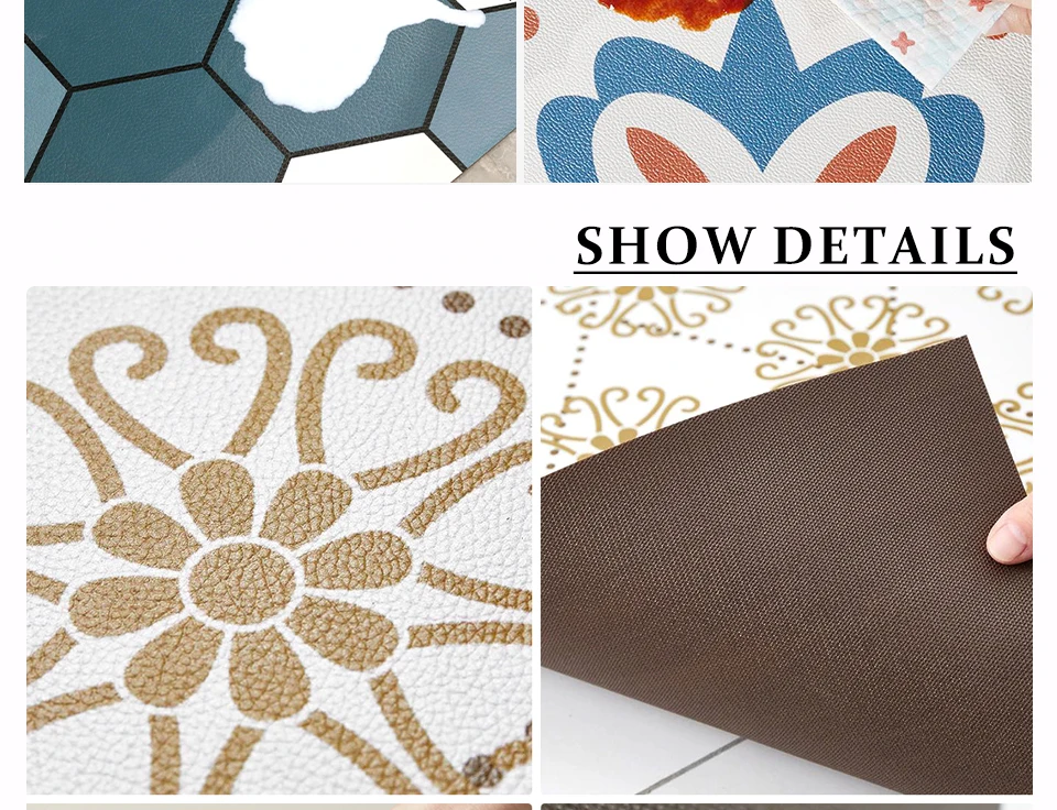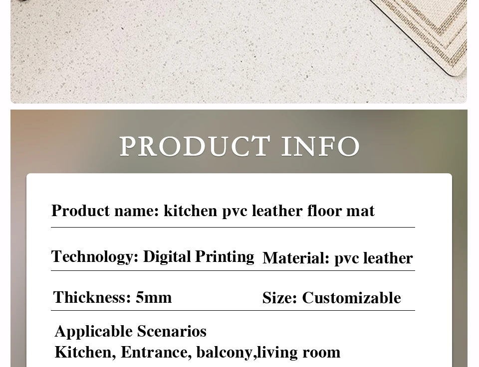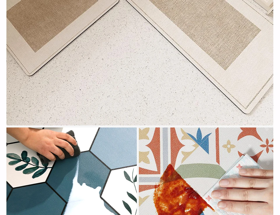 พรมปูพื้นที่คุณกำลังดูอยู่นี้ถูกออกแบบมาเพื่อการใช้งานในครัวโดยเฉพาะ เนื้อผ้าเป็นหนัง PVC คุณสมบัติหลักคือกันน้ำ กันน้ำมัน และกันลื่น ในขณะเดียวกัน ผ้าเนื้อนุ่มและยืดหยุ่นยังช่วยปกป้องเครื่องใช้บนโต๊ะอาหารจากการแตกหักเนื่องจากการตกหล่นอีกด้วย
