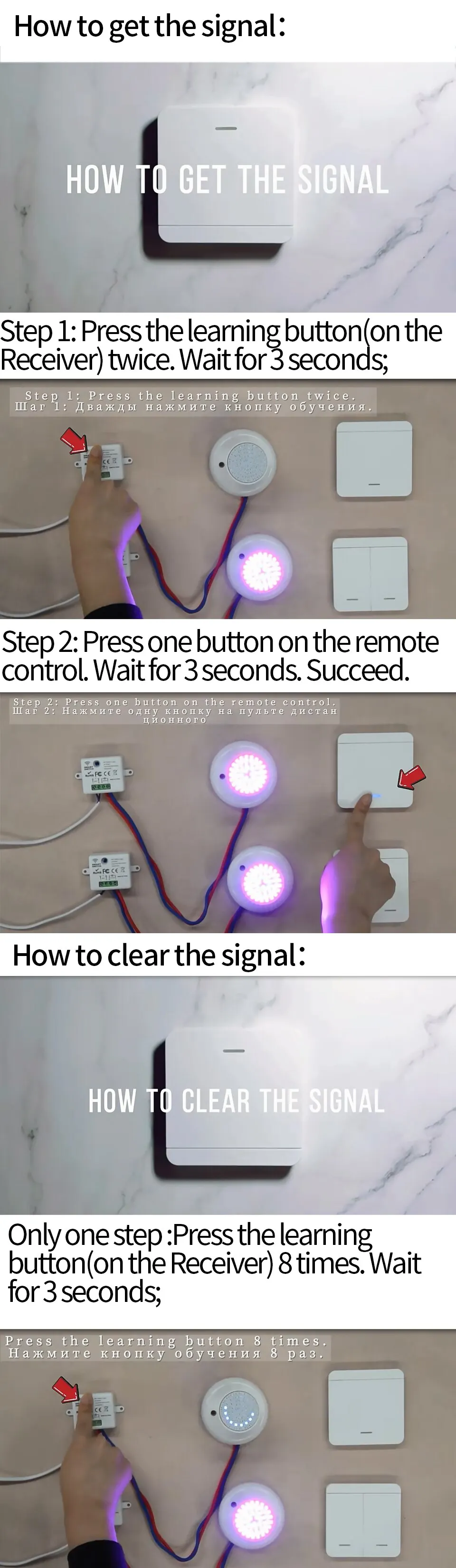 เพียงขั้นตอนเดียว: กดปุ่มการเรียนรู้ (บนตัวรับ) 8 ครั้งรอ 3 วินาที;