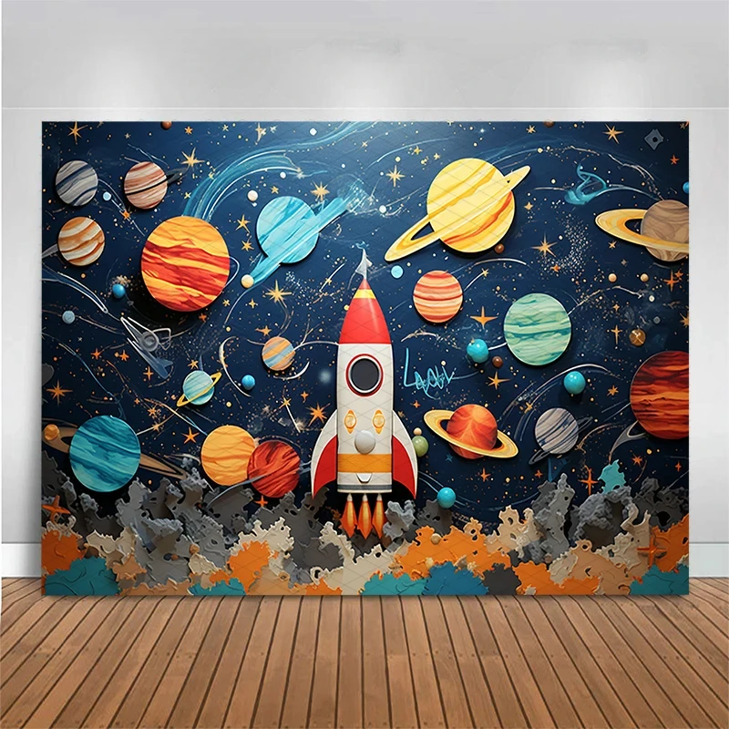 Space Rocket พื้นหลังการถ่ายภาพการ์ตูนยานอวกาศ Mars เด็กอาบน้ํา Boy Happy วันเกิดวอลล์เปเปอร์ตกแต่งฉากหลัง