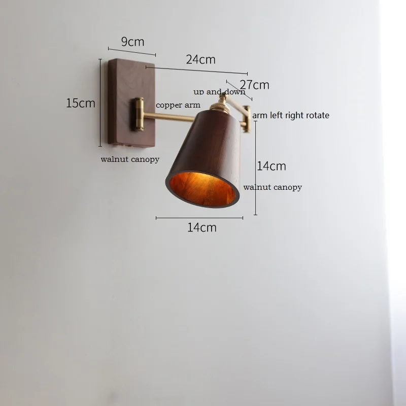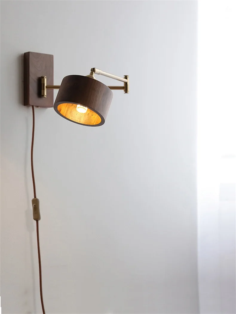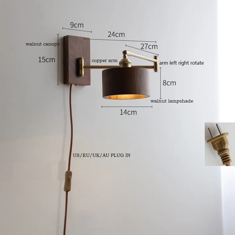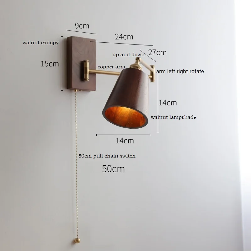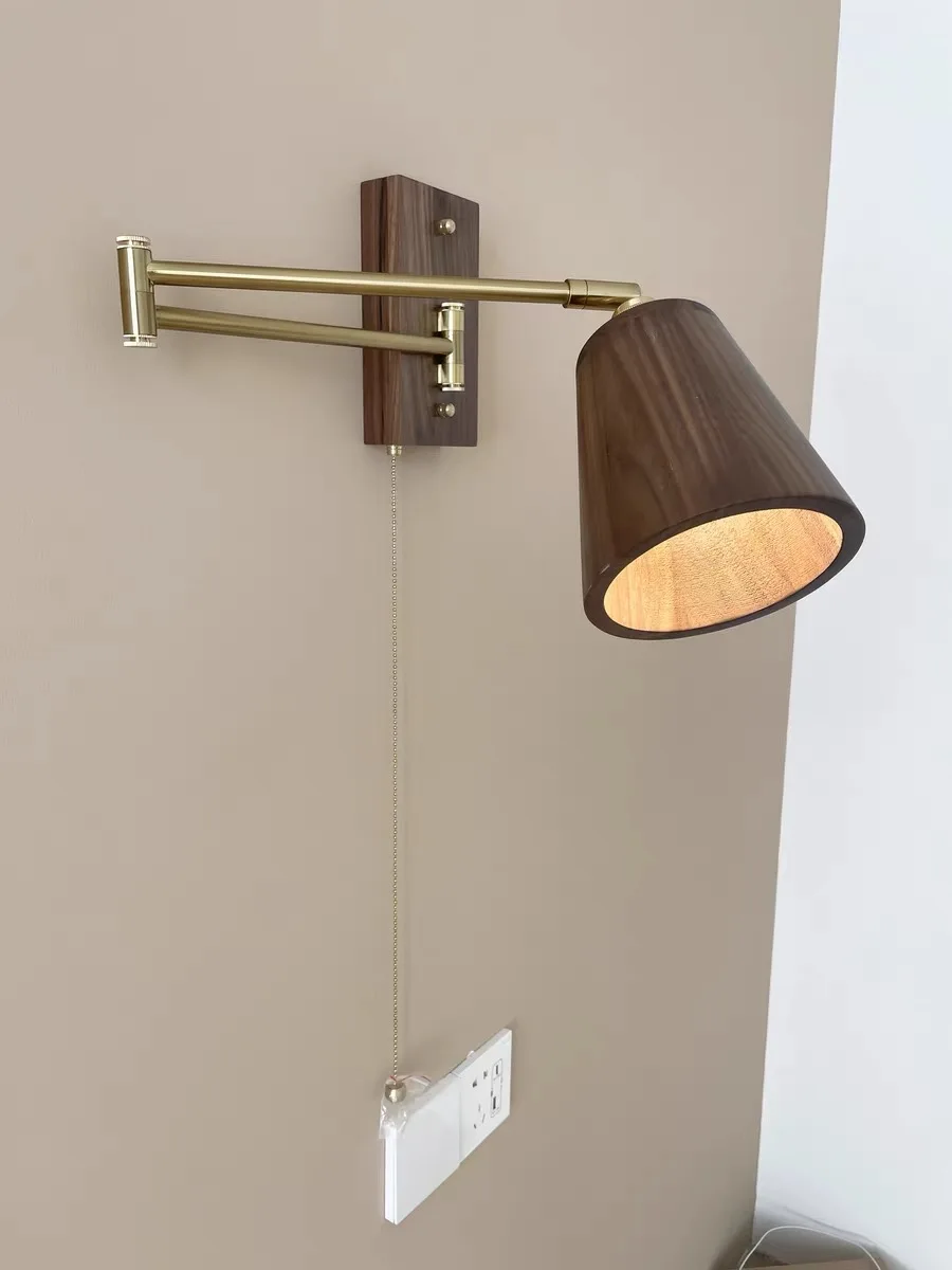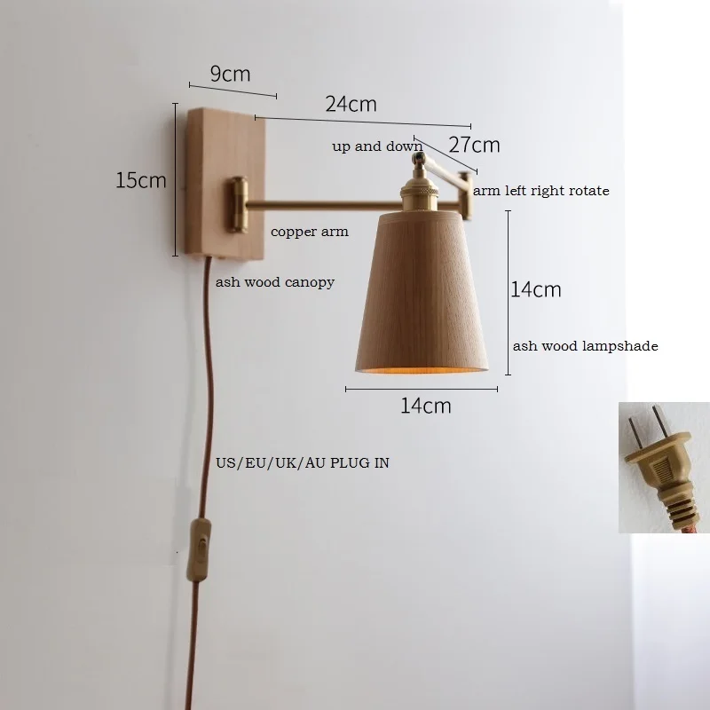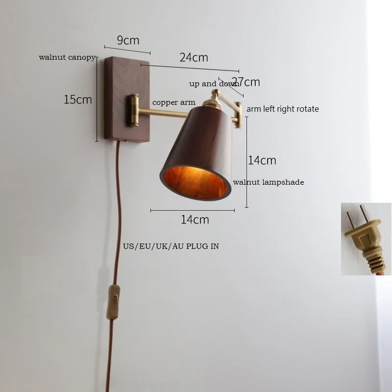 โคมไฟติดผนังสไตล์เรโทรไม้วอลนัทและแอช พร้อมไฟ LED ขาจับทองแดง ข้างเตียง มาพร้อมสวิตช์แบบโซ่ดึงและปลั๊กไฟ