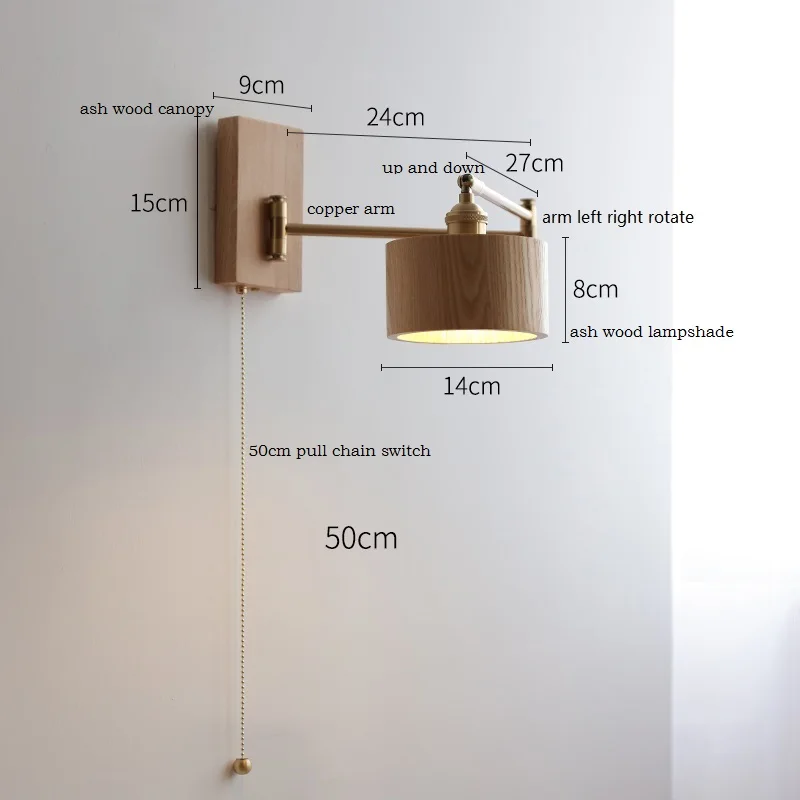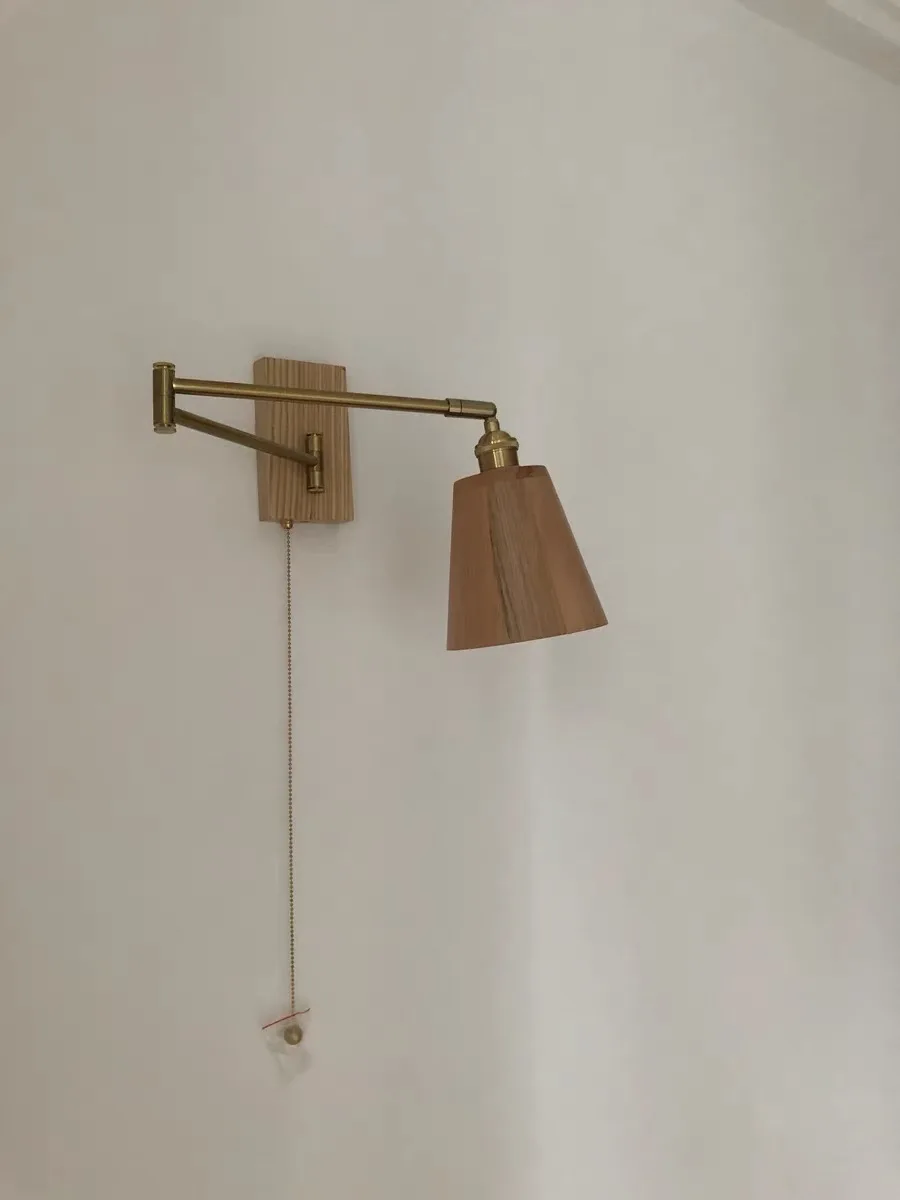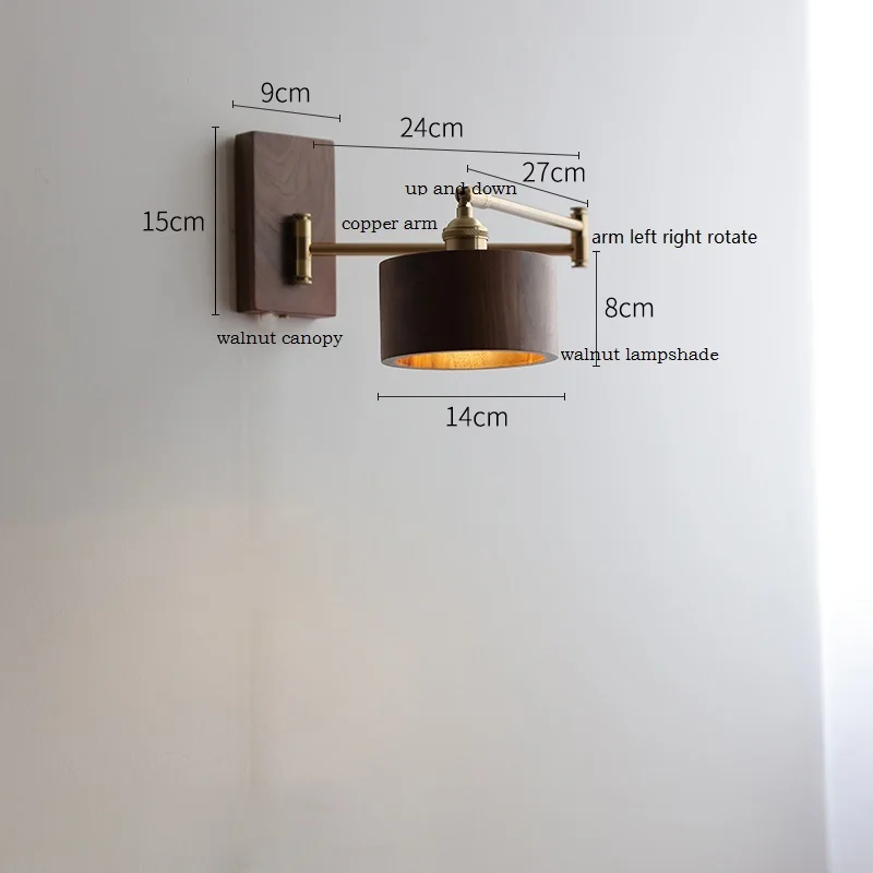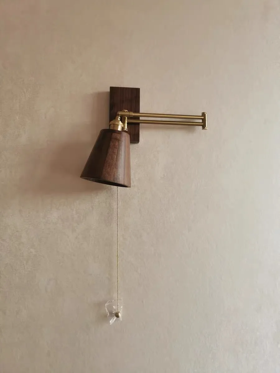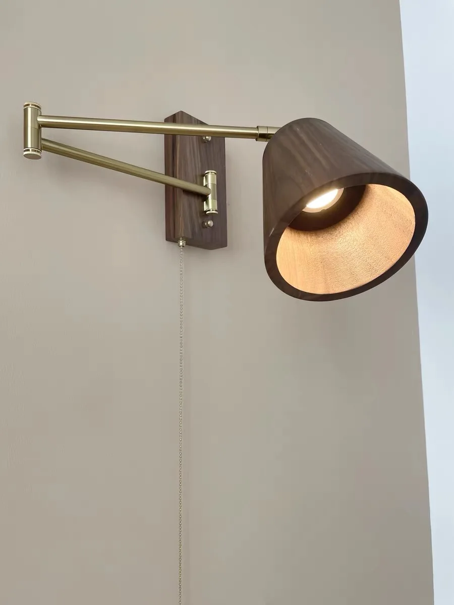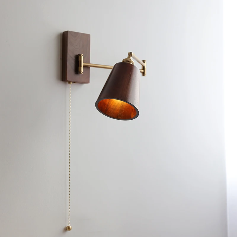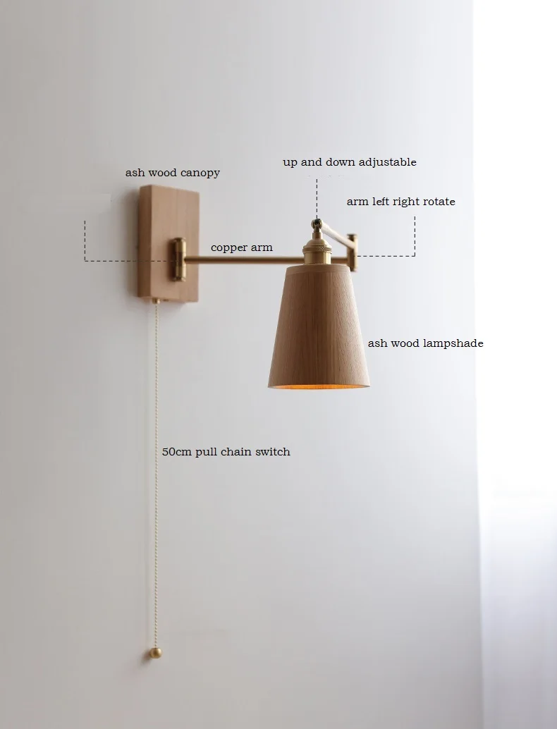 โคมไฟติดผนังสไตล์เรโทรไม้วอลนัทและแอช พร้อมไฟ LED ขาจับทองแดง ข้างเตียง มาพร้อมสวิตช์แบบโซ่ดึงและปลั๊กไฟ