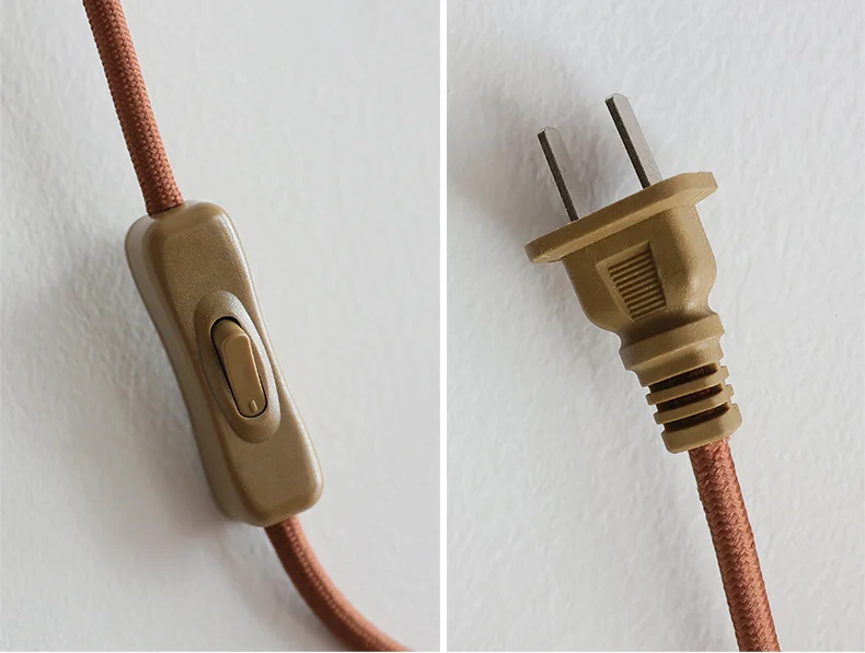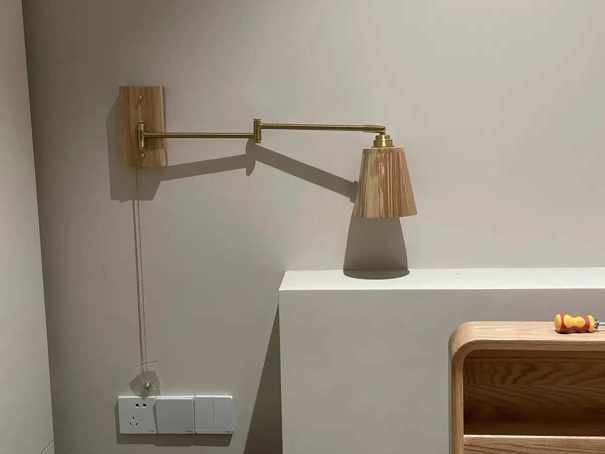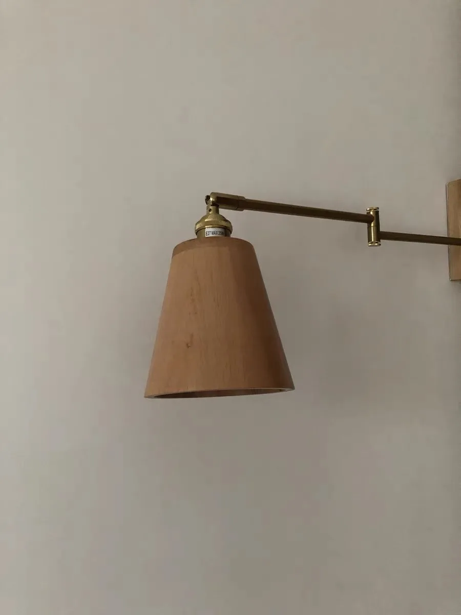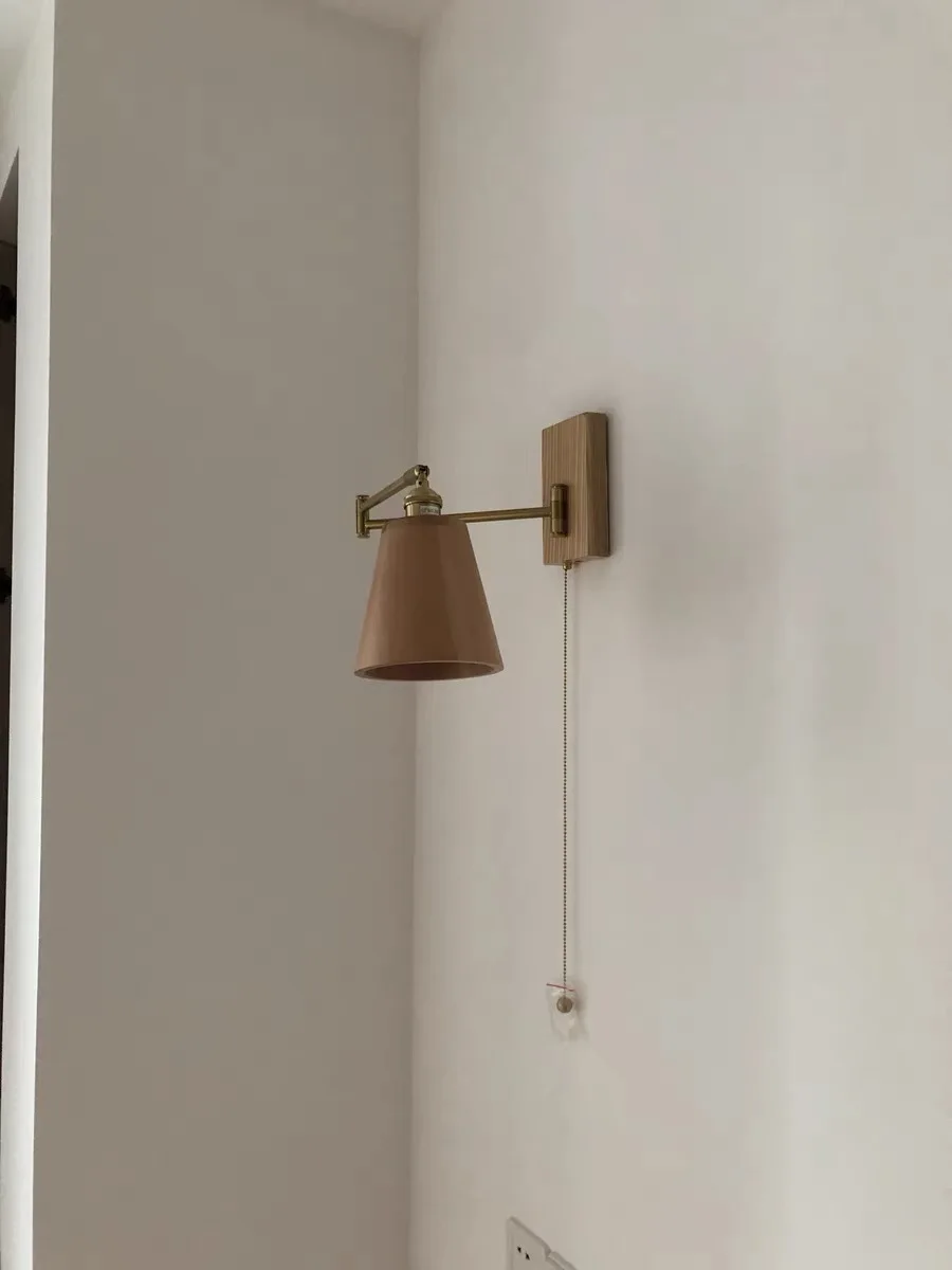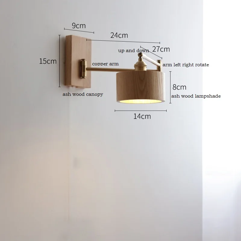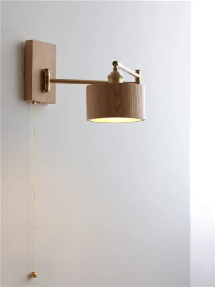 โคมไฟติดผนังสไตล์เรโทรไม้วอลนัทและแอช พร้อมไฟ LED ขาจับทองแดง ข้างเตียง มาพร้อมสวิตช์แบบโซ่ดึงและปลั๊กไฟ