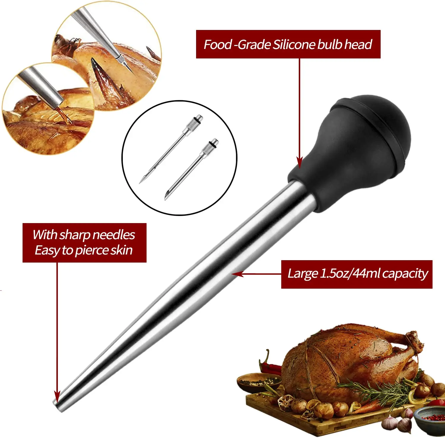 ชุดอุปกรณ์ฉีดน้ำสำหรับไก่งวง: ชุดอุปกรณ์นี้ประกอบด้วยหลอดฉีดน้ำ 1 ชิ้น, ท่อสแตนเลส 1 ชิ้น, แปรงทำความสะอาด 1 ชิ้น และเข็มฉีดน้ำสำหรับไก่งวง 2 แบบที่แตกต่างกันเพื่อเพิ่มรสชาติ เป็นผู้ช่วยที่ดีในครัวสำหรับมื้อค่ำวันขอบคุณพระเจ้าหรือคริสต์มาสครั้งถัดไปของคุณ