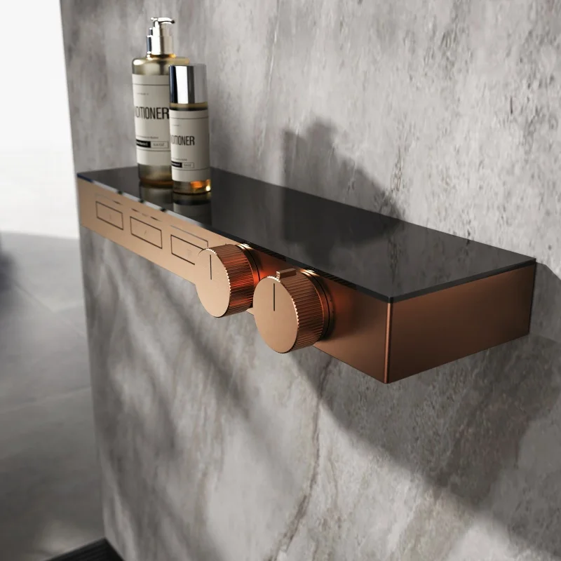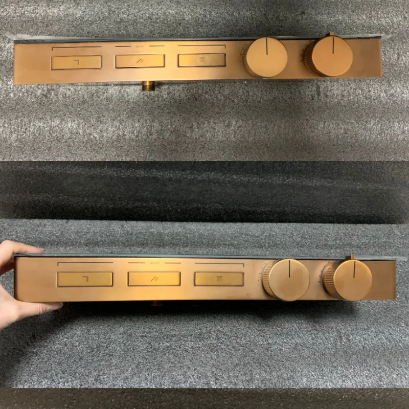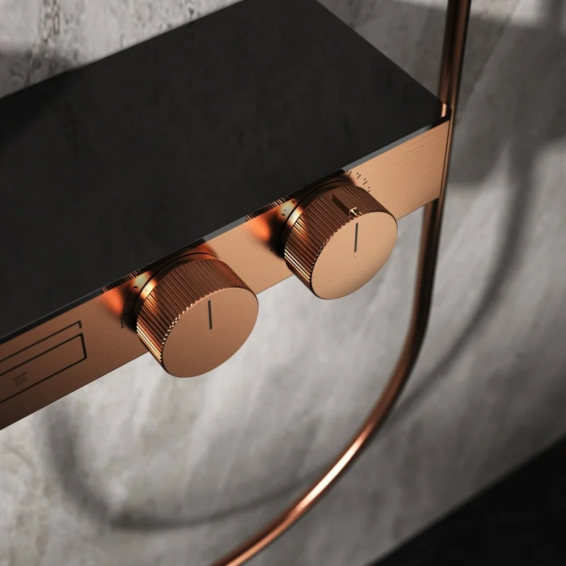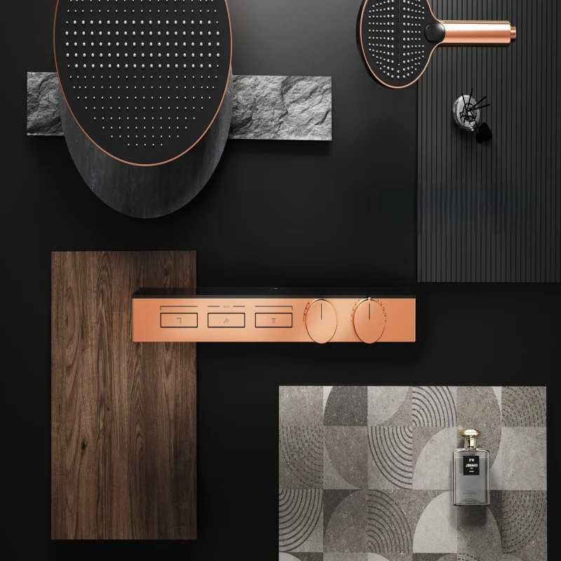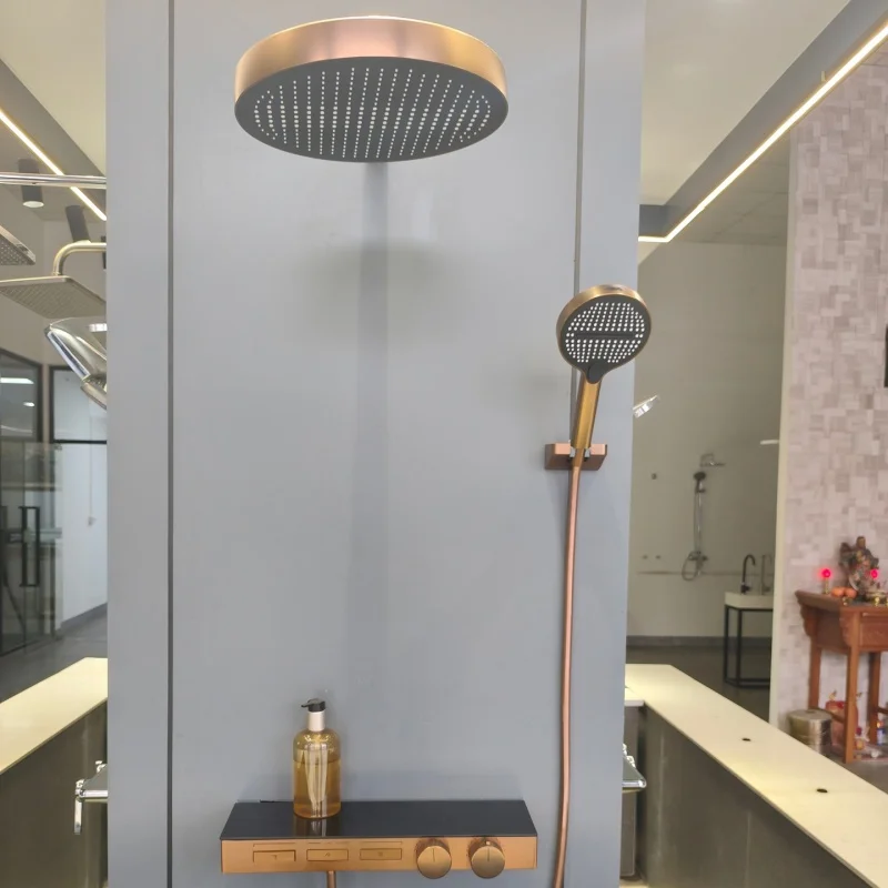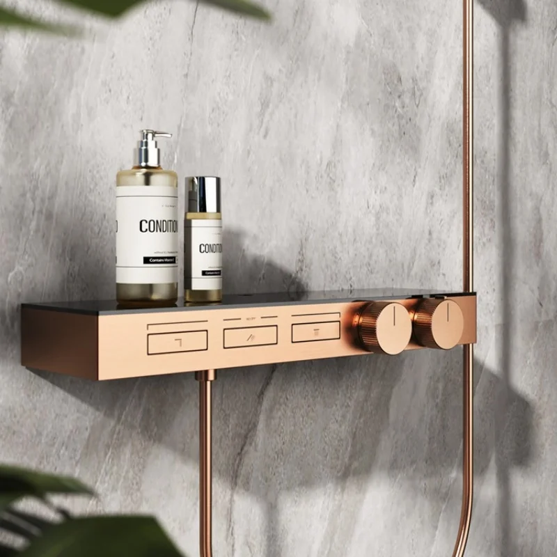 แปรง Rose Gold Thermostatic ห้องน้ำฝักบัวก๊อกน้ำทองเหลืองสีเทาห้องน้ำฝนฝักบัวก๊อกน้ำติดผนังอ่างอาบน้ำฝักบัวก๊อกน้ำ