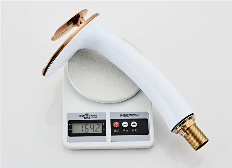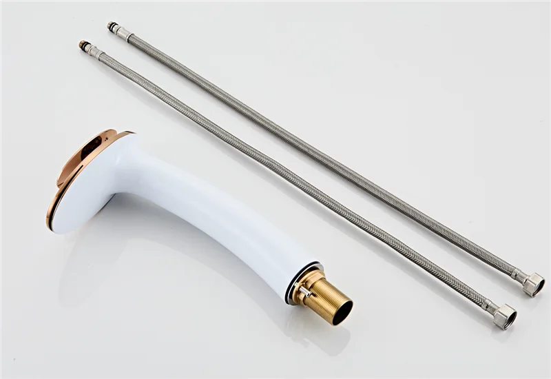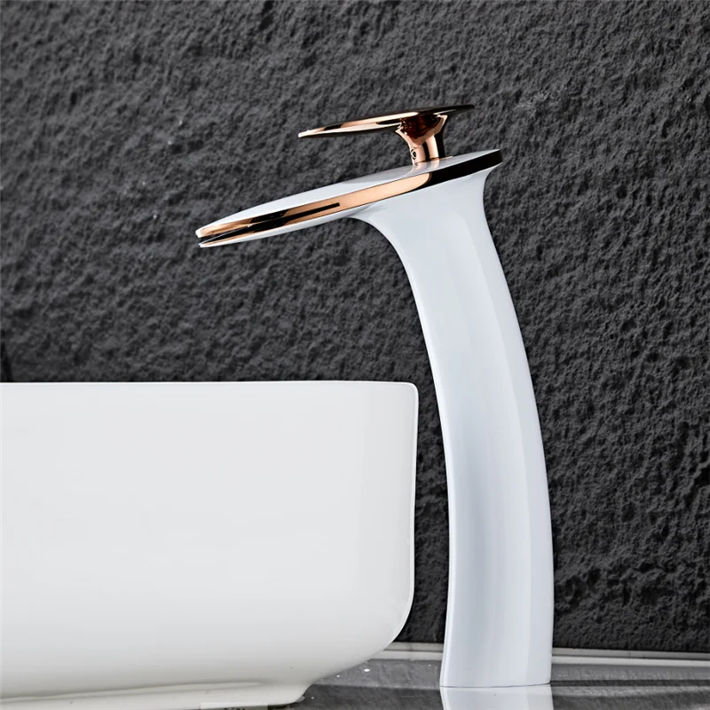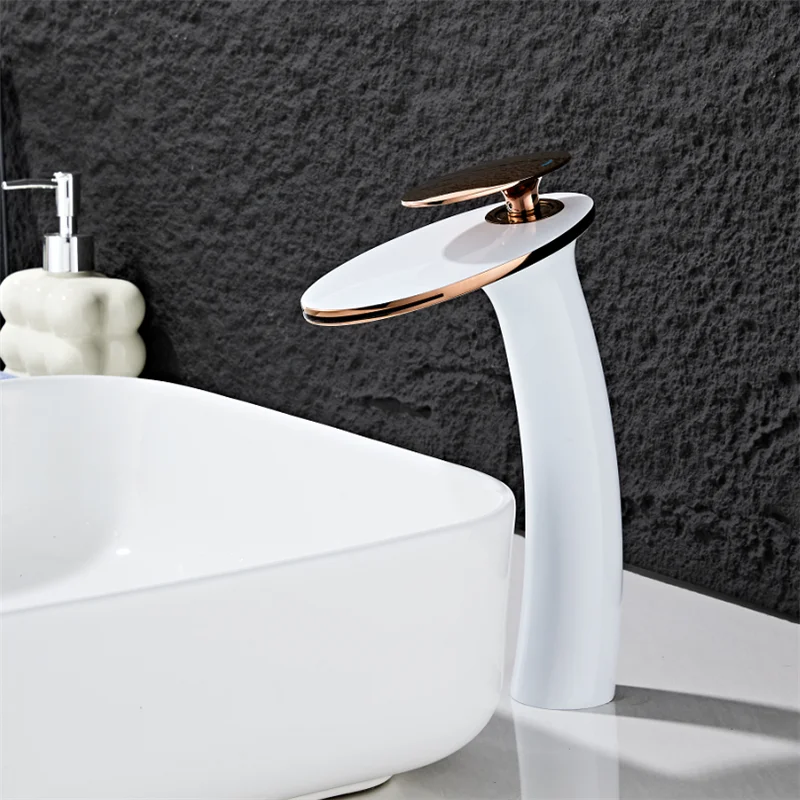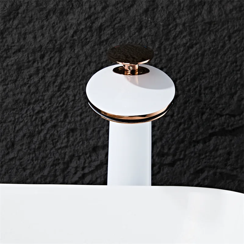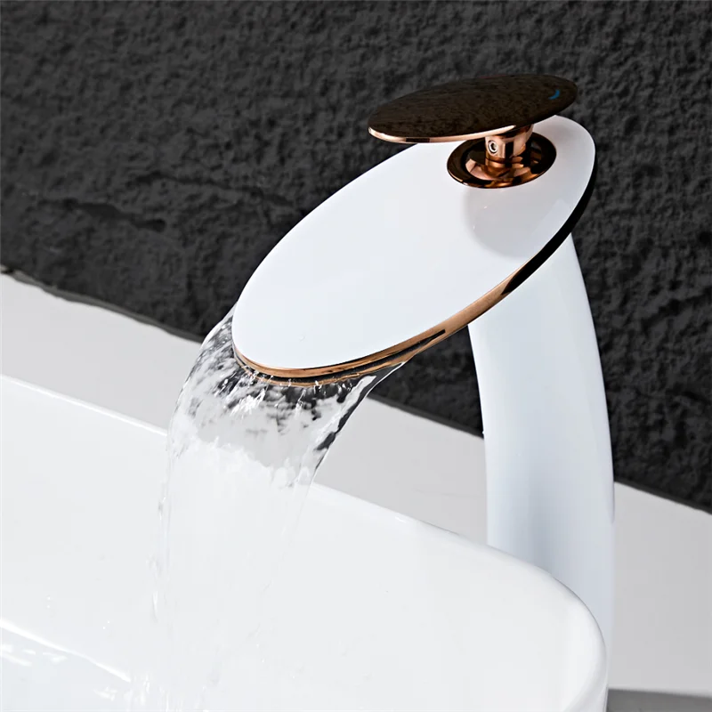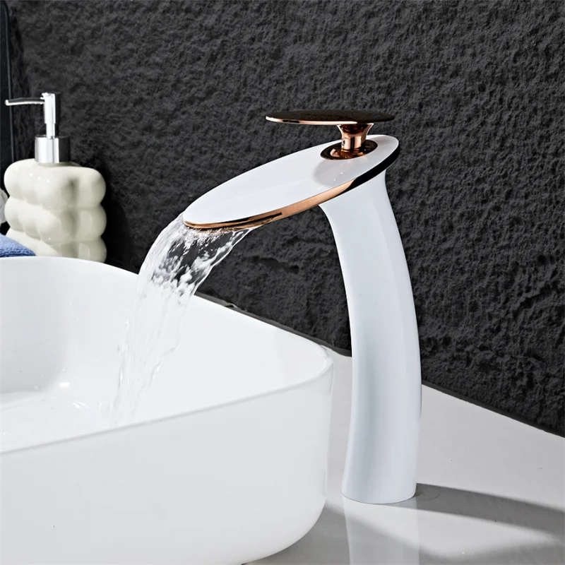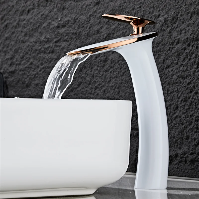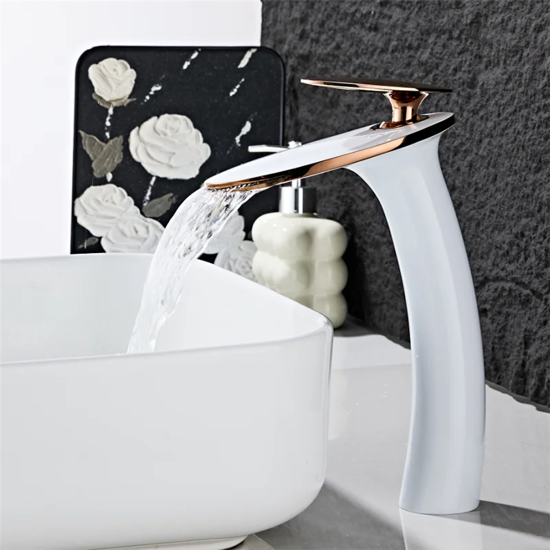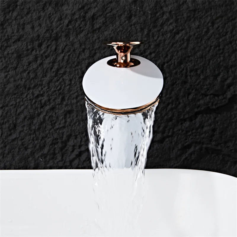ก๊อกน้ำห้องน้ำสีโรสโกลด์ ก๊อกน้ำอ่างล้างหน้าทองเหลือง ก๊อกน้ำอ่างล้างมือ ก๊อกน้ำน้ำตกสำหรับน้ำร้อนและน้ำเย็น ก๊อกน้ำอ่างล้างหน้าแบบติดตั้งบนเคาน์เตอร์