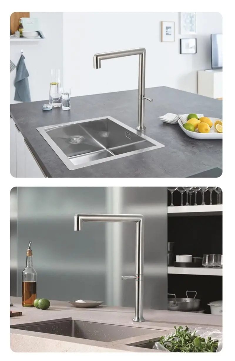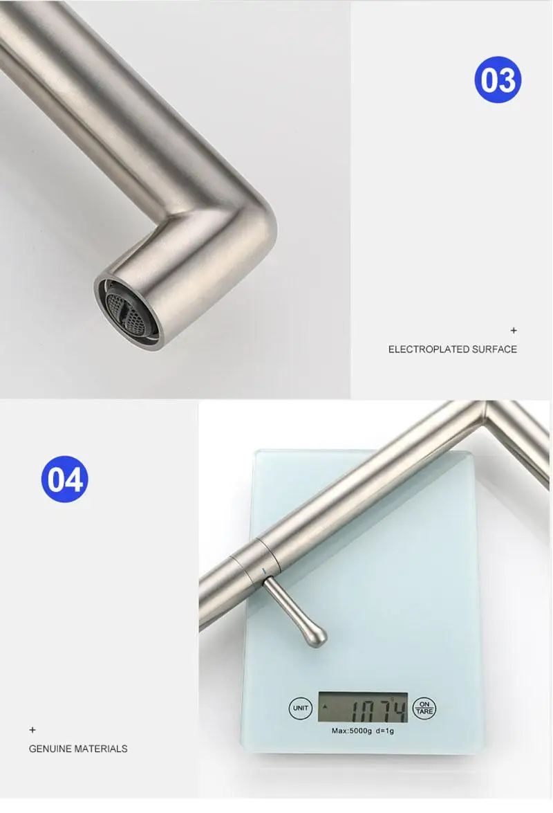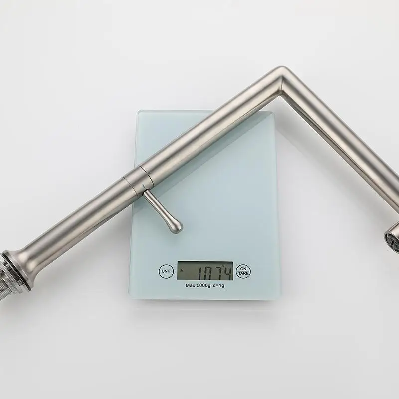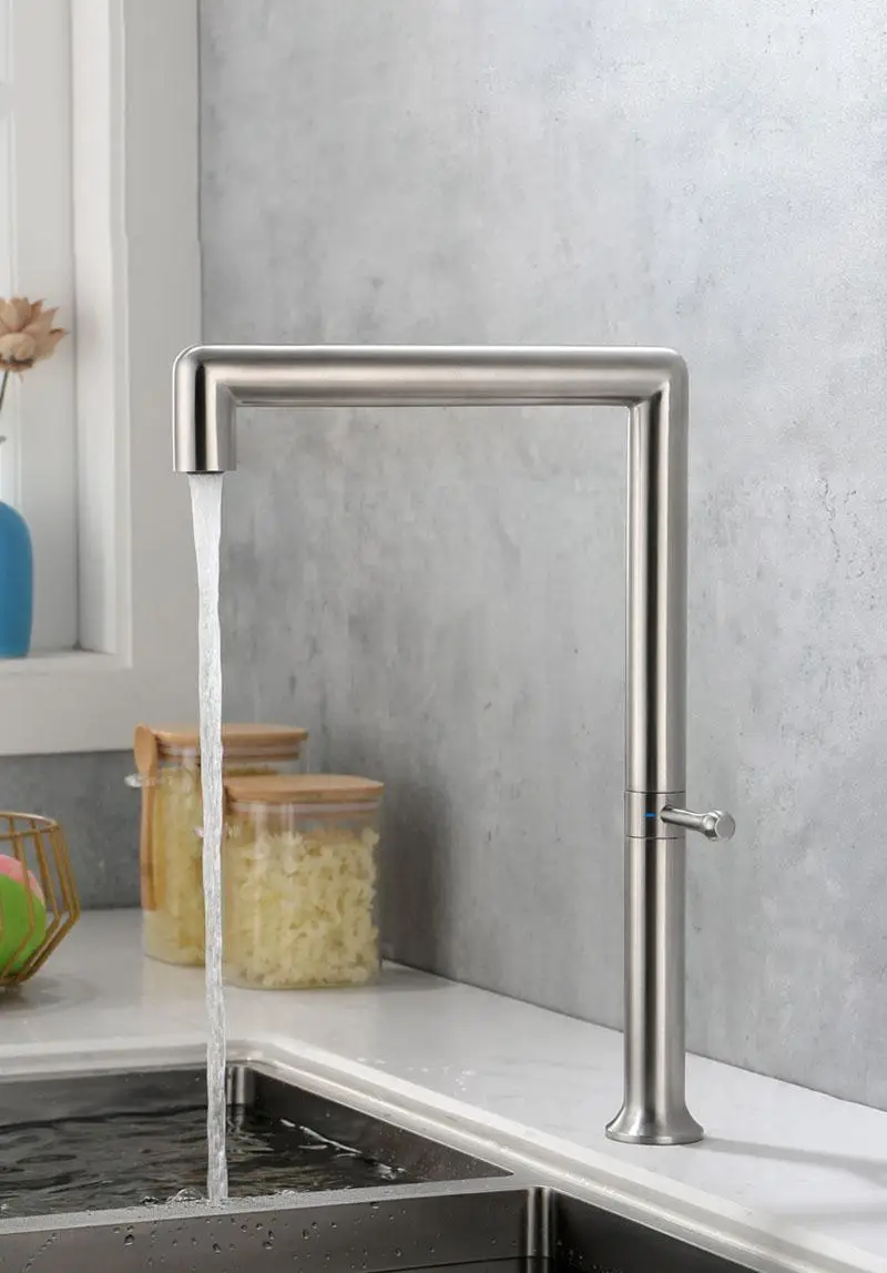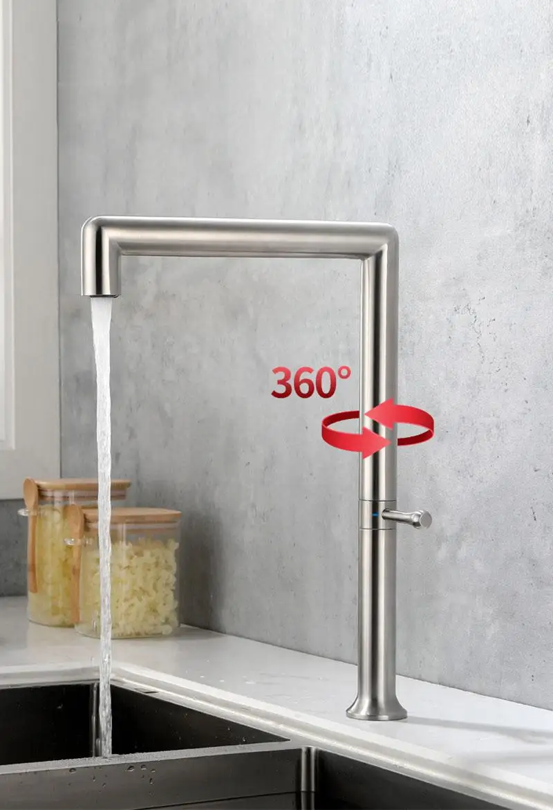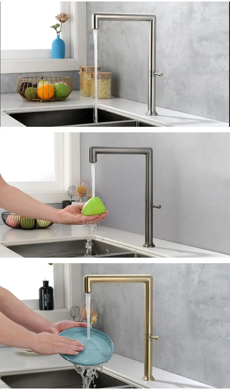 ก๊อกน้ำอ่างล้างจานสแตนเลส 304 สีทองขัดเงา ดีไซน์สร้างสรรค์ หมุนได้ 180 องศา ก๊อกผสมสำหรับอ่างล้างจานบนเคาน์เตอร์