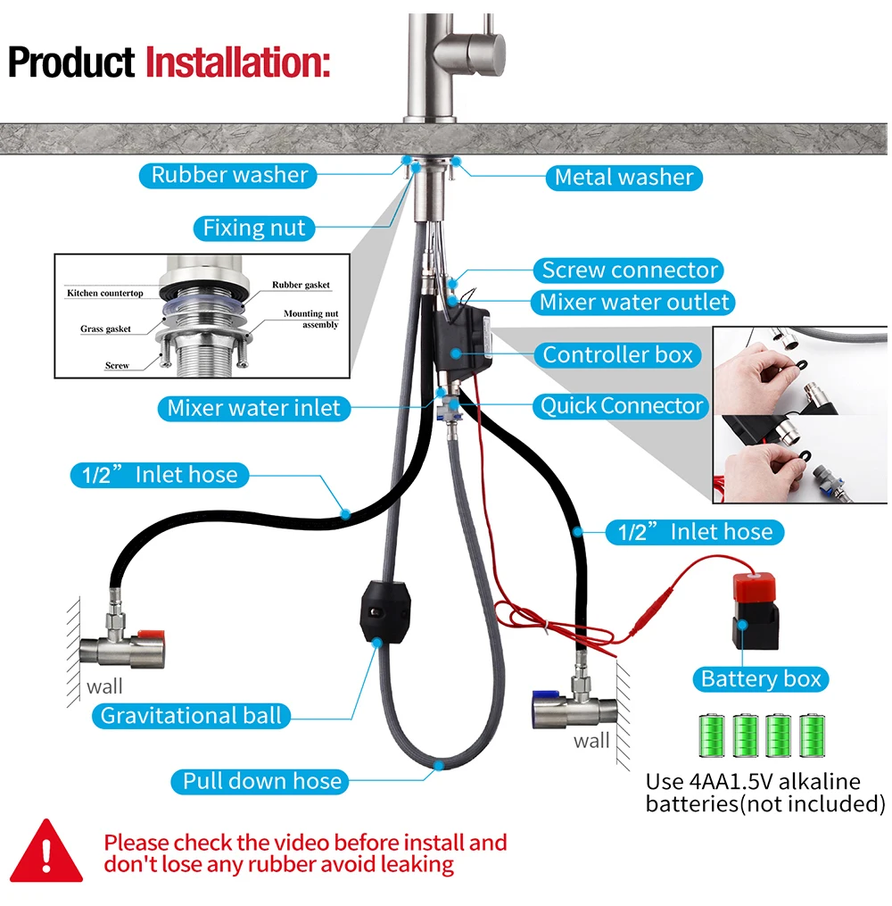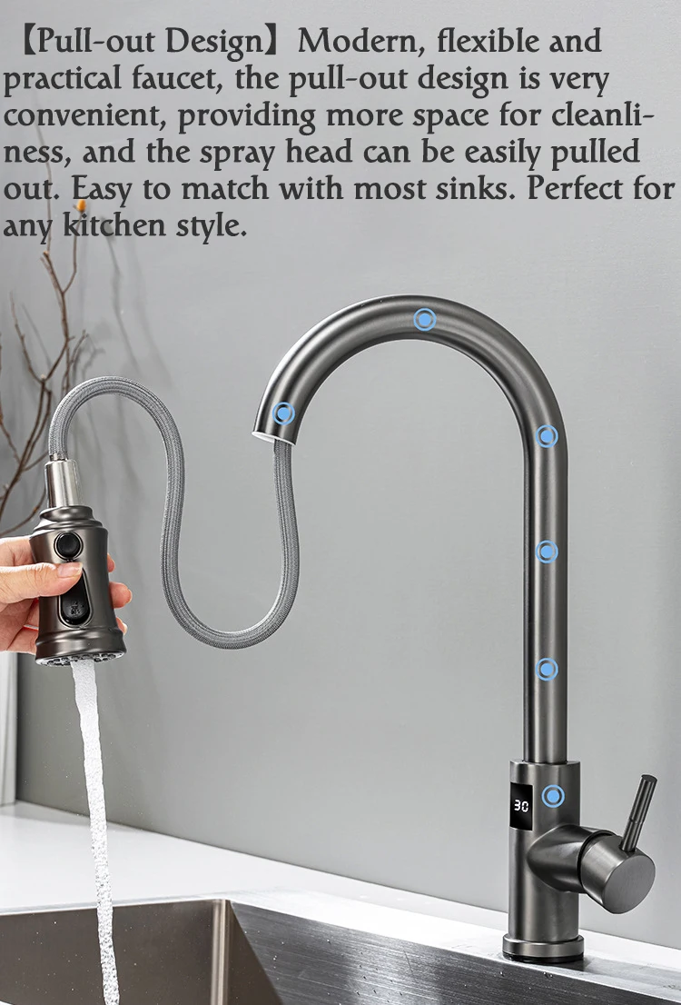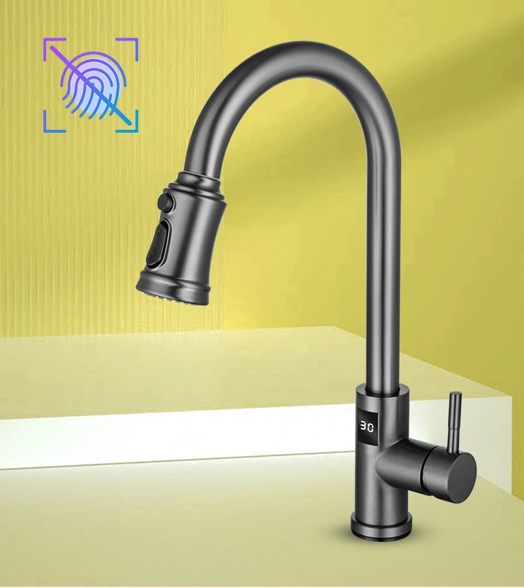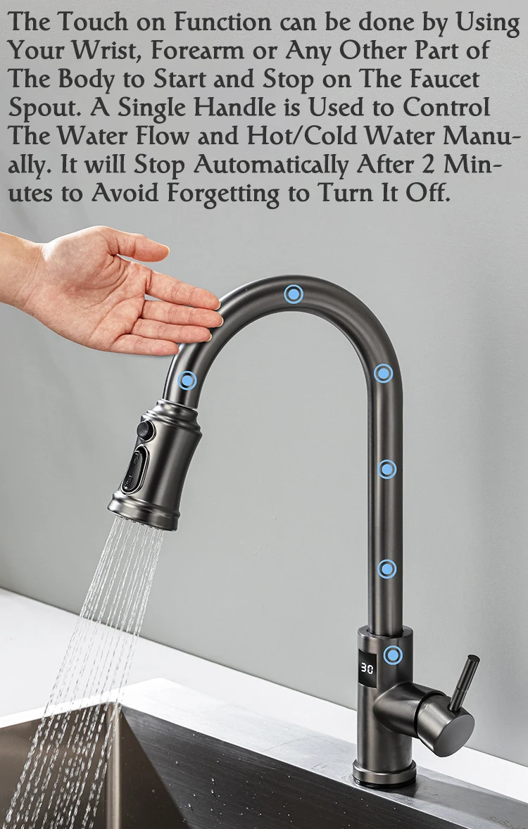 【สัมผัส K【ก๊อกน้ำสำหรับห้องครัว】ฟังก์ชันสัมผัสสามารถใช้งานได้โดยการใช้ข้อมือ ปลายแขน หรือส่วนอื่น ๆ ของร่างกายเพื่อเปิดและปิดน้ำที่หัวก๊อกใช้ที่จับเดียวเพื่อควบคุมการไหลของน้ำและน้ำร้อน/น้ำเย็นด้วยตนเองจะหยุดทำงานโดยอัตโนมัติหลังจาก 2 นาที เพื่อป้องกันการลืมปิดเครื่อง