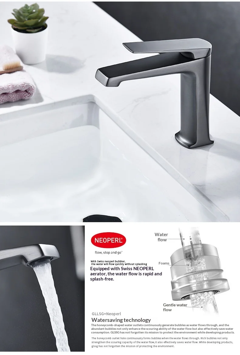ก๊อกน้ำอ่างล้างหน้าสีเทาปืนขัดเงาทำจากทองแดงทั้งหมด สไตล์หรูหราแบบมินิมอลแบบนอร์ดิก อ่างล้างหน้าใต้เคาน์เตอร์ ก๊อกน้ำร้อนและน้ำเย็น 1