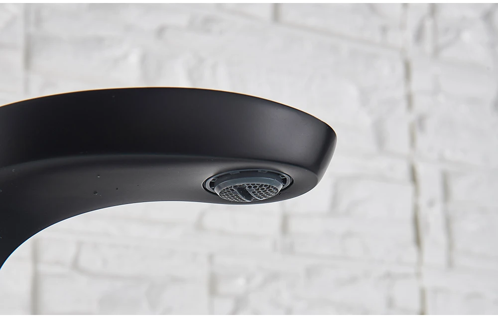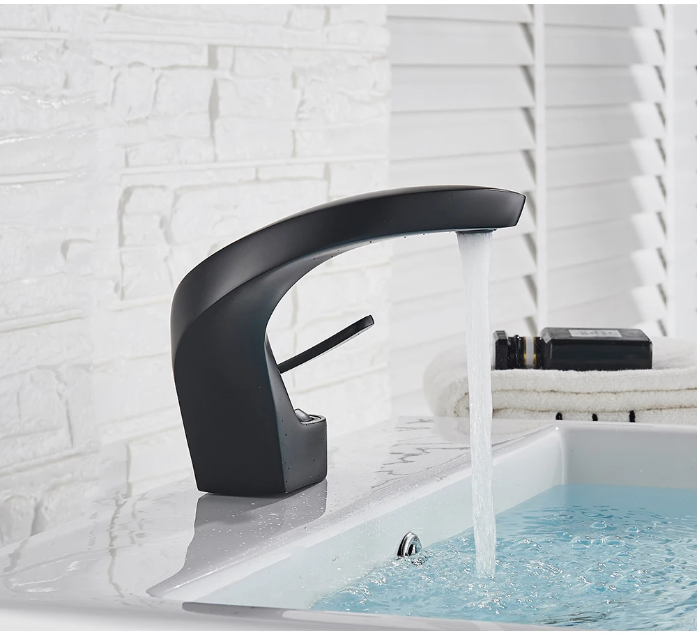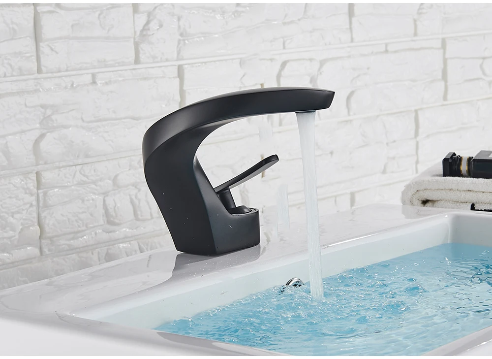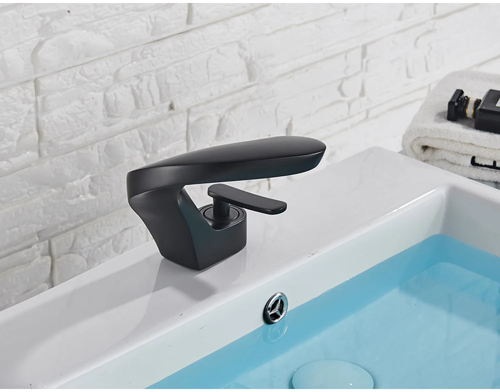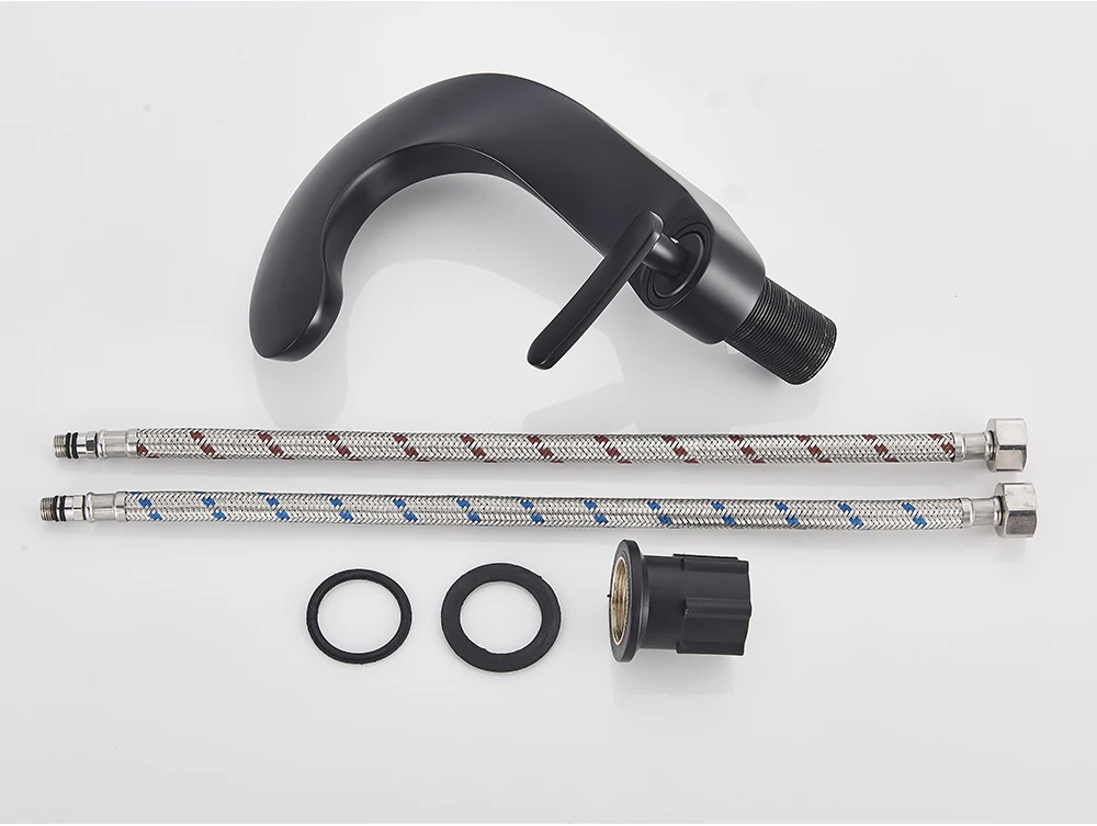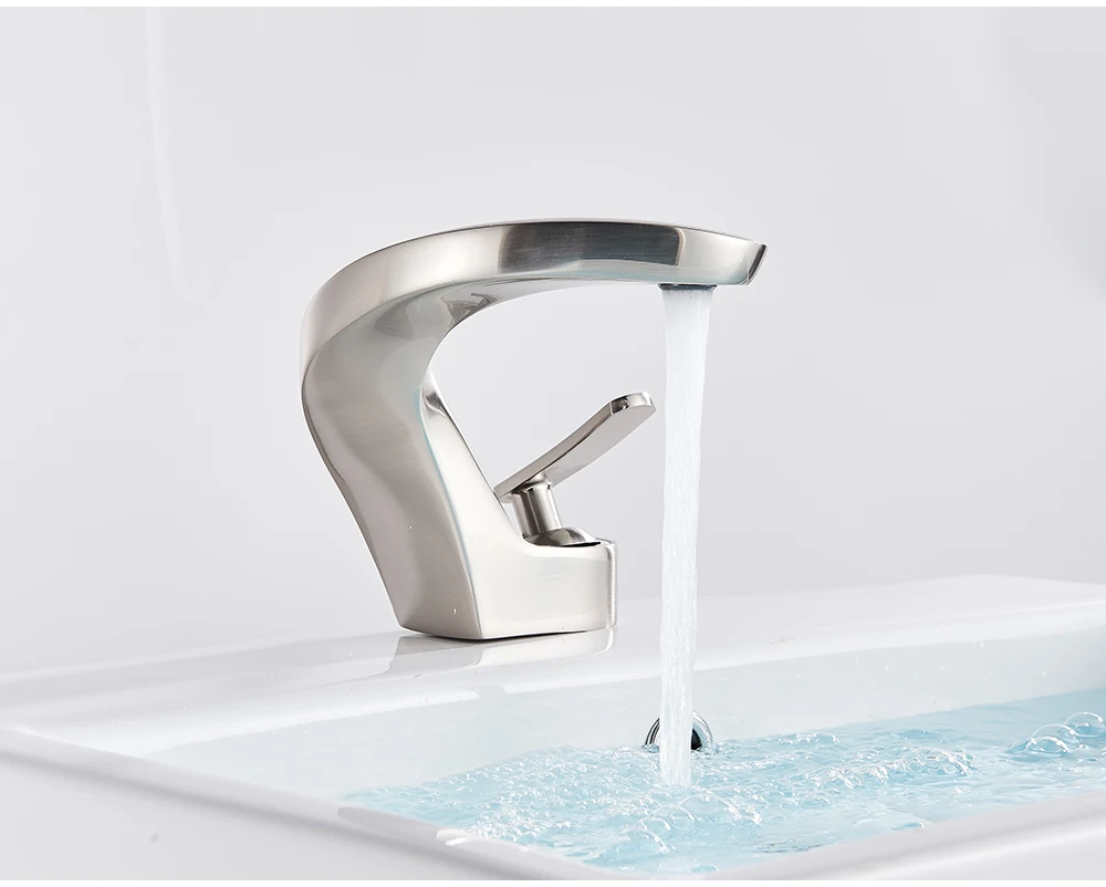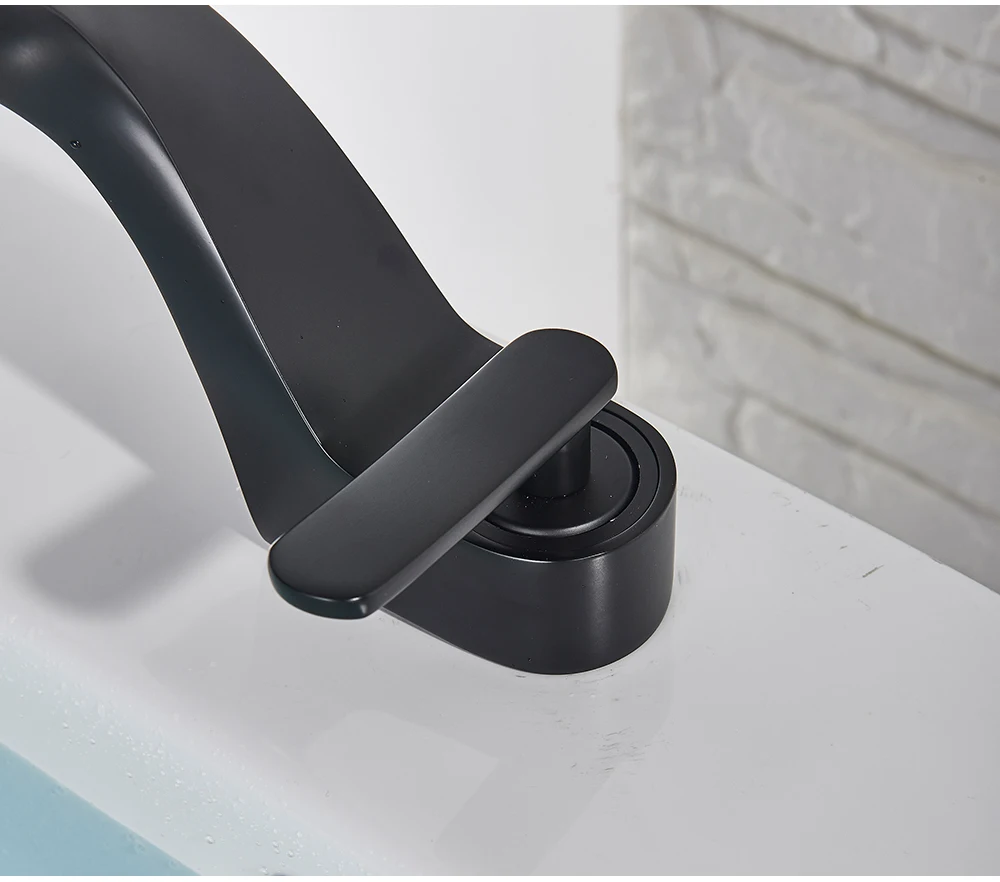 ก๊อกน้ำอ่างล้างหน้าแบบติดตั้งบนเคาน์เตอร์ สีดำด้าน วัสดุทองเหลือง ก๊อกผสมสำหรับอ่างล้างหน้า ดีไซน์มือจับเดี่ยว ก๊อกน้ำสำหรับห้องน้ำ พร้อมผิวสัมผัสแบบแปรงนิกเกิล รองรับน้ำร้อนและน้ำเย็น