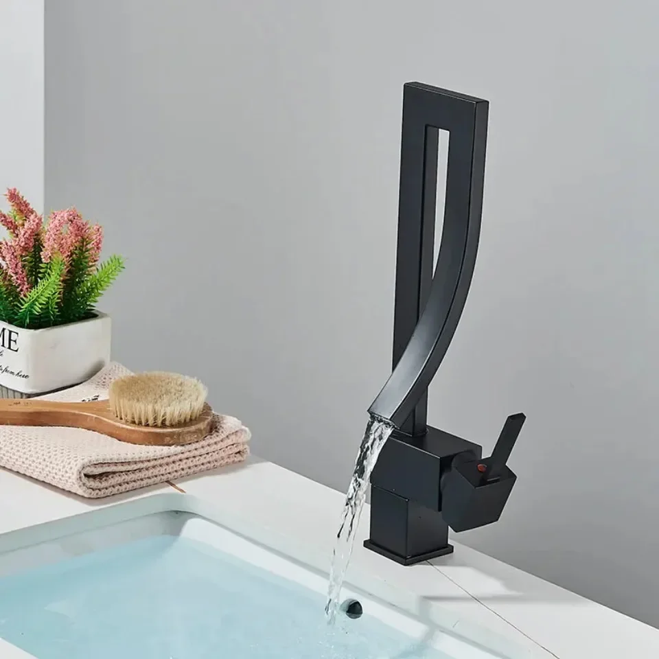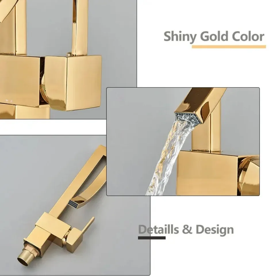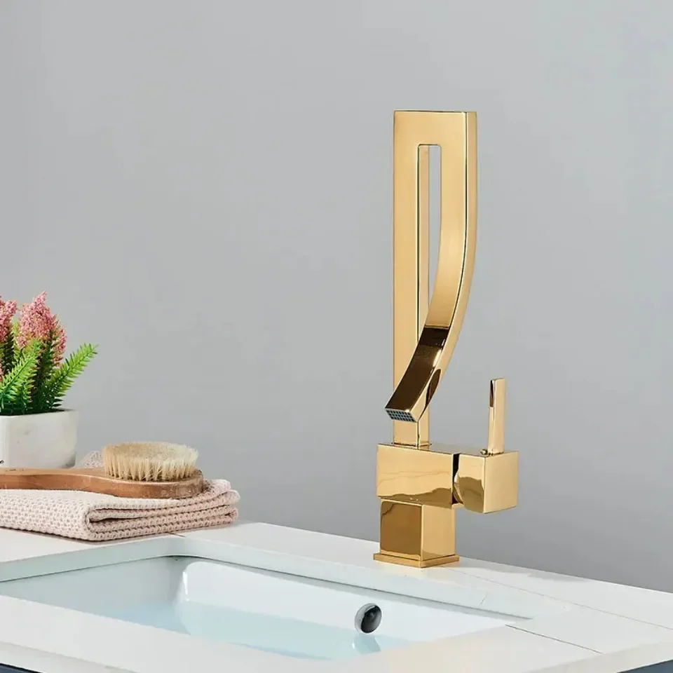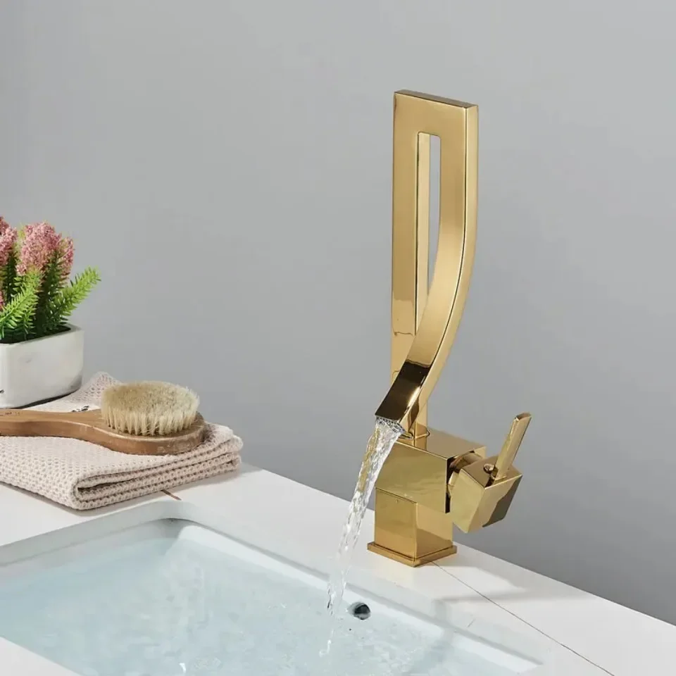 ก๊อกน้ำอ่างล้างหน้าห้องน้ำสีทองเงา แบบหมุนปรับน้ำร้อน-น้ำเย็น ก๊อกผสมสำหรับอ่างล้างหน้า วัสดุทองเหลืองชุบโครเมียมและนิกเกิลสีดำ ดีไซน์น้ำตก