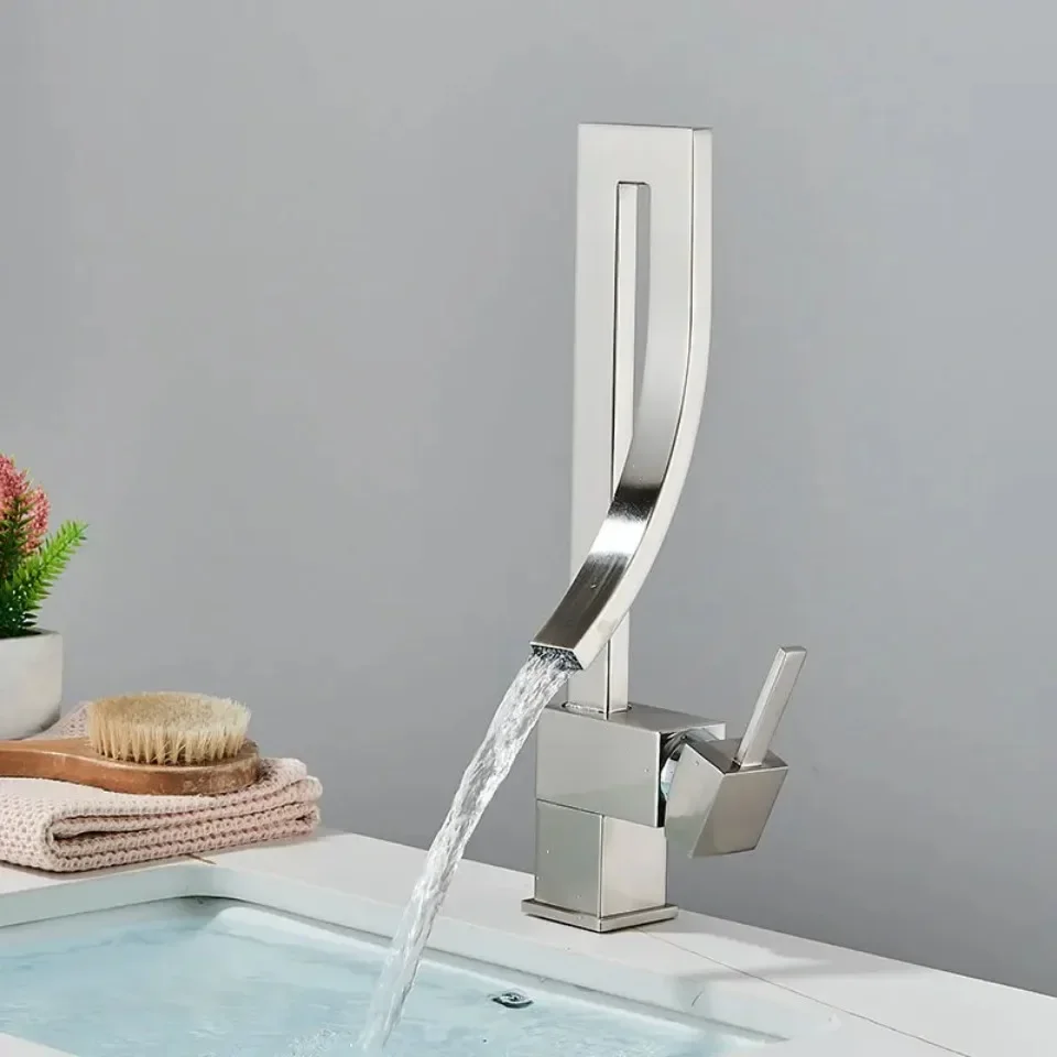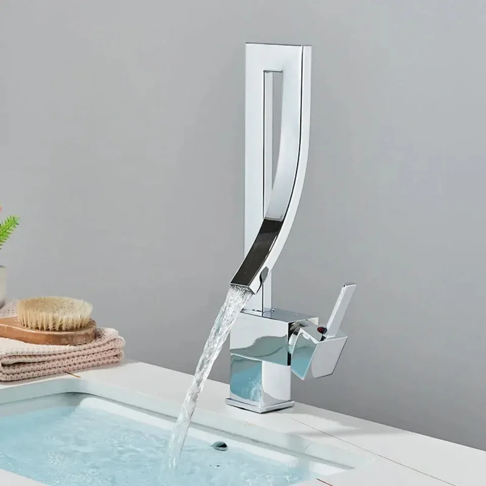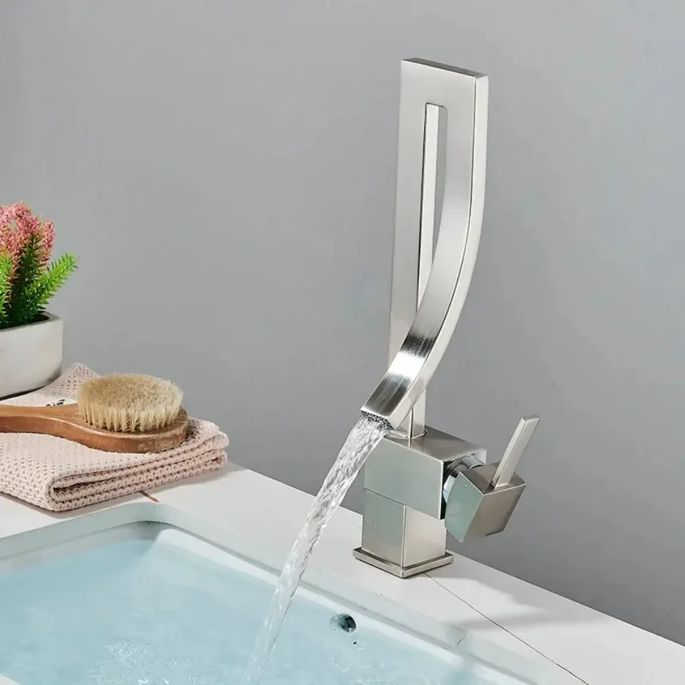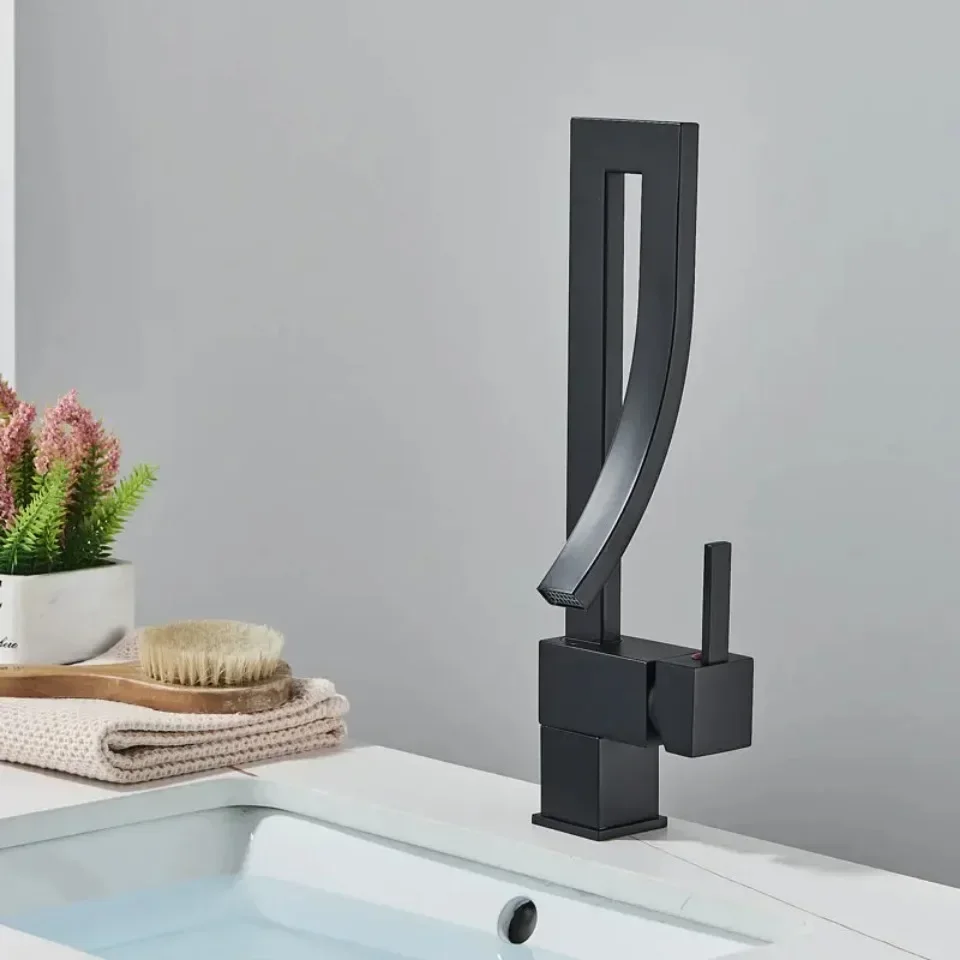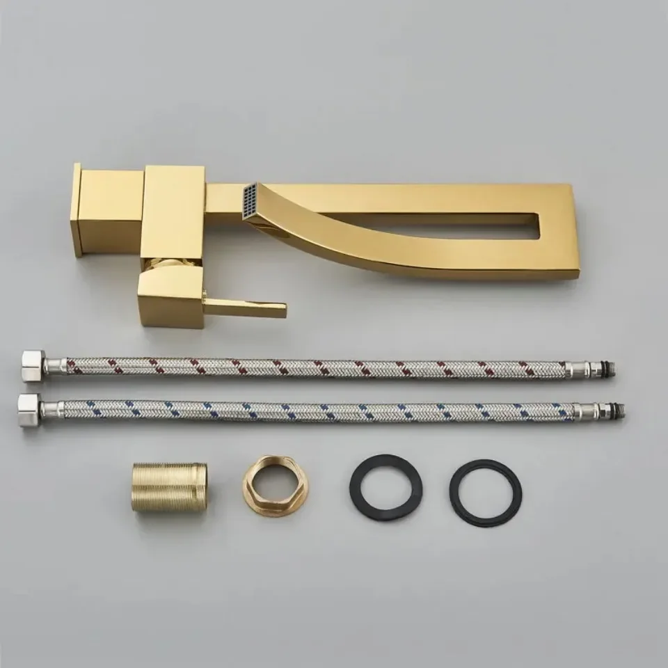 ก๊อกน้ำอ่างล้างหน้าห้องน้ำสีทองเงา แบบหมุนปรับน้ำร้อน-น้ำเย็น ก๊อกผสมสำหรับอ่างล้างหน้า วัสดุทองเหลืองชุบโครเมียมและนิกเกิลสีดำ ดีไซน์น้ำตก