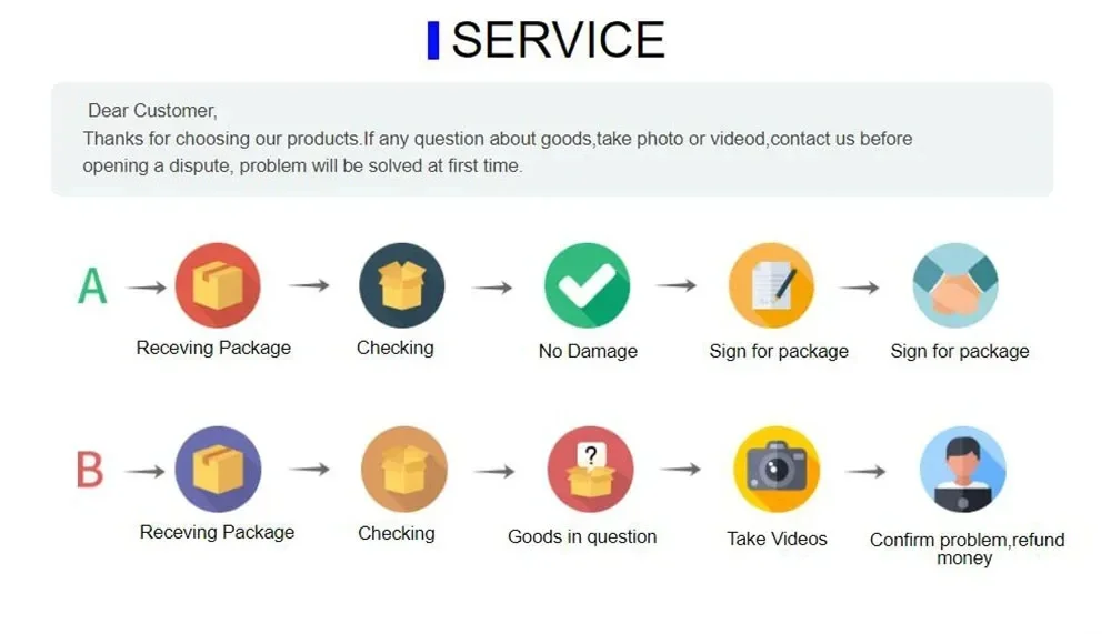 1. หากคุณได้รับพัสดุที่เสียหาย โปรดอย่าเปิดข้อพิพาทและออกความคิดเห็นเชิงลบ โปรดติดต่อเราก่อนอื่น เราจะจัดการกับมัน ไม่ต้องกังวล!