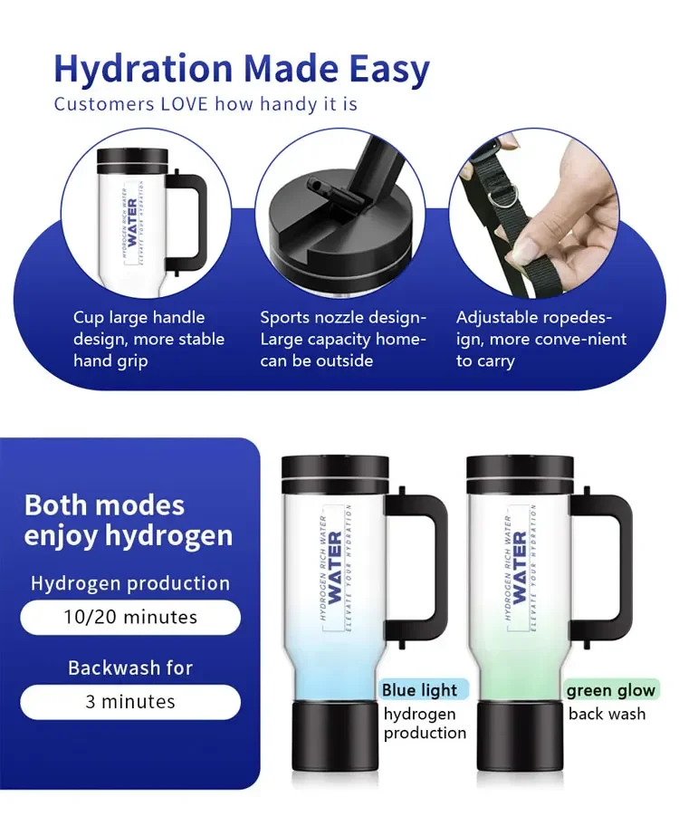 ●ปลอดภัยต่อการดื่ม 100%ความบริสุทธิ์ของไฮโดรเจนถึง 99.99%ออกซิเจน คลอรีน และโอโซนถูกแยกออกจากกันและปล่อยออกทางช่องระบายก๊าซเสียด้านล่าง แบตเตอรี่ความจุสูง 1800mAh สามารถรองรับการใช้งานการอิเล็กโทรไลซิสได้มากกว่าผลิตภัณฑ์อื่นถึงสองเท่า