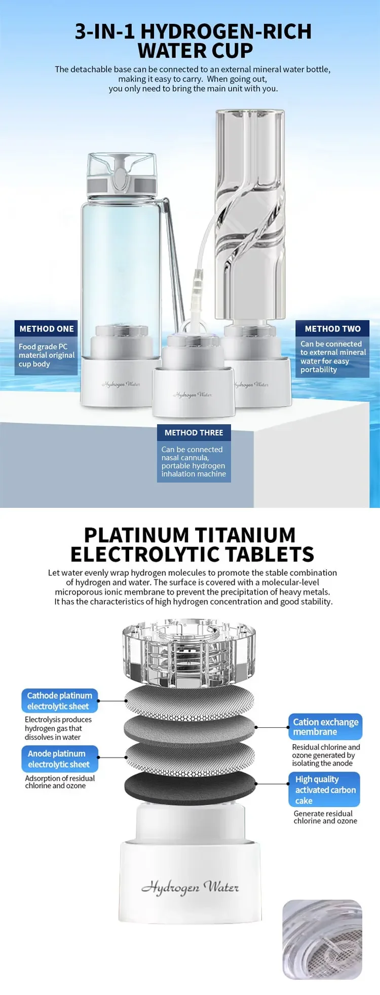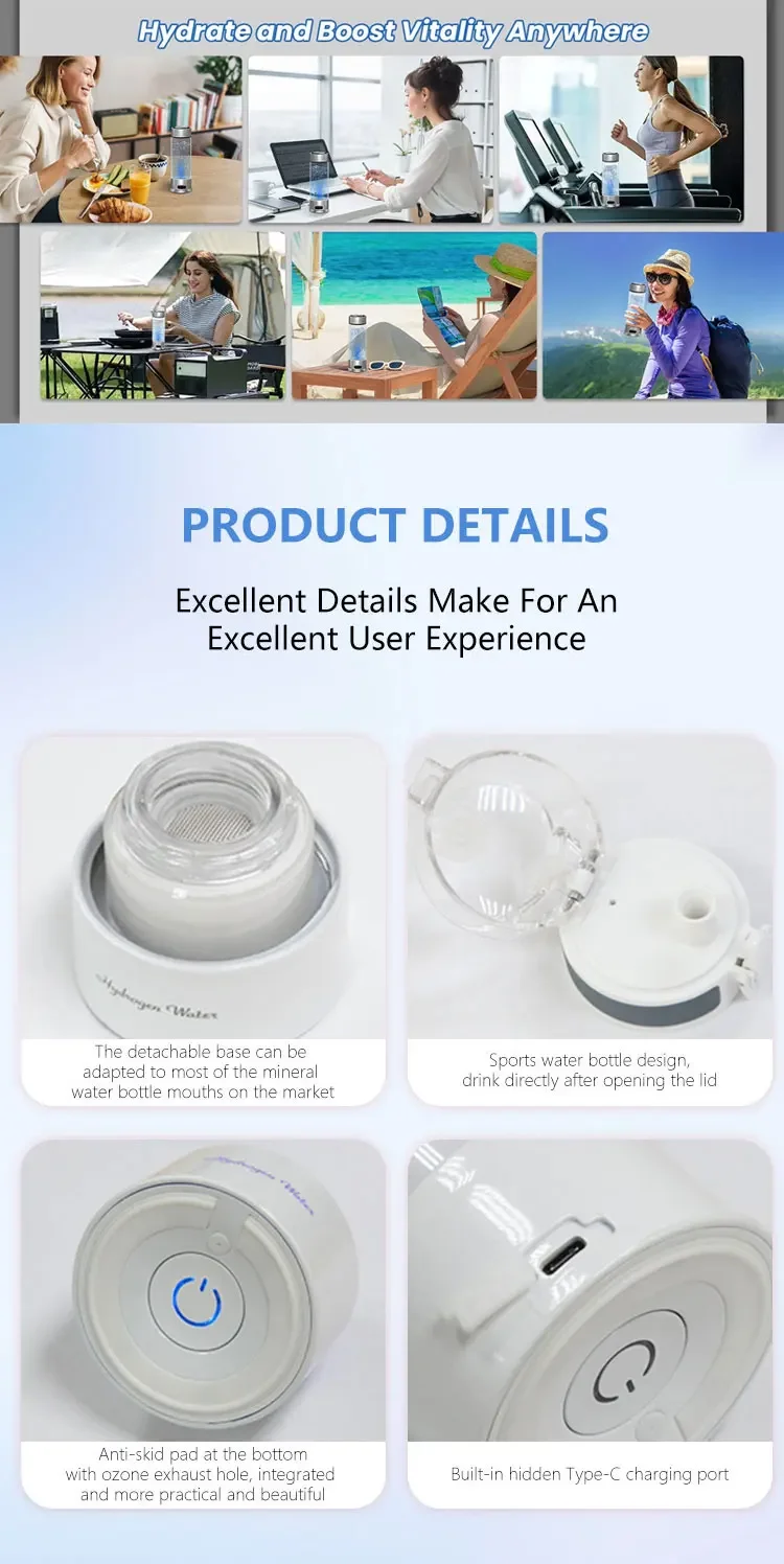 ●3 วิธีการใช้งานการออกแบบสามารถต่อเข้ากับขวดน้ำแร่ได้โดยตรง สามารถดูดซับไฮโดรเจนที่บ้าน พกพาสะดวกสำหรับการเดินทาง ทำงาน และสำนักงาน