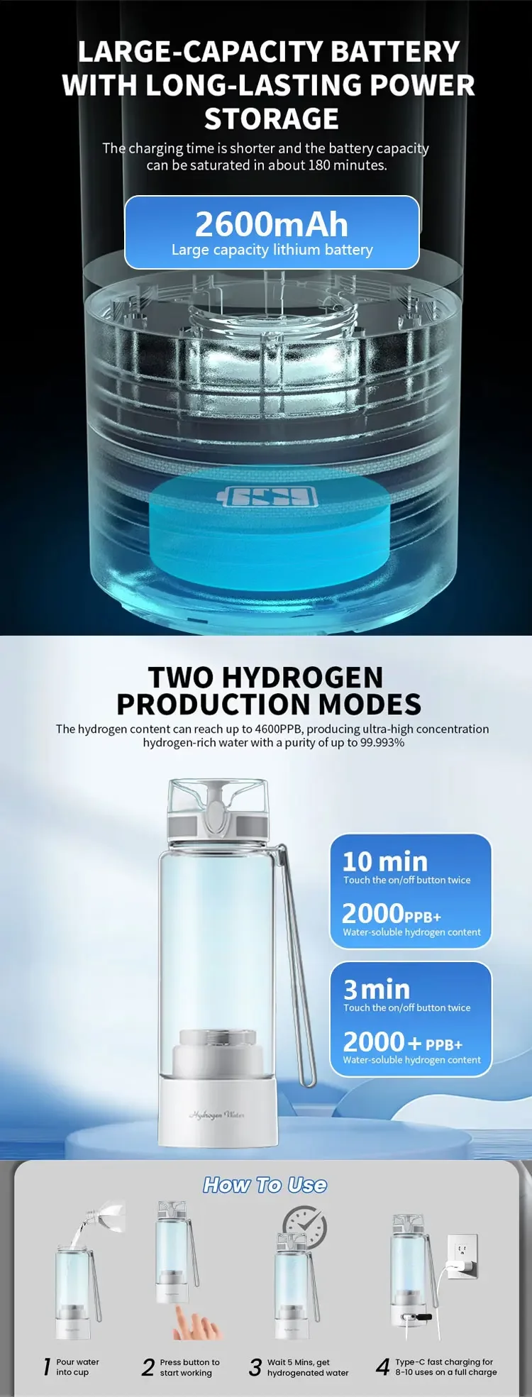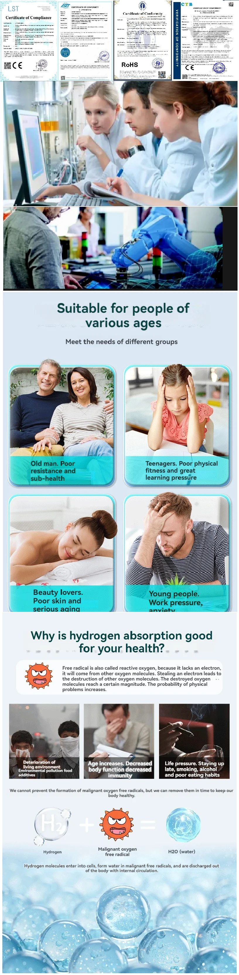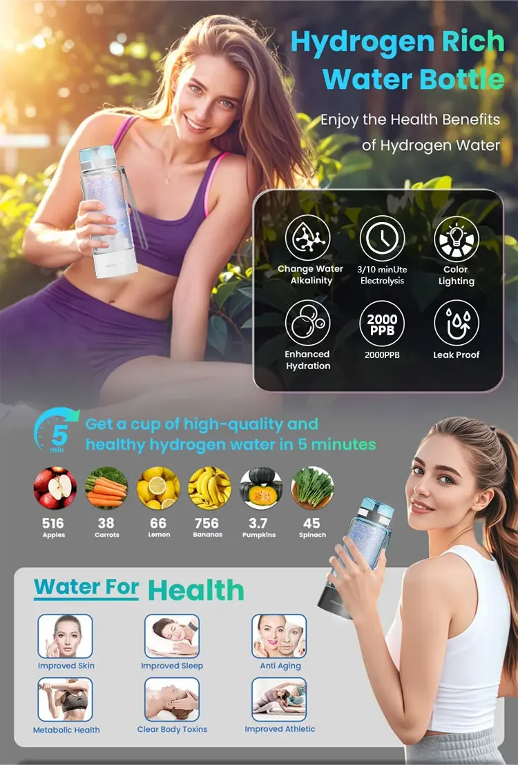 ●ปลอดภัยต่อการดื่ม 100%ความบริสุทธิ์ของไฮโดรเจนถึง 99.99%ออกซิเจน คลอรีน และโอโซนถูกแยกออกจากกันและปล่อยออกทางช่องระบายก๊าซเสียด้านล่าง แบตเตอรี่ความจุสูง 1800mAh สามารถรองรับการใช้งานการอิเล็กโทรไลซิสได้มากกว่าผลิตภัณฑ์อื่นถึงสองเท่า