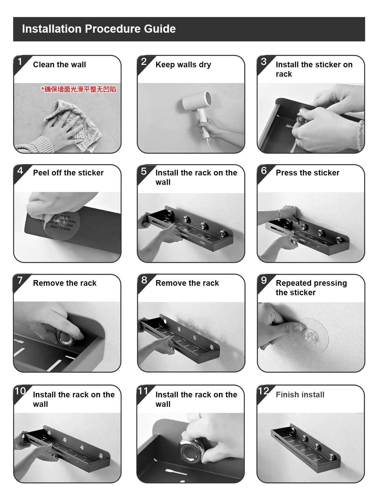 ชั้นวางนี้มีขั้นตอนการติดตั้งแบบไม่ต้องเจาะ ทำให้ติดตั้งได้ง่ายโดยไม่ต้องใช้เครื่องมือใดๆ