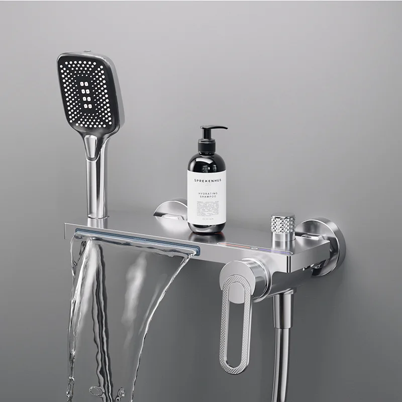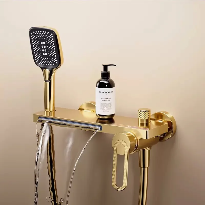 ทองอ่างอาบน้ําก๊อกน้ําติดผนังน้ําตกขนาดใหญ่และชั้นเก็บมัลติฟังก์ชั่อ่างอาบน้ําฝักบัวมือถือสําหรับห้องน้ํา