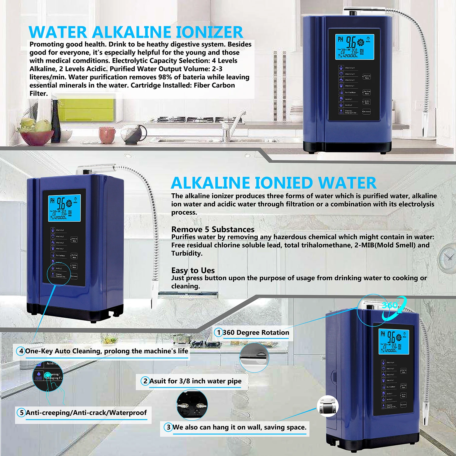 คุณสมบัติเพิ่มเติม: รองรับแรงดันไฟฟ้า 100-240V ใช้งานได้กับทุกแหล่งจ่ายไฟ / ผลิตน้ำที่มีค่า pH ระหว่าง 3.5 ถึง 10.5 / ระดับ ORP ระหว่าง +600 ถึง -500mV / รองรับค่า TDS ในน้ำตั้งแต่ 50 ถึง 1000PPM / หน้าจอ LCD สีขนาดใหญ่พิเศษ 3.8 นิ้ว