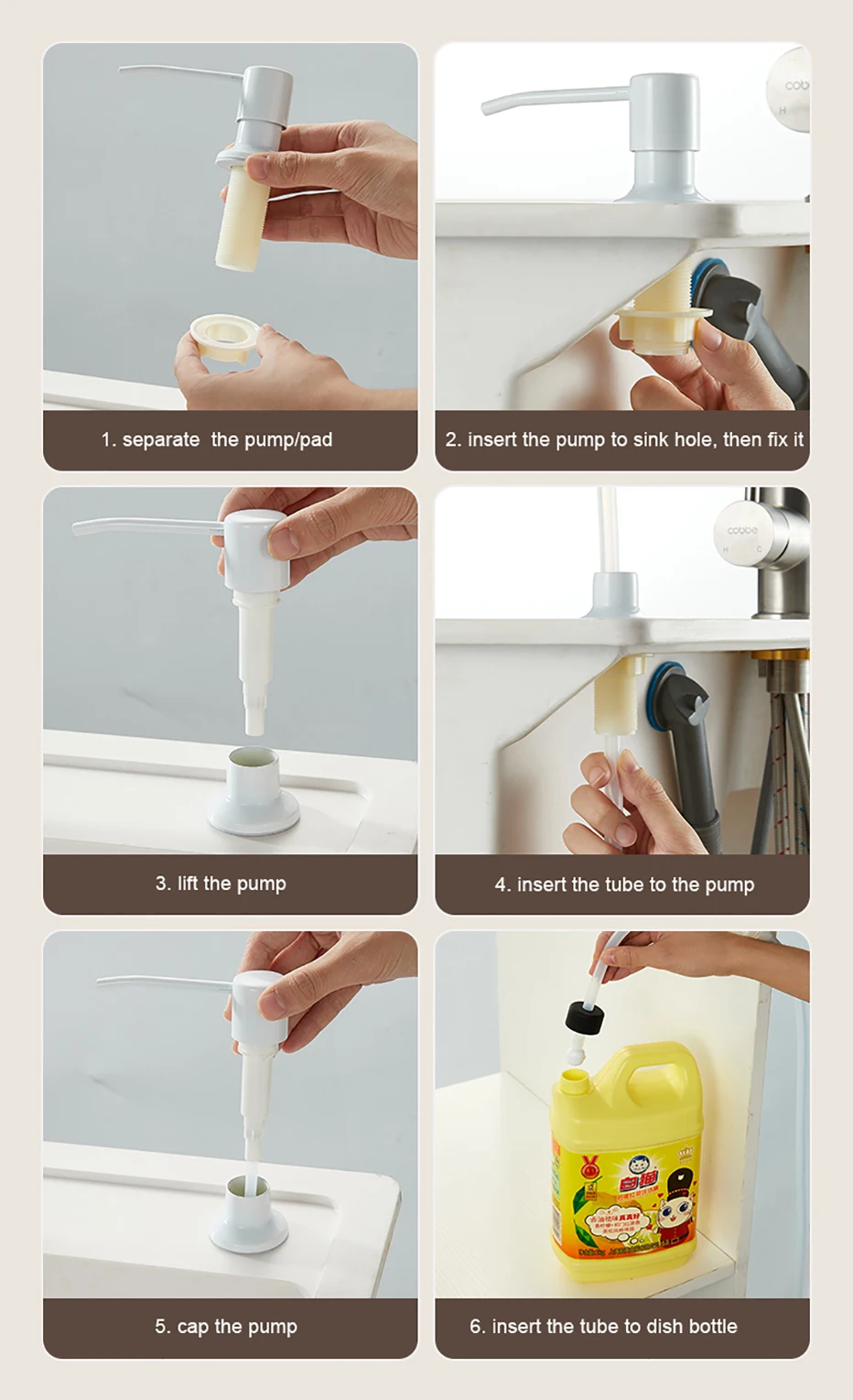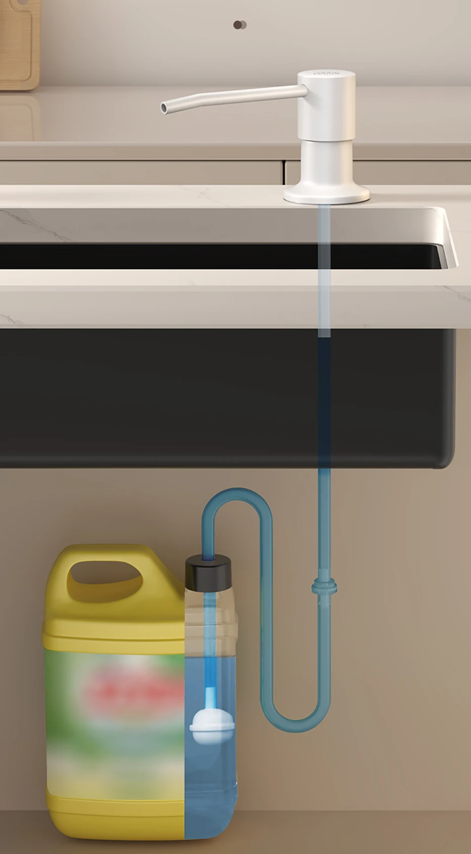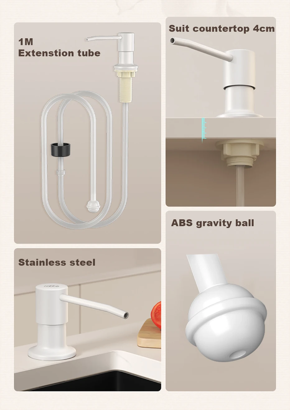 เครื่องจ่ายสบู่เหลวในครัวแบบใช้ซ้ําได้เคาน์เตอร์การออกแบบในตัวภาชนะสบู่มือกดเครื่องจ่ายสบู่เหลวพร้อมท่อขยาย