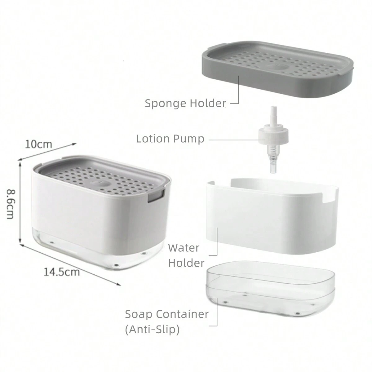 -กดลงบนจานด้านบนของปั๊มเครื่องจ่ายสบู่เหลวได้อย่างง่ายดายด้วยที่วางฟองน้ำในอ่างล้างจานเพื่อจ่ายสบู่เหลวลงบนจานโดยตรงไปยังฟองน้ำในครัว