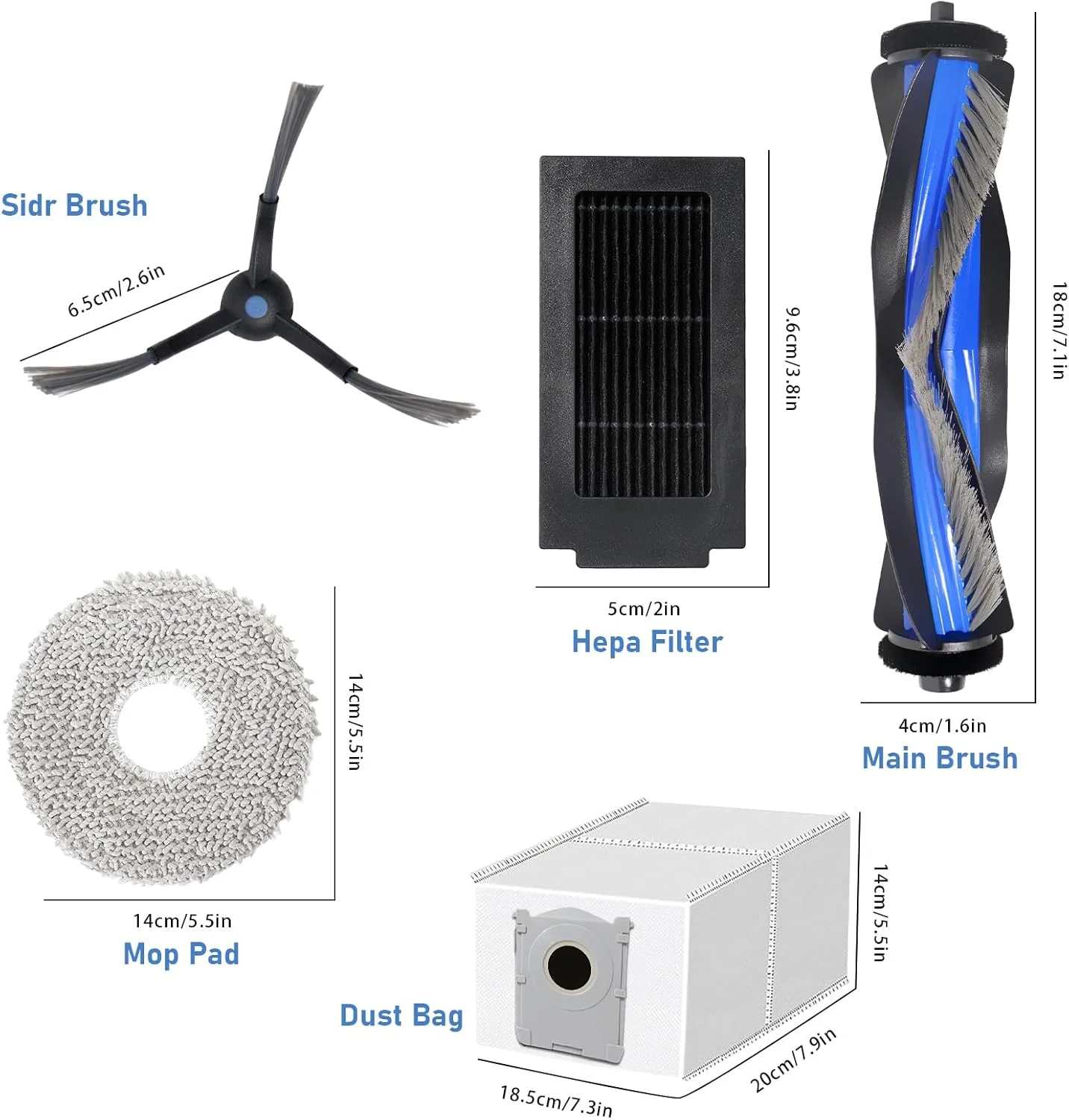 ชุดนี้ประกอบด้วยแปรงด้านข้างหลัก ผ้าถูพื้น แผ่นกรอง HEPA และถุงเก็บฝุ่น ซึ่งมีทุกสิ่งที่จำเป็นสำหรับการทำความสะอาดอย่างครอบคลุม