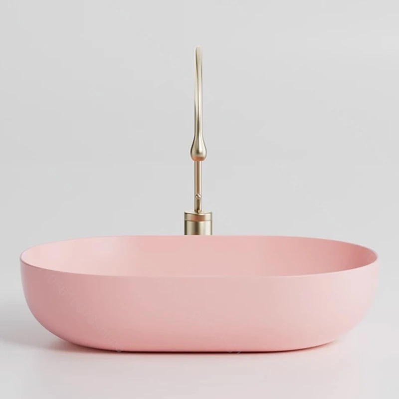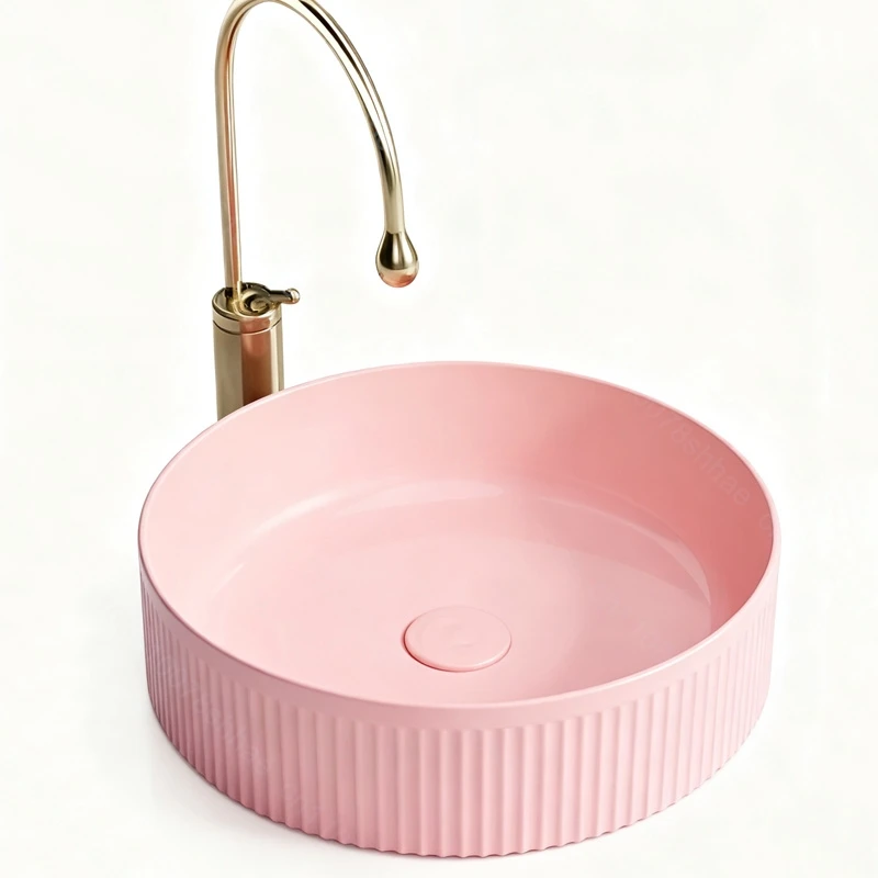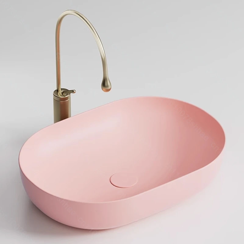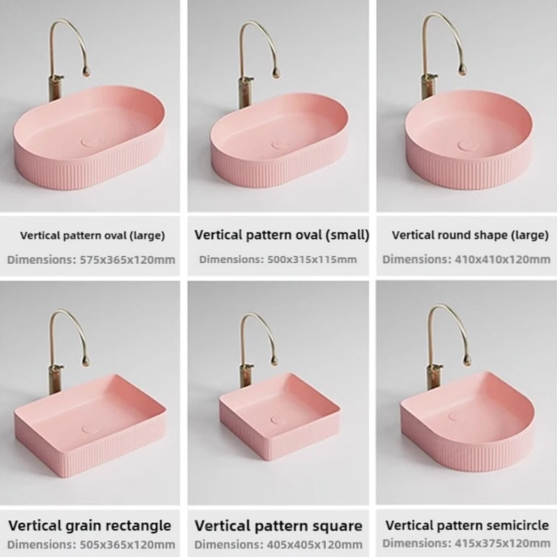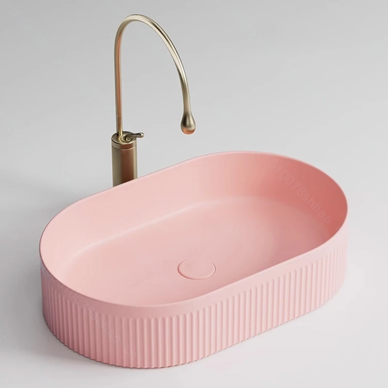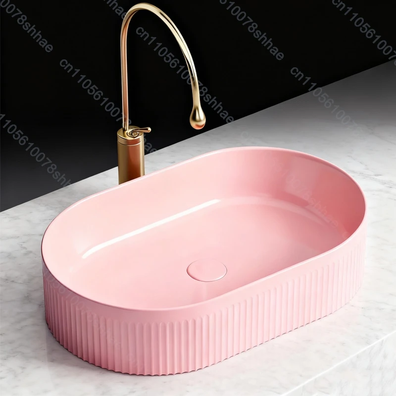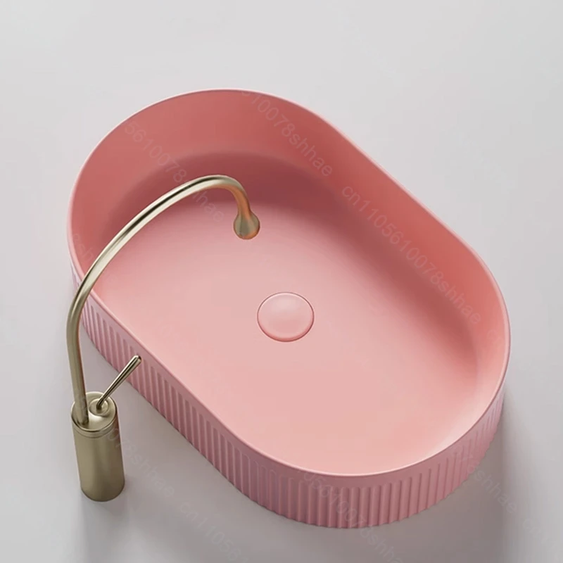 อ่างล้างหน้าเซรามิกสไตล์โมเดิร์น สีชมพู อ่างล้างหน้าสำหรับห้องน้ำ ดีไซน์ศิลปะ อ่างล้างหน้าตั้งโต๊ะพร้อมอุปกรณ์ระบายน้ำ