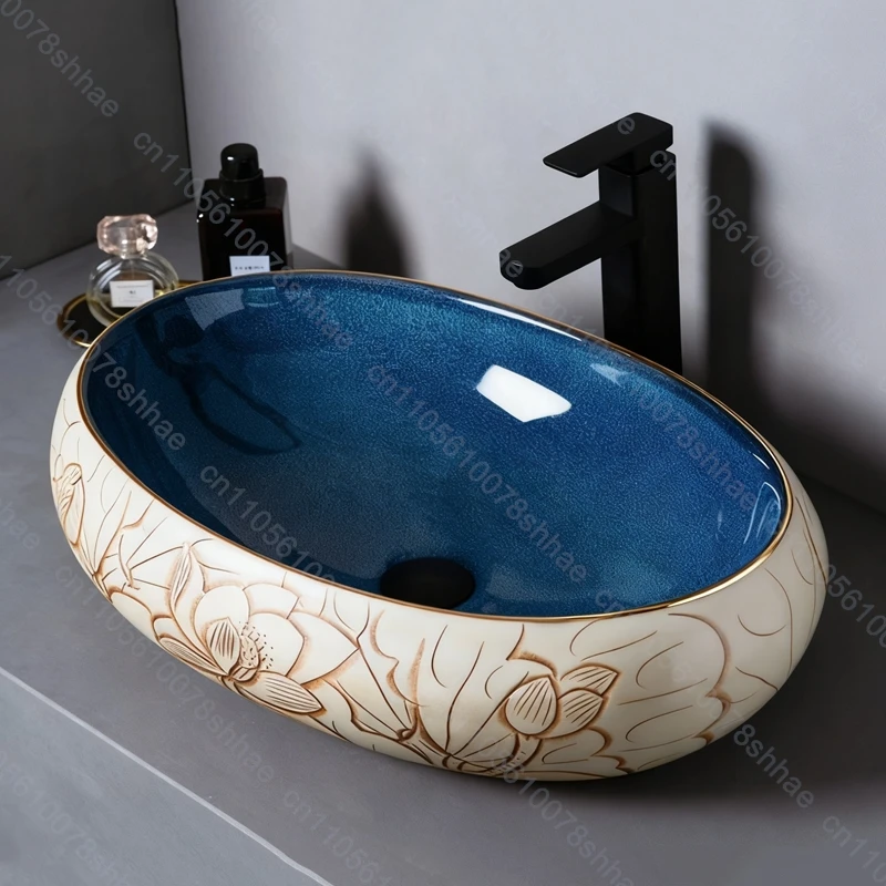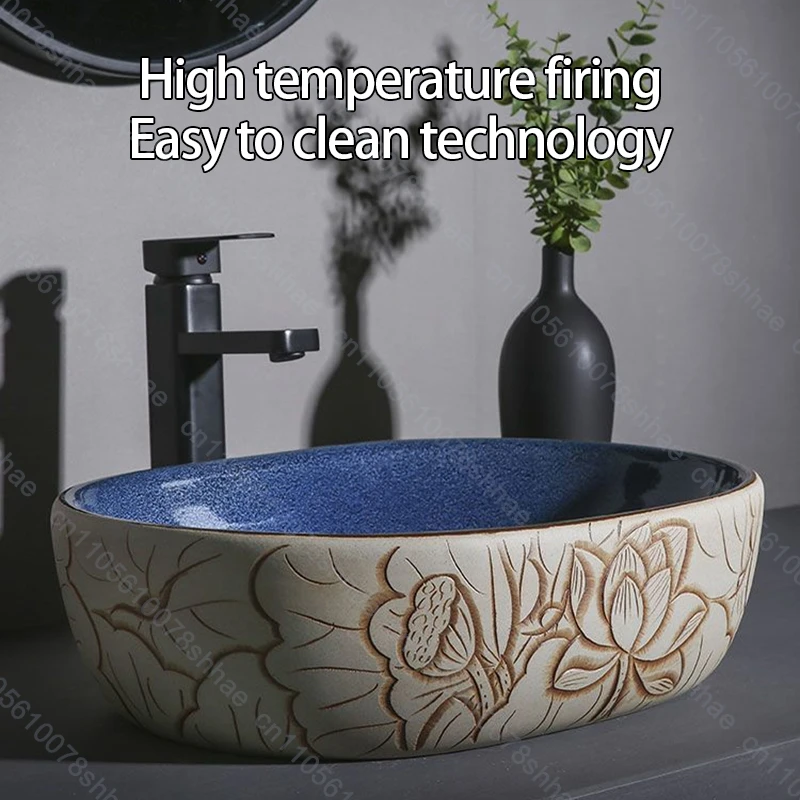 อ่างล้างหน้าเซรามิกสไตล์เรโทร อ่างล้างหน้าแบบวางบนเคาน์เตอร์ อ่างล้างหน้าดีไซน์ศิลปะสำหรับบ้าน อ่างล้างหน้าเซรามิกแบบวางบนเคาน์เตอร์ สไตล์วินเทจ