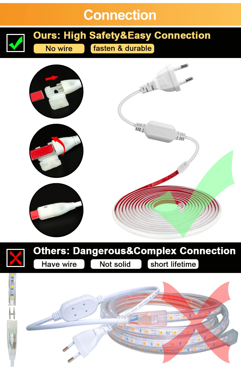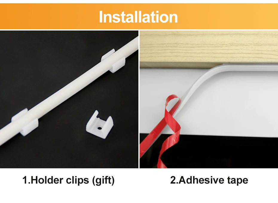 ด้านหลังของแถบไฟมีเทปที่แข็งแรงซึ่งสามารถฉีกออกได้เพื่อให้ติดตั้งง่าย นอกจากนี้คุณยังสามารถใช้คลิปยึดในการติดตั้งได้อีกด้วย