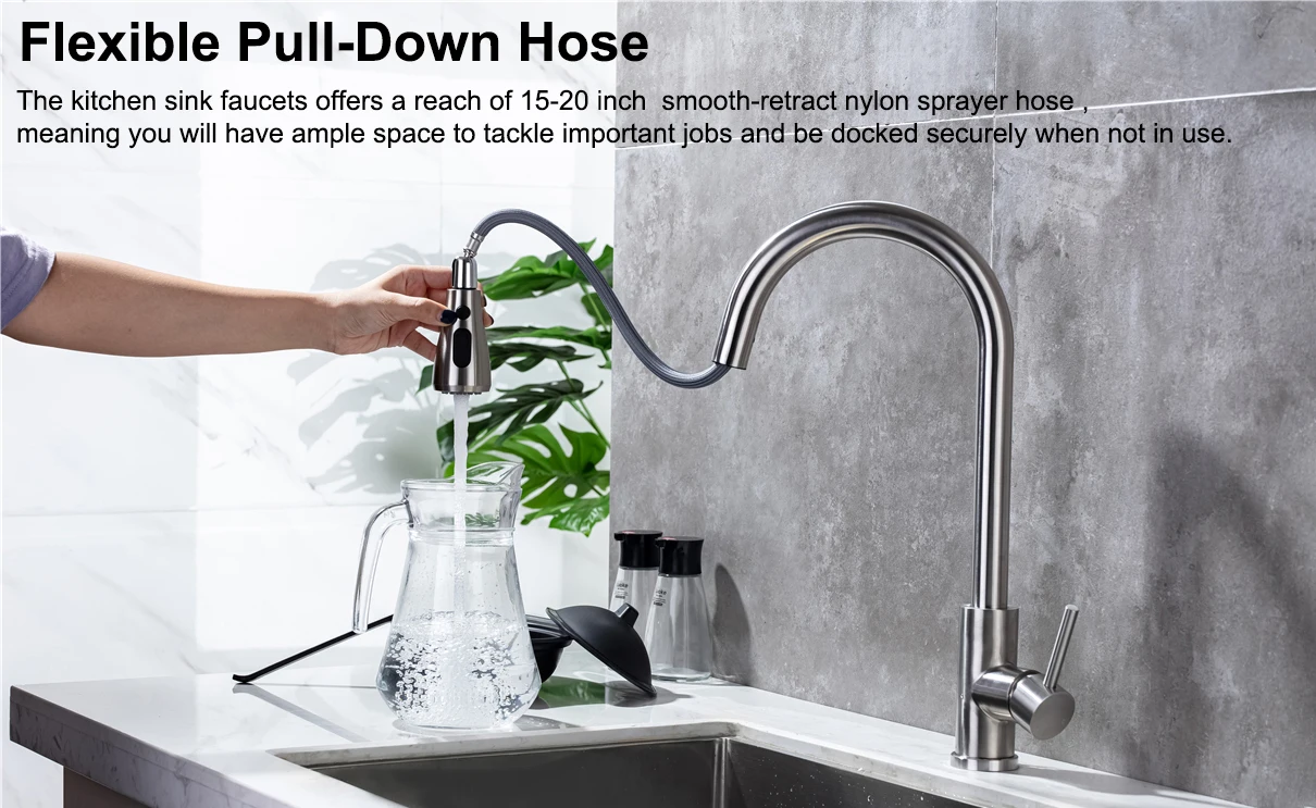 2. ☛ ทำให้การล้างของคุณง่ายขึ้น: ก๊อกน้ำในครัวแบบสัมผัสพร้อมฟังก์ชันคู่ ทั้งโหมดน้ำไหลแบบเติมอากาศและโหมดสเปรย์แรงดันสูงเมื่อคุณพบปัญหาการไหลของน้ำต่ำ ฟังก์ชันสเปรย์เสริมจะช่วยเพิ่มอัตราการไหลได้ถึง 70% ทำให้คุณสามารถล้างจานและเติมน้ำในภาชนะได้อย่างรวดเร็วและสะดวกสบายก๊อกน้ำอัจฉริยะสำหรับห้องครัว พร้อมสายยางยืดหดได้ยาว 20 นิ้ว ช่วยเพิ่มความคล่องตัวในการใช้งาน ทำให้งานบ้านประจำวันของคุณง่ายขึ้น