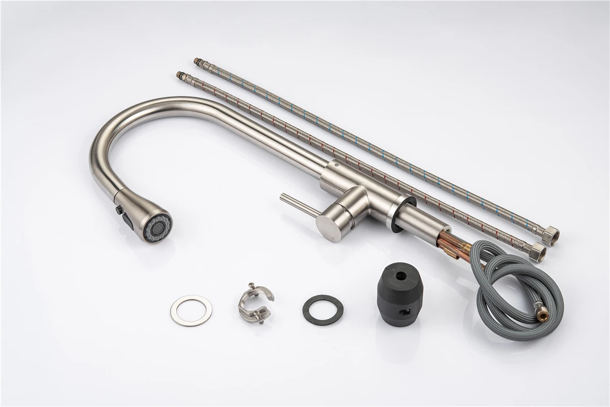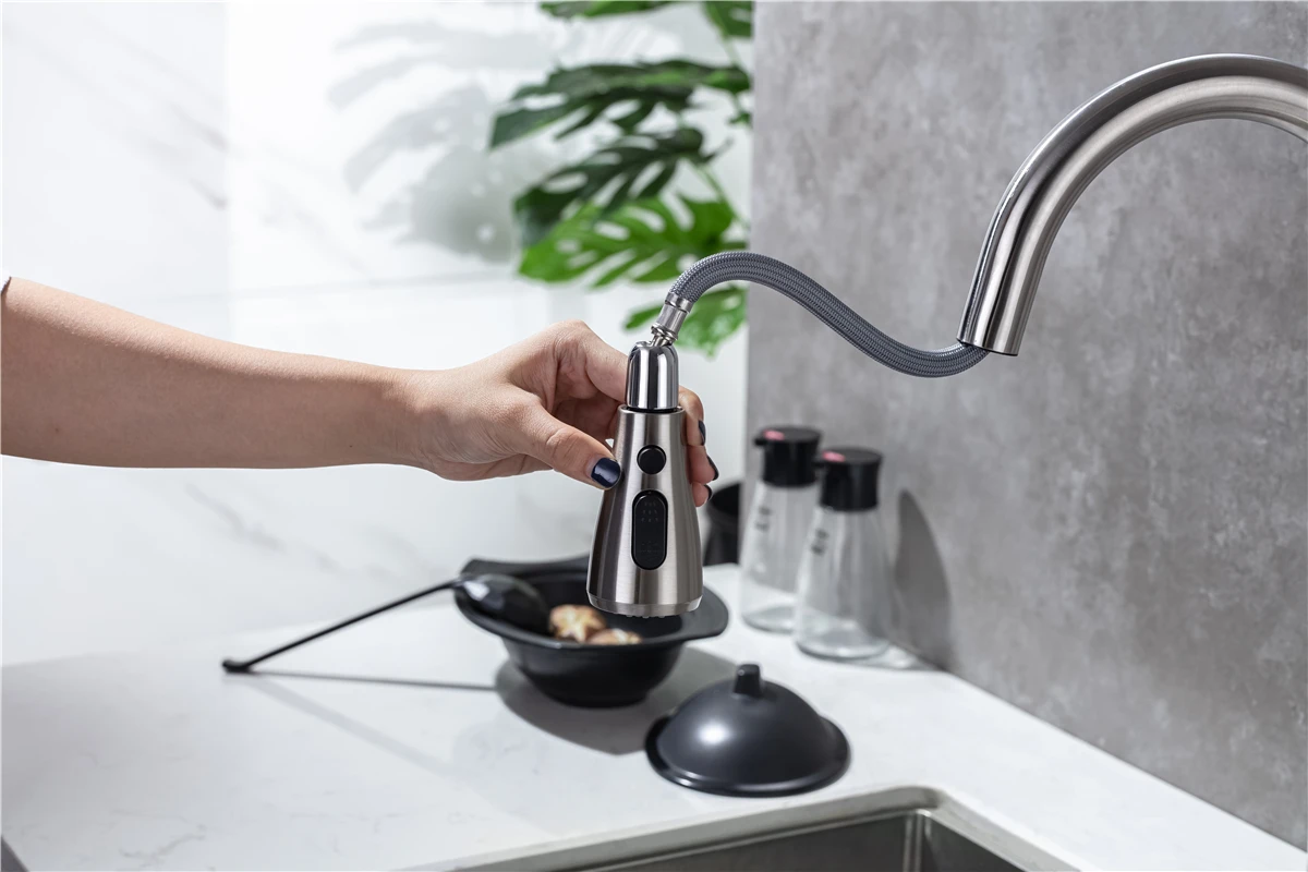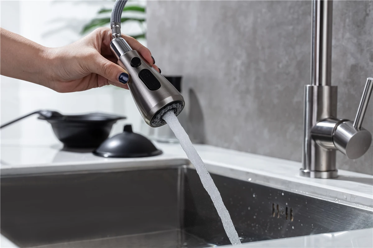 4. ☛ หัวฉีดแบบดึงออก: หัวฉีดและหัวพ่นหมุนได้ 360 องศา, หัวพ่นแบบโค้งสูงหมุนได้ 360 องศา สามารถให้การล้างอ่างล้างจานได้รอบด้าน, ก๊อกน้ำแบบมือจับเดี่ยวสามารถควบคุมอุณหภูมิและปริมาณน้ำได้สะดวกยิ่งขึ้นก๊อกน้ำอเนกประสงค์สำหรับอ่างล้างจานช่วยอำนวยความสะดวกในงานต่างๆ ภายในพื้นที่ครัว