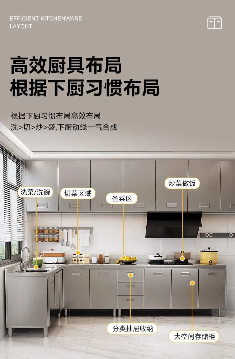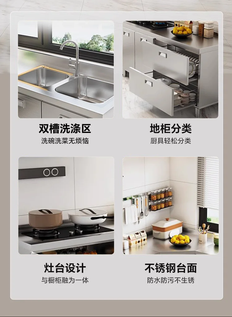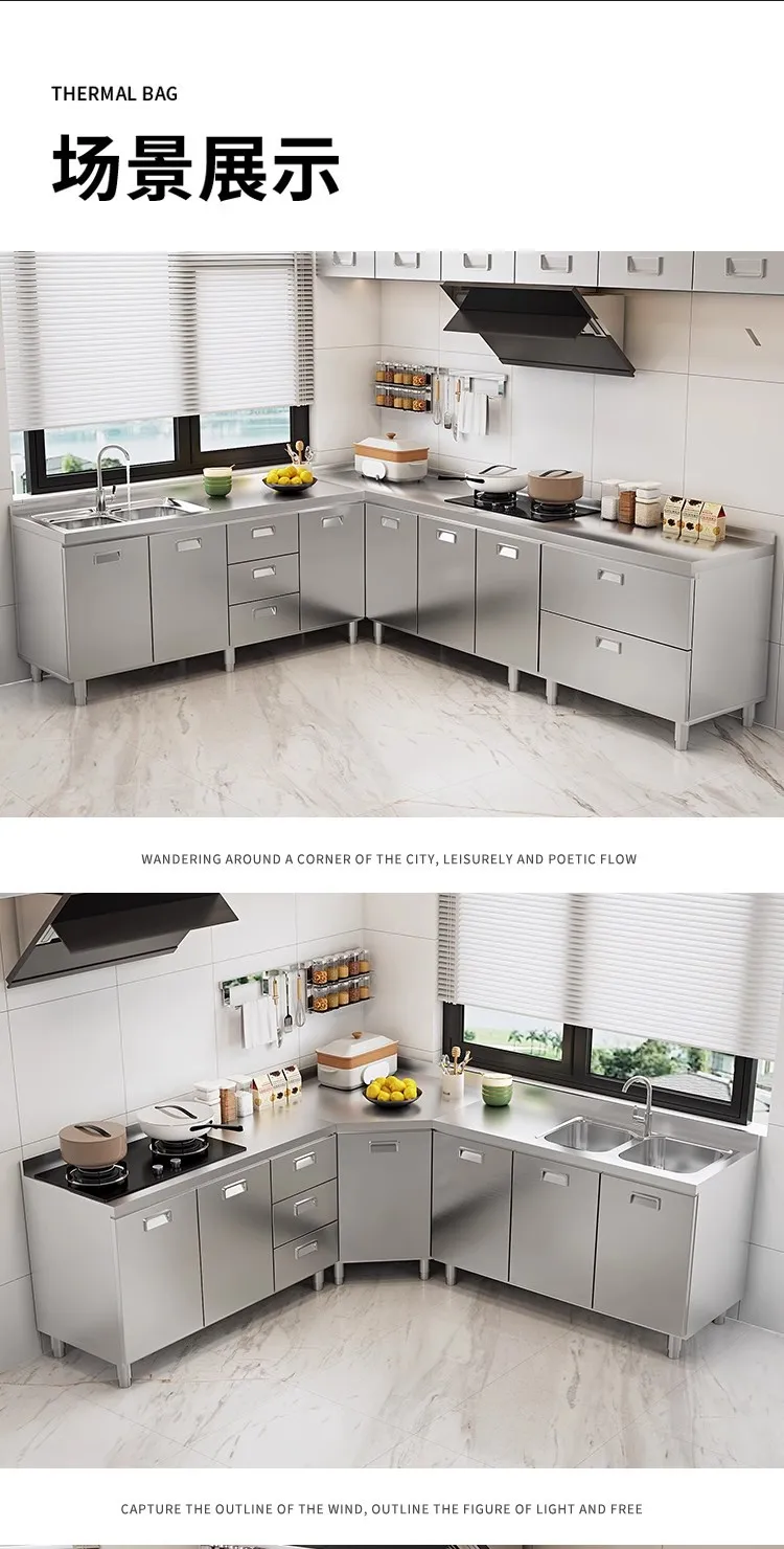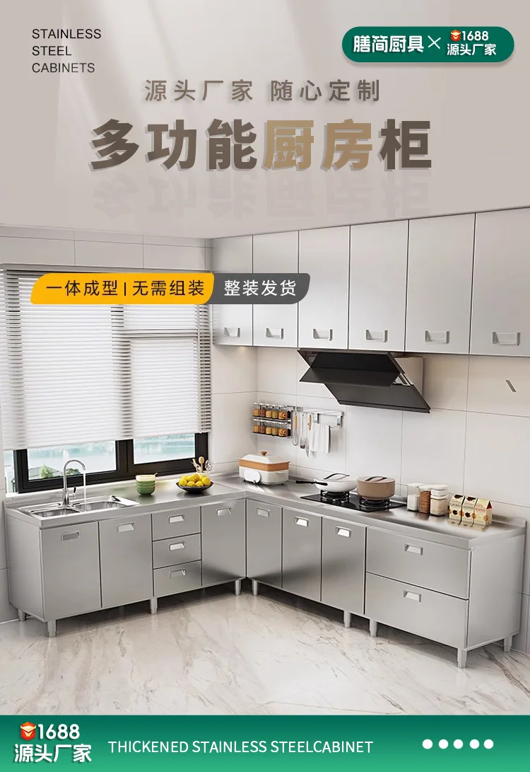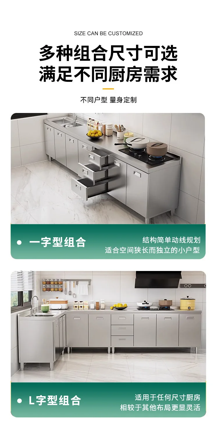 แหล่งที่มาโรงงานห้องครัวตู้ครัวสแตนเลสแบบบูรณาการ 304 เคาน์เตอร์รวมในครัวเรือนตู้สําเร็จรูปเช่าเตา