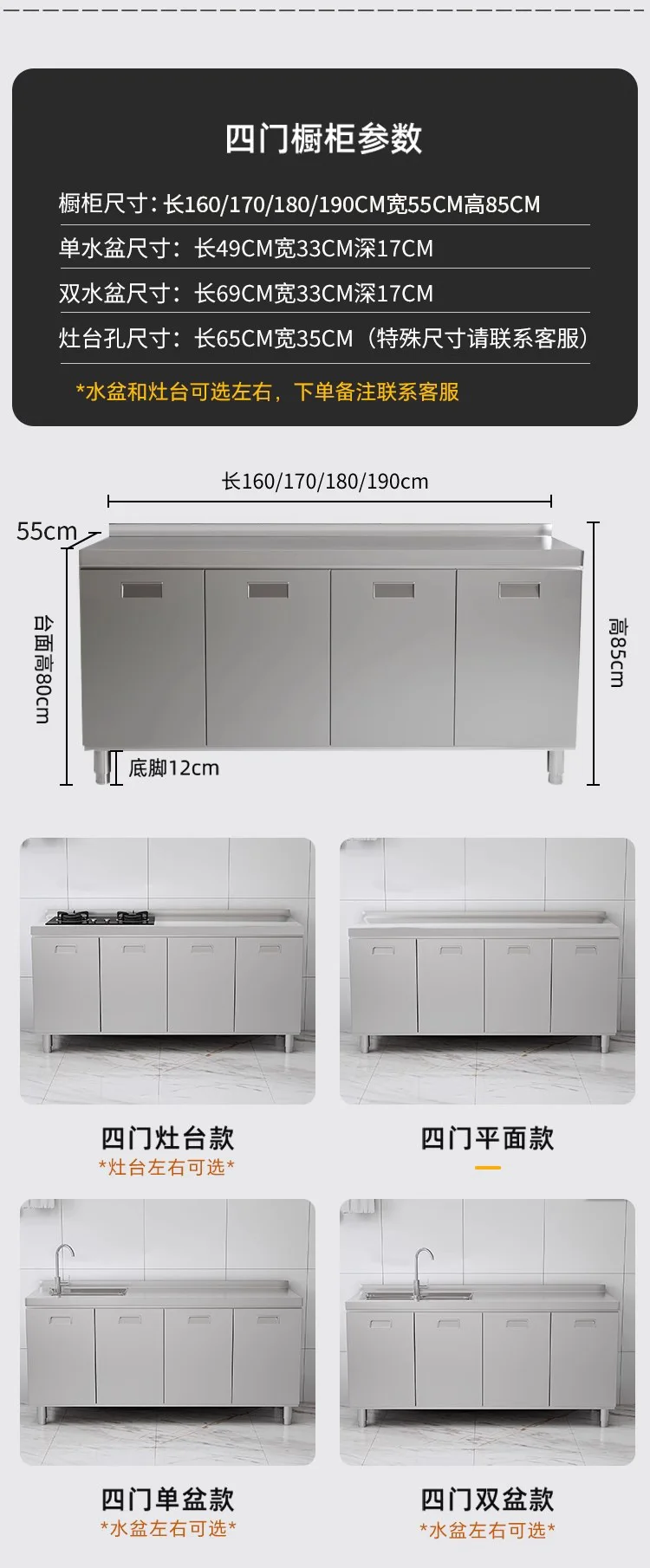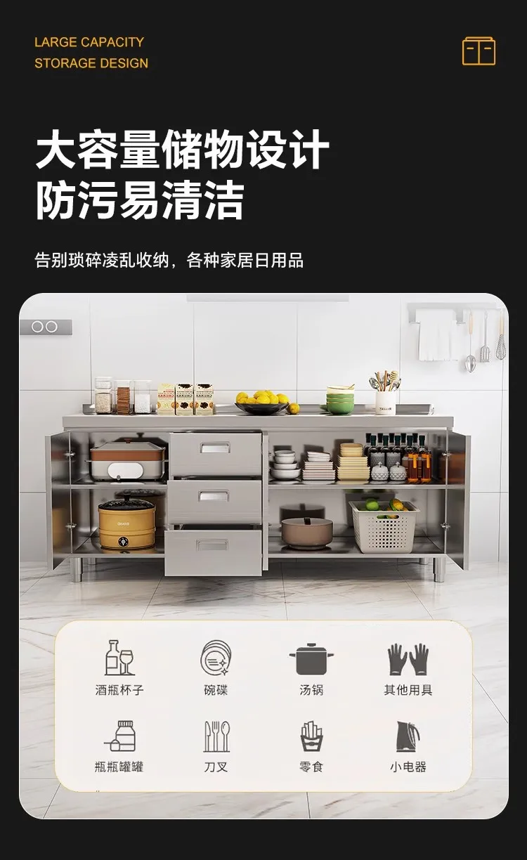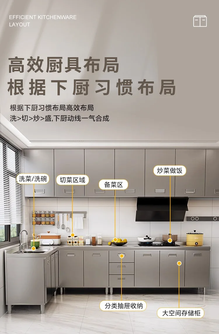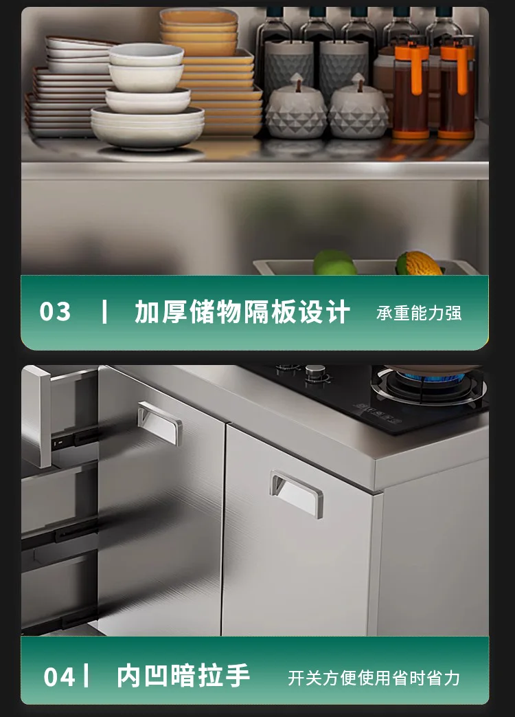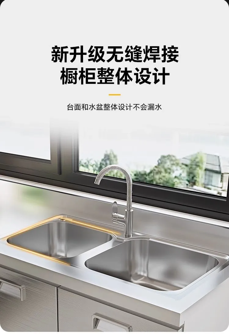 แหล่งที่มาโรงงานห้องครัวตู้ครัวสแตนเลสแบบบูรณาการ 304 เคาน์เตอร์รวมในครัวเรือนตู้สําเร็จรูปเช่าเตา