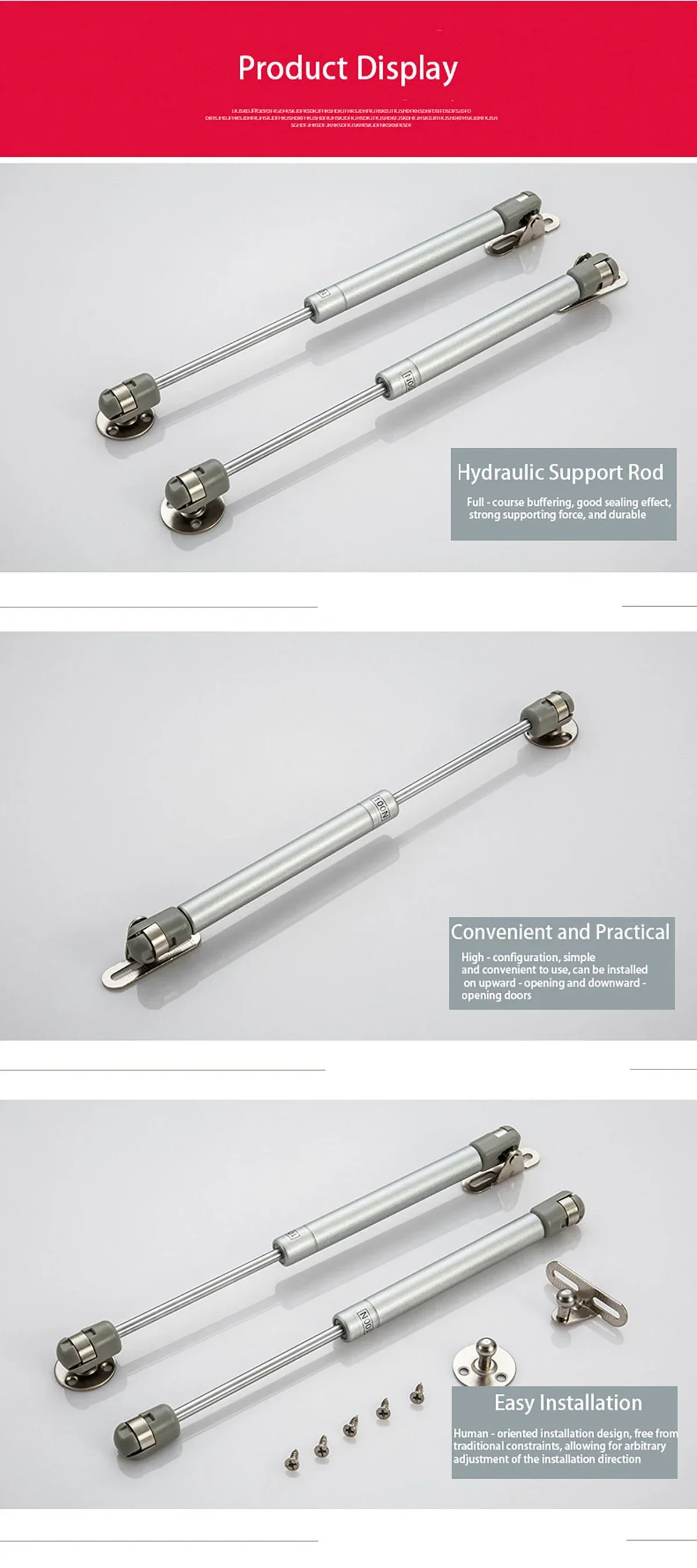 Keep the cabinet door in 90 degrees open position, let the pneumatic lower support extend freely, and then fix the support rod on the edge of the cabinet door.