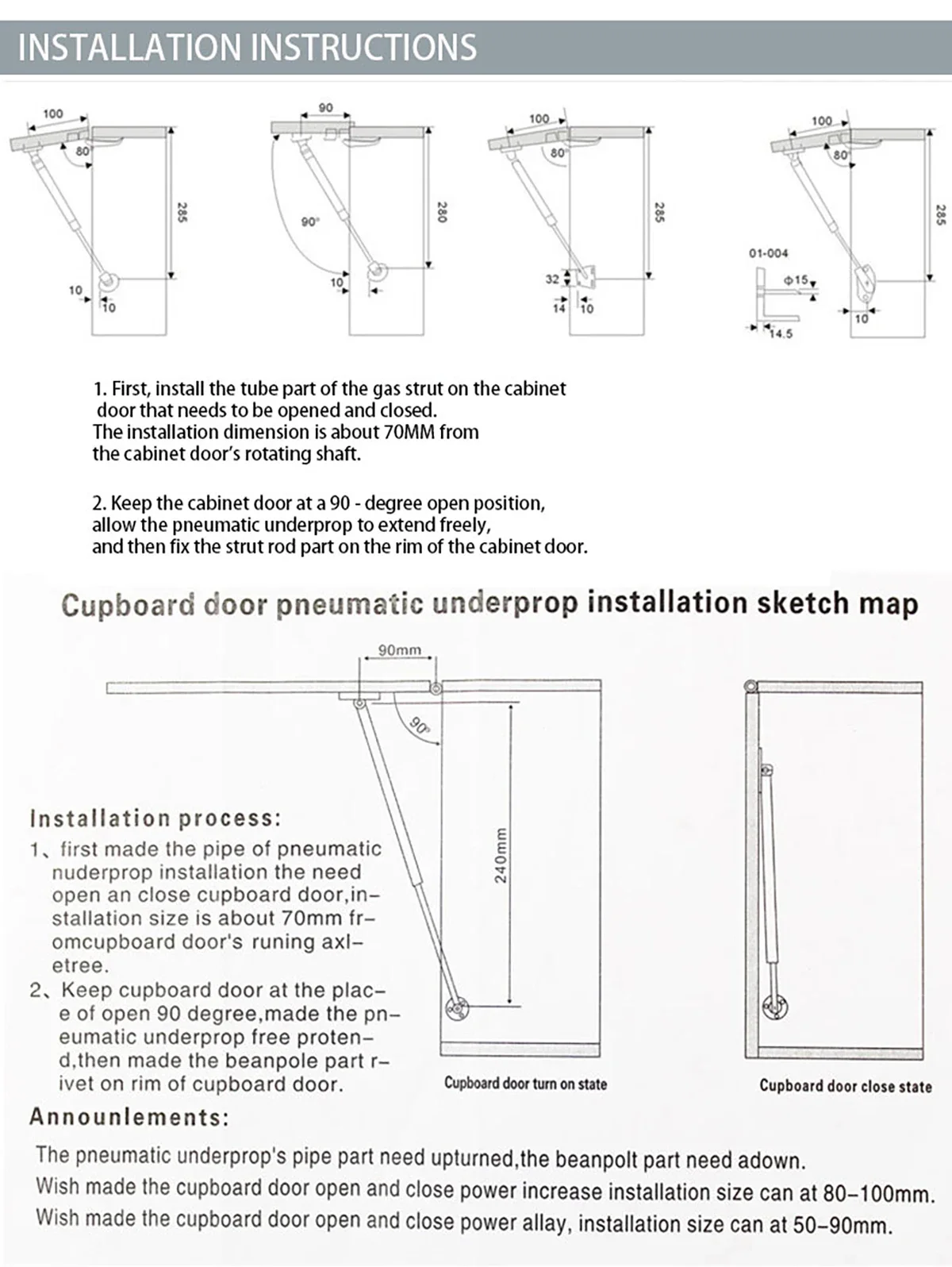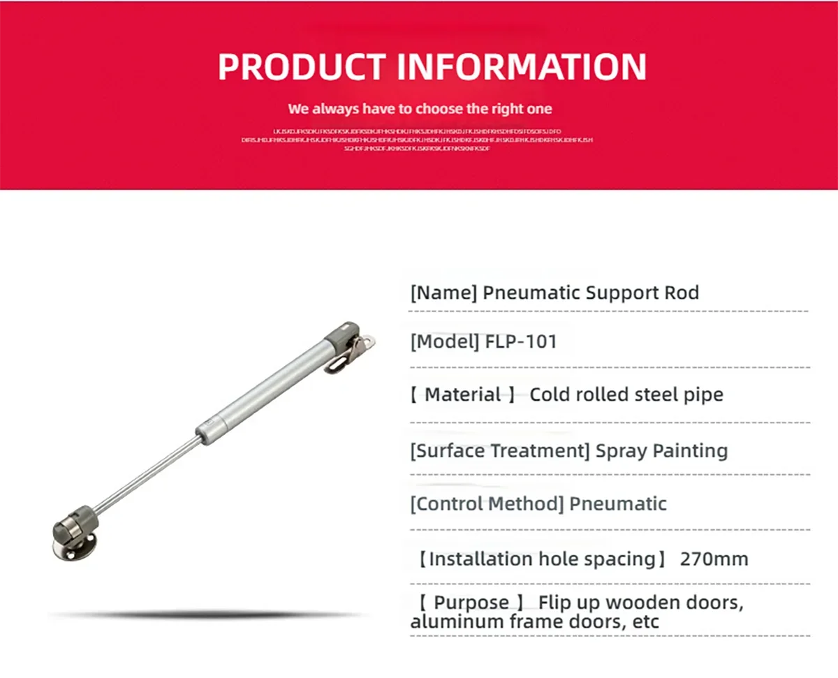 First install the gas support tube on the cabinet door to be opened and closed, the installation size is about 70MM from the rotating axis of the cabinet door.