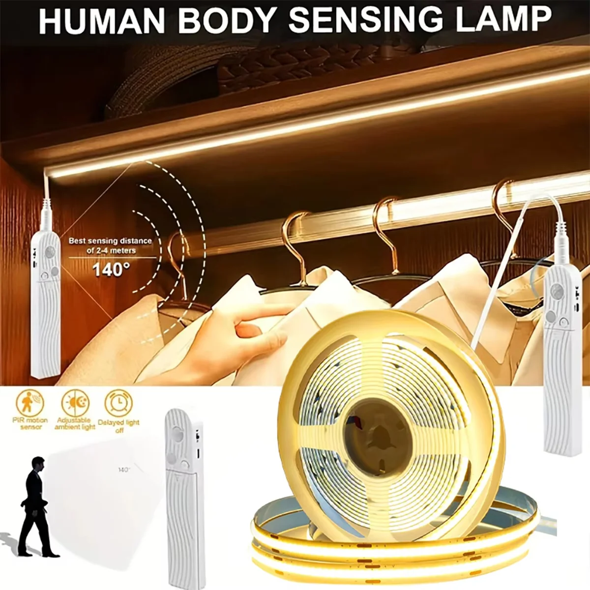 มาพร้อมกับแถบไฟ LED COB 1 ชิ้น + ตัวควบคุมเซ็นเซอร์ตรวจจับความเคลื่อนไหว 1 ชิ้น ใช้พลังงานจากแบตเตอรี่ AAA 4 ก้อน (ไม่รวมในชุด)ไม่ต้องเดินสายไฟ เหมาะอย่างยิ่งสำหรับการติดตั้งไฟแบบพกพาและยืดหยุ่น