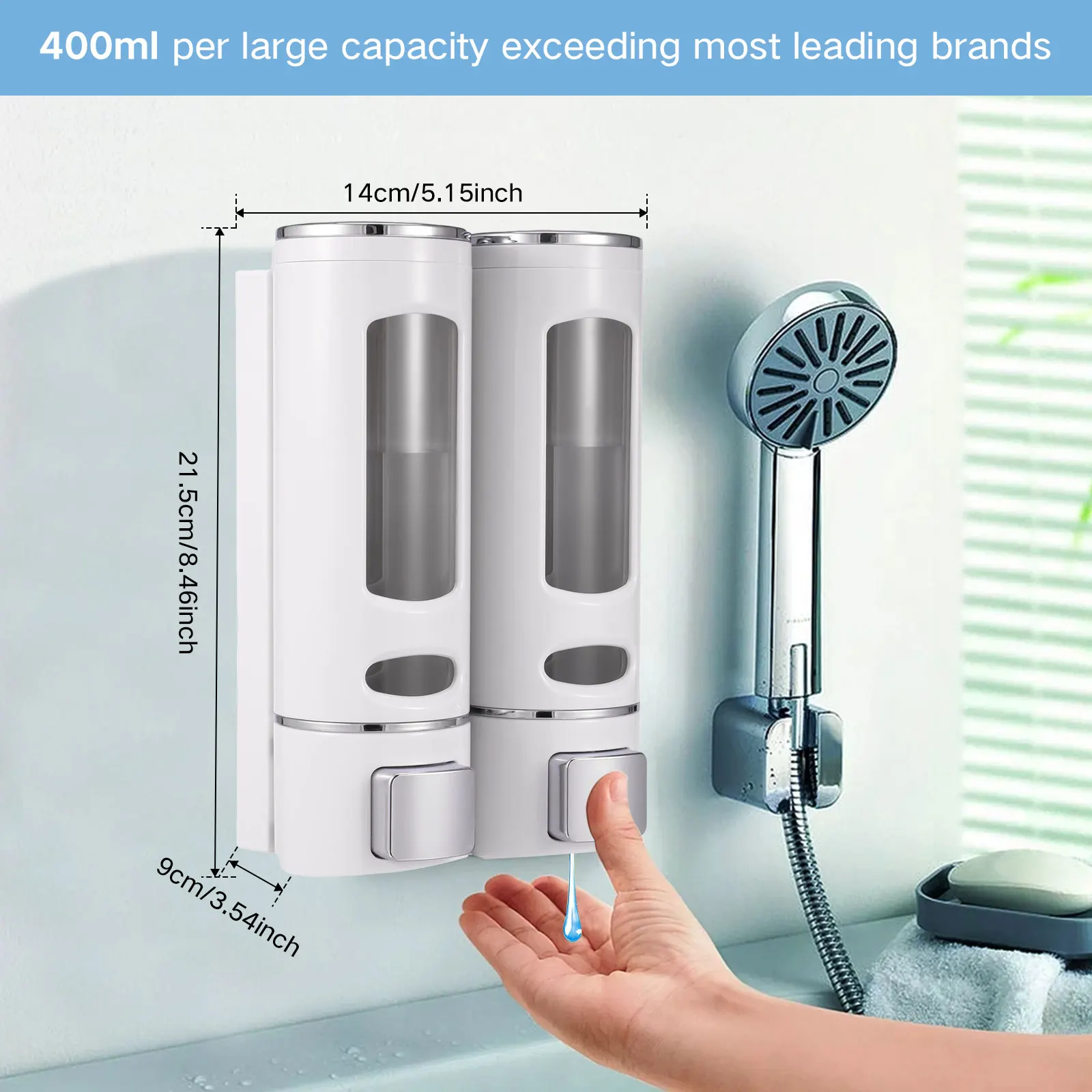 ขนาดเครื่องจ่ายสบู่ 2 ห้อง: 14 x 9 x 21.5 ซม. / 5.5 x 3.5 x 8.5 นิ้ว