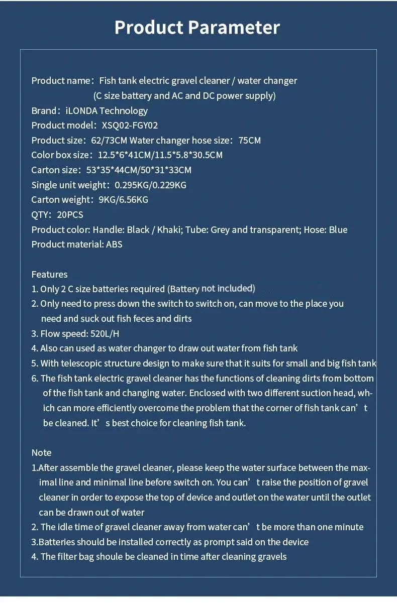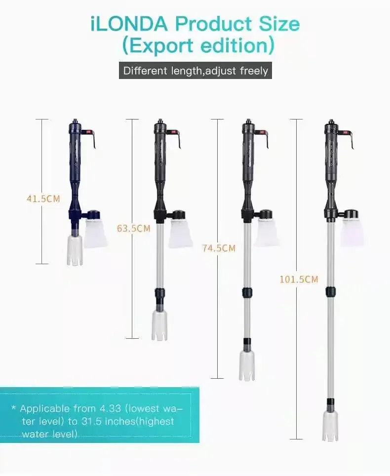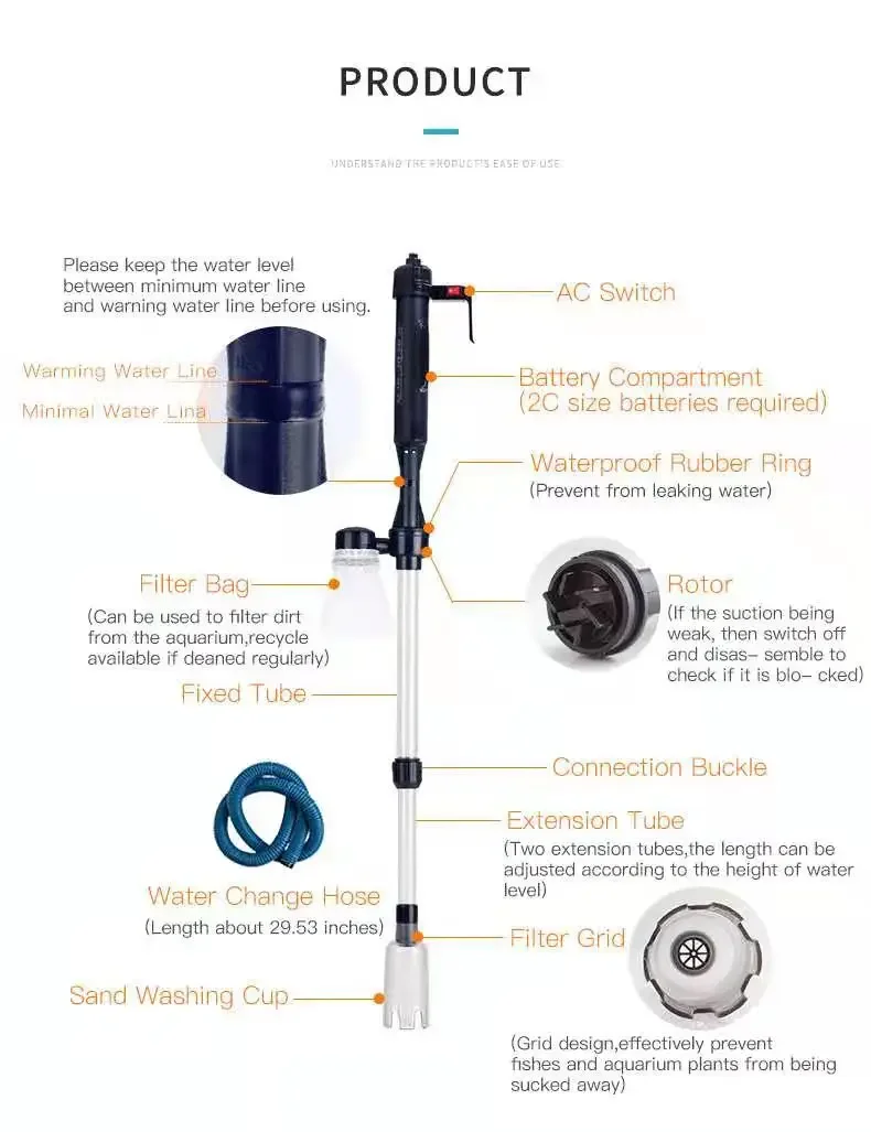 – สามารถทำความสะอาดกรวด ดูดอุจจาระของปลา และสิ่งสกปรกอื่นๆ ออกได้อย่างมีประสิทธิภาพโดยไม่ต้องเปลี่ยนน้ำ
