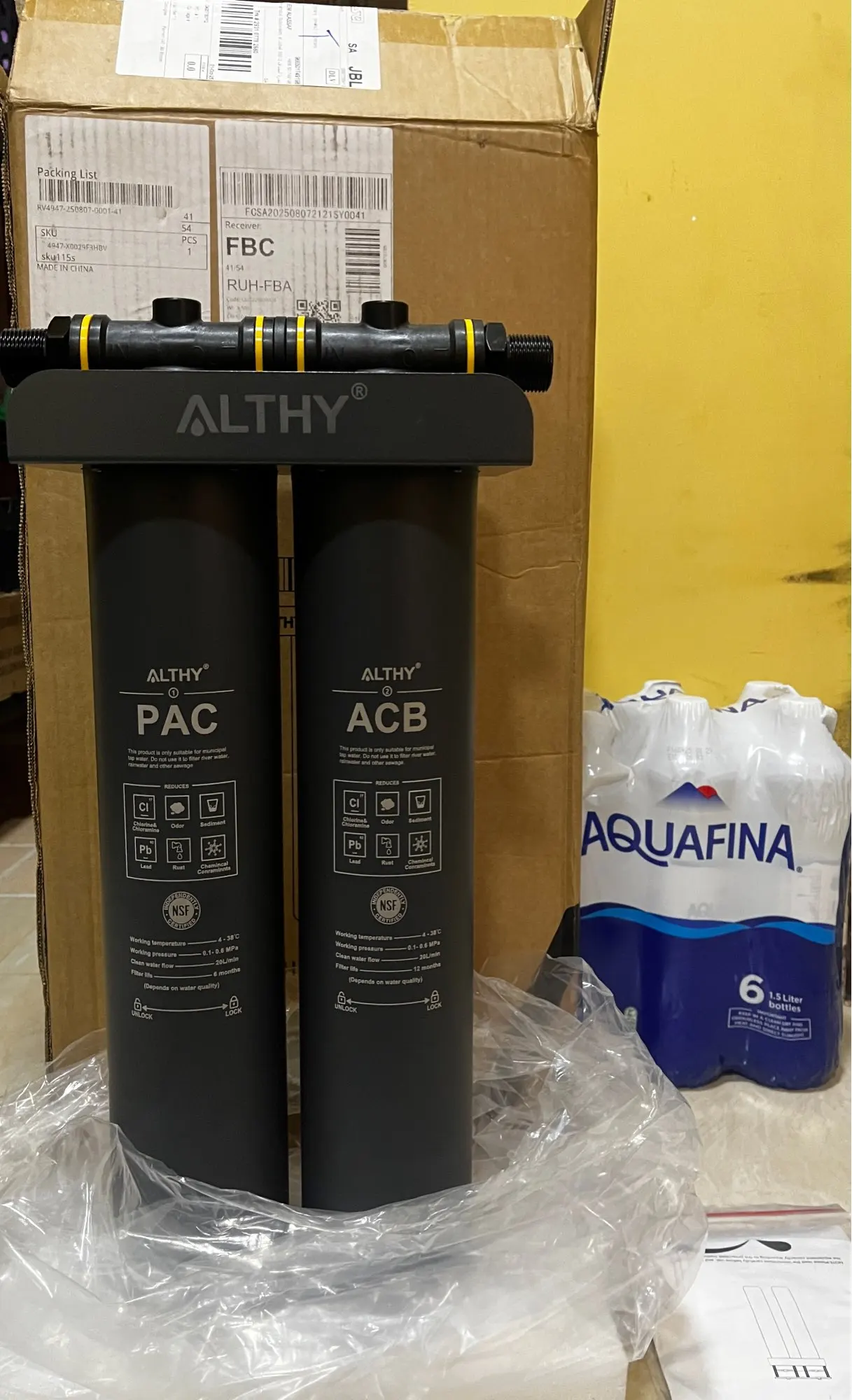 ของมาถึงผ่านการขนส่งจากซาอุดีอาระเบีย คุณภาพดีเยี่ยม ขณะนี้ยังคงอยู่ในขั้นตอนการติดตั้ง ถ้าพระเจ้าให้ ฉันจะถ่ายรูปหลังการติดตั้งและทดสอบ โปรดทราบว่าบนตัวกรองเขียนว่าอุณหภูมิของน้ำที่แนะนำควรอยู่ระหว่าง 4°C ถึง 38°C แต่หวังว่ามันจะปรับตามอุณหภูมิของน้ำที่บ้านได้