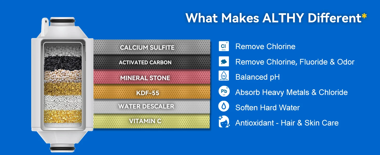 ●เริ่มฟื้นฟูผิว ผม และเล็บทันที: น้ําที่แข็ง มีคลอรีน มีสารเคมีที่ทําให้ผิวคัน รังแคเป็นขุย กลาก ผมแห้งกระดูก และเล็บเปราะ?ให้ ALTHY SF100 ให้การกรองน้ําสูงสุดเพื่อเป็นกลางกลิ่น ปรับสมดุลระดับ PH ของคุณ และผสมวิตามินซีที่เป็นประโยชน์ลงในผิวหนัง เล็บ และเส้นผมของคุณตั้งแต่ครั้งแรกที่คุณเปิดเครื่อง!