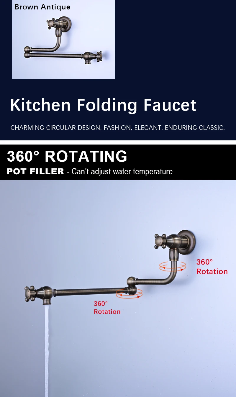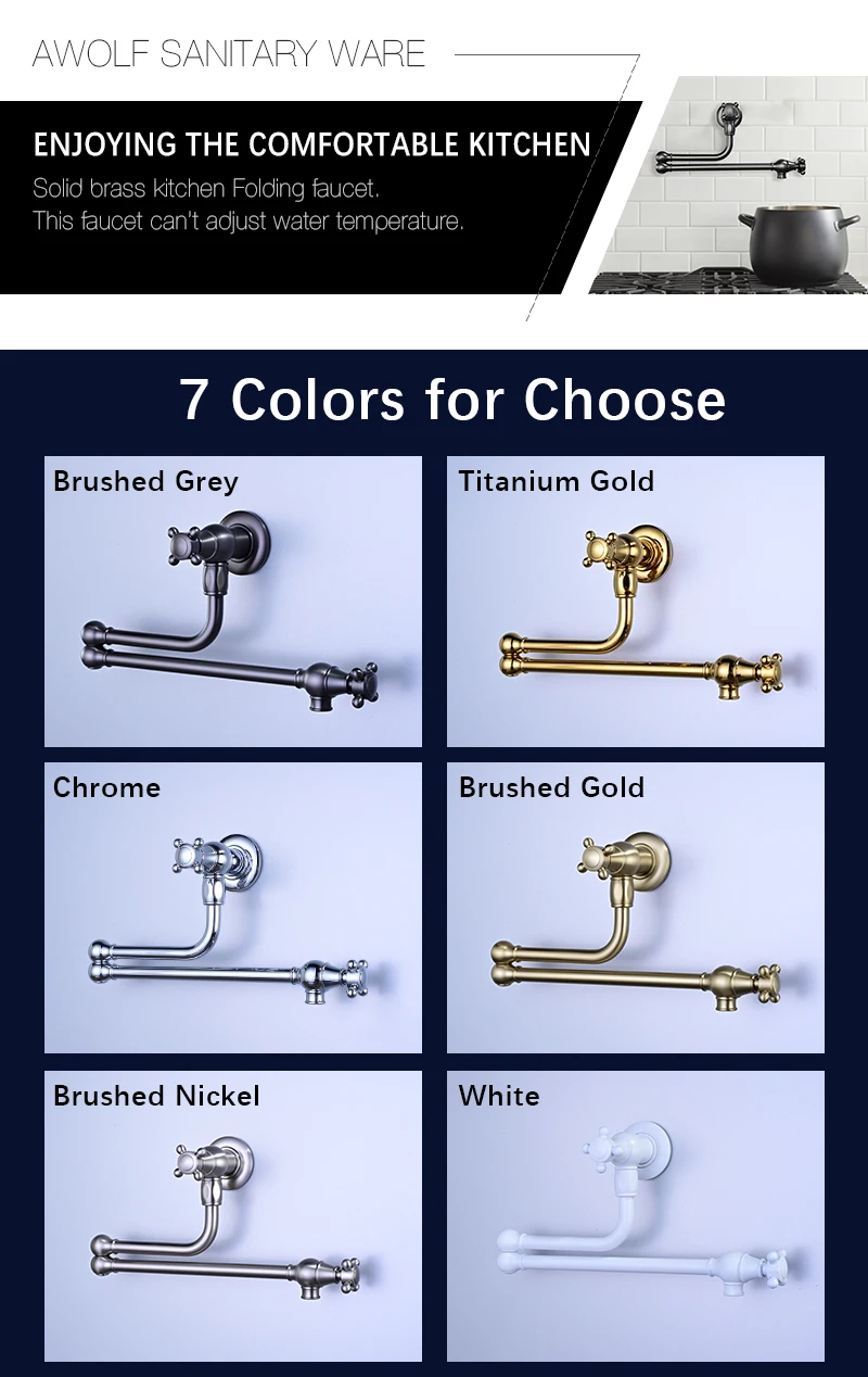Awolf ทองเหลืองหม้อ FILLER แปรงสีเทาห้องครัวพับก๊อกน้ําติดผนังทองหมุน 360 องศา TAP Chrome FW012