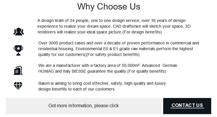 1.ทีมออกแบบ 24 คน บริการออกแบบแบบตัวต่อตัว ประสบการณ์การออกแบบมากกว่า 16 ปีเพื่อให้ได้พื้นที่ในฝันของคุณ นักร่าง CAD จะร่างพื้นที่ของคุณ 3 Drenderers จะตระหนักถึงภาพพื้นที่ในอุดมคติของคุณ(สําหรับประโยชน์ด้านการออกแบบ) 2. กล่องผลิตภัณฑ์มากกว่า 3,000 กล่องและประสิทธิภาพที่ได้รับการพิสูจน์แล้วมากกว่าทศวรรษในด้านที่อยู่อาศัยเชิงพาณิชย์และที่อยู่อาศัยวัตถุดิบเกรด E0 และ E1 เพื่อสิ่งแวดล้อมมีคุณภาพสูงสุดสําหรับลูกค้าของเรา ((เพื่อประโยชน์ด้านความปลอดภัยของผลิตภัณฑ์) 3.Balom มุ่งหวังที่จะนําประโยชน์ด้านการออกแบบที่คุ้มค่า ความปลอดภัย คุณภาพสูง และความหรูหรามาสู่ลูกค้าแต่ละรายของเรา