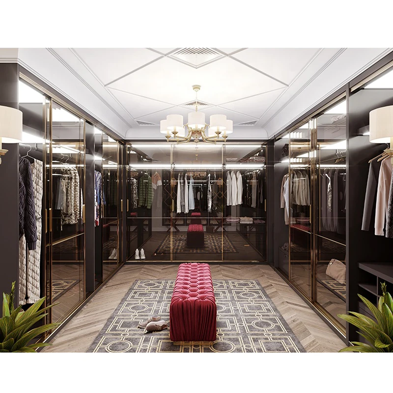 Balom ดีไซน์หรูหราแบบกําหนดเองอลูมิเนียมไม้เนื้อแข็งแก้วเดินห้องนอนตู้เสื้อผ้าตู้เสื้อผ้าสําหรับวิลล่า