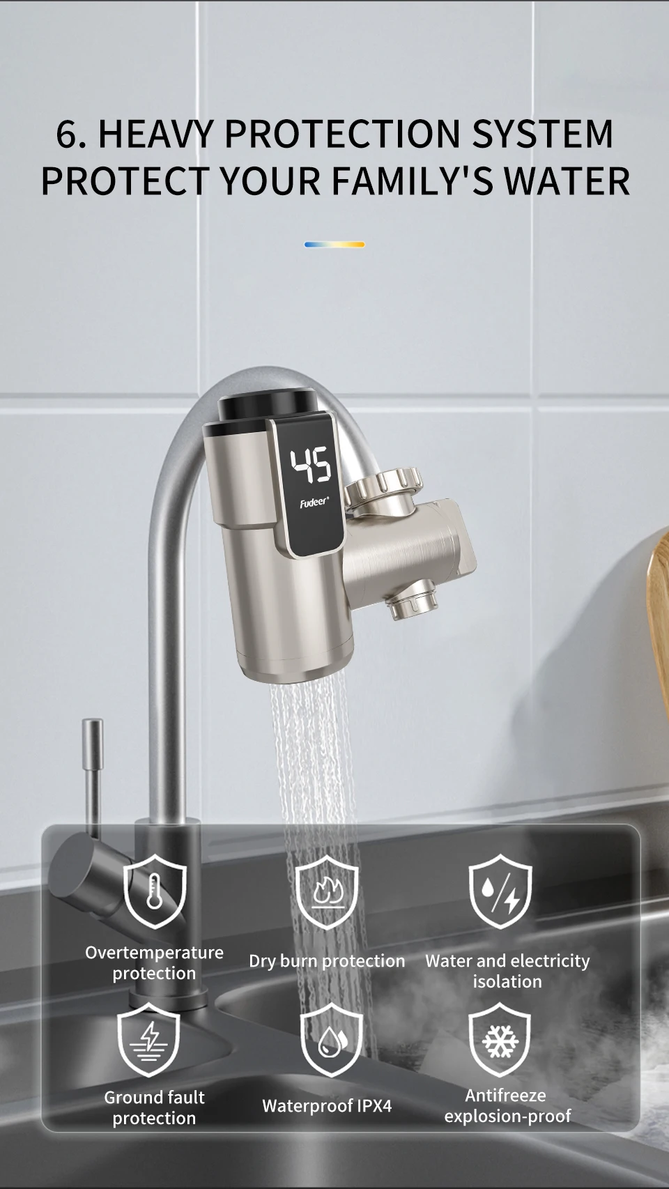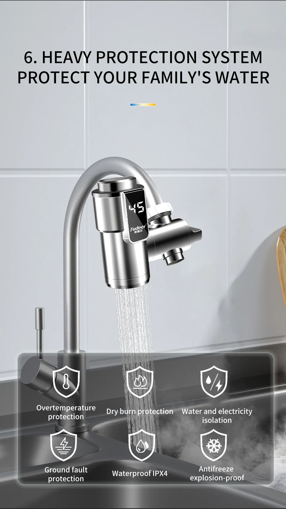 ☆【การออกแบบที่ปลอดภัย】: ก๊อกน้ําทําความร้อนใช้ช่องแยกน้ําและไฟฟ้าคู่เพื่อหลีกเลี่ยงปัญหาการรั่วไหลผลิตภัณฑ์มีการออกแบบการป้องกันความปลอดภัยหลายแบบ เช่น การป้องกันการเผาไหม้แบบแห้ง การป้องกันการระเบิด การป้องกันการระบายแรงดัน การป้องกันสายดิน การป้องกันอุณหภูมิเกิน ฯลฯ ทําให้คุณมีสภาพแวดล้อมการใช้งานที่ปลอดภัยและมั่นคง
