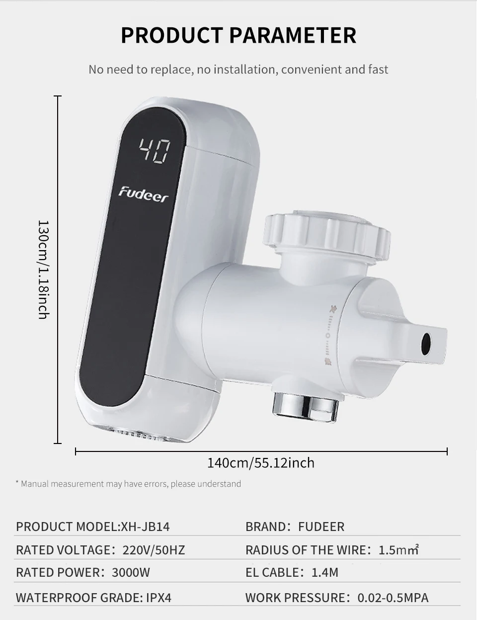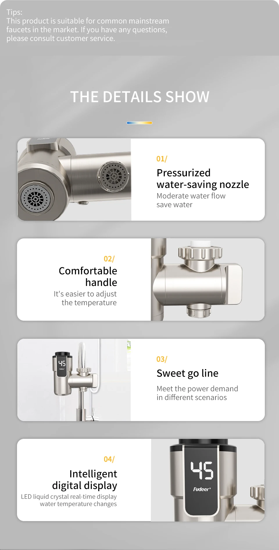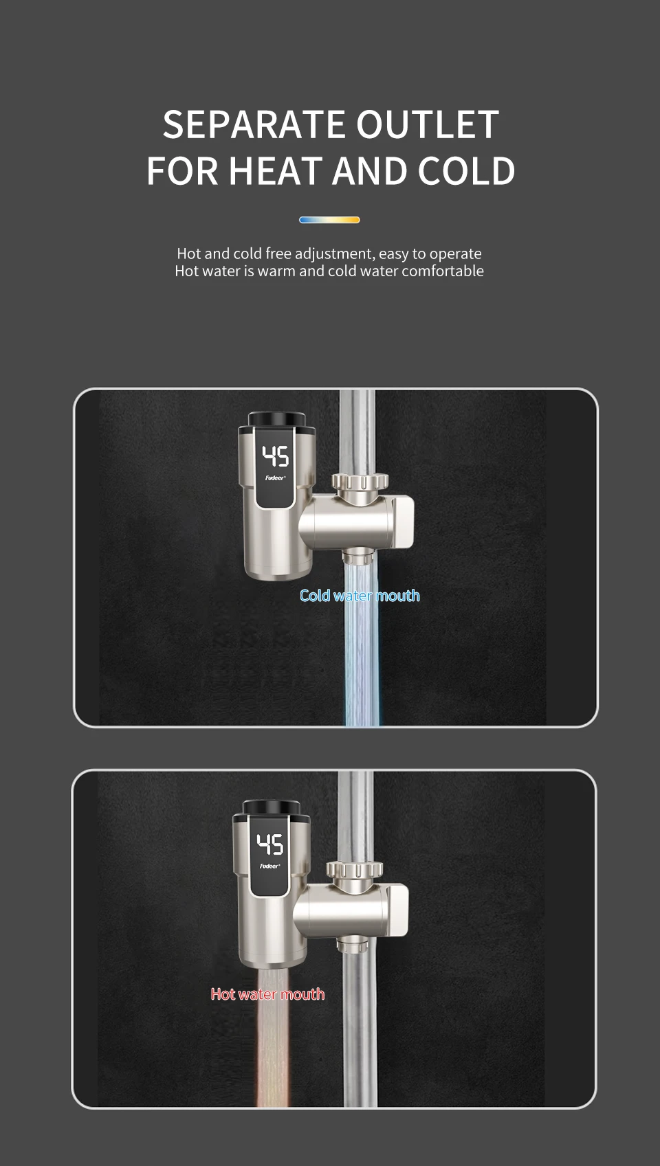 ☆【จอแสดงผล LED】:ก๊อกน้ําทําความร้อนใช้จอแสดงผล LED ซึ่งสามารถดูการเปลี่ยนแปลงของอุณหภูมิได้โดยสังหรณ์ใจ ข้อมูลมีความแม่นยํา สะดวก และรวดเร็ว และเหมาะสําหรับใช้ในครอบครัว