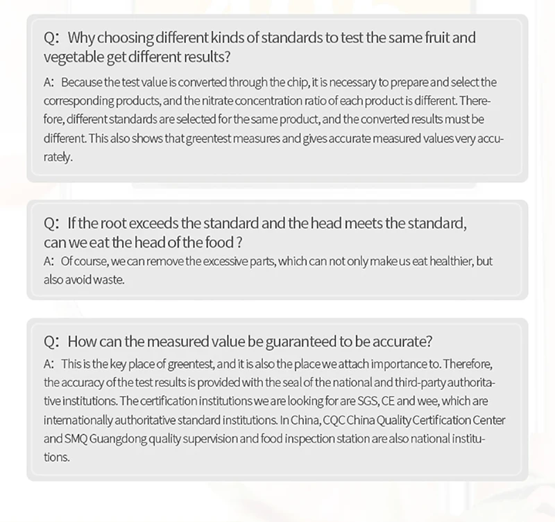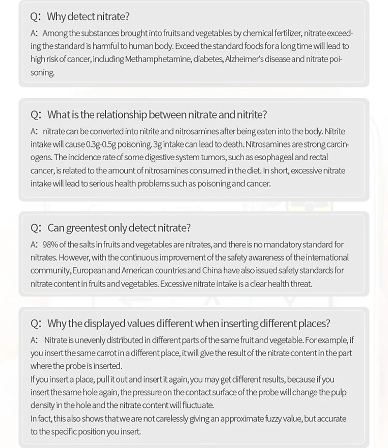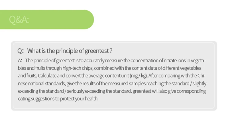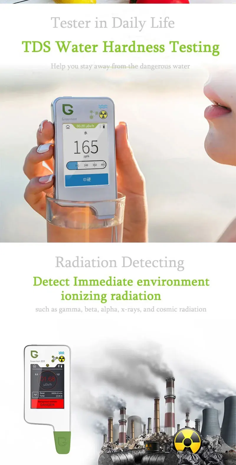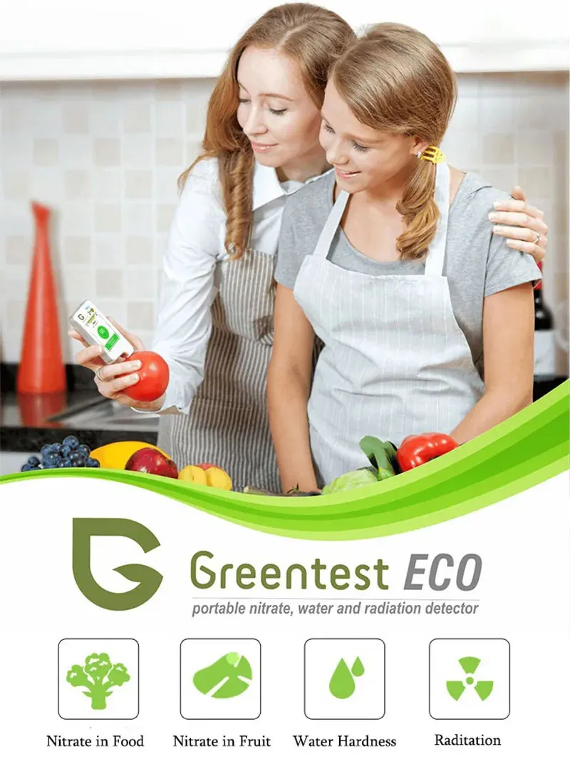 ด้วยการใช้เทคโนโลยีการทดสอบไนเตรต น้ำ และรังสี นวัตกรรม Greentest Eco6F ตรวจจับระดับไนเตรตในผักและผลไม้ที่บริโภคกันมากที่สุด 64 ชนิด และเนื้อสัตว์และปลาทุกประเภทนอกจากนี้ ยังสามารถตรวจจับของแข็งที่ละลายได้ทั้งหมด (TDS) ในน้ำ (หรือความกระด้างของน้ำ) รวมถึงรังสีพื้นหลังในสภาพแวดล้อมของคุณโดยทันที เพื่อแจ้งเตือนคุณถึงการสัมผัสรังสีที่ไม่ปลอดภัย