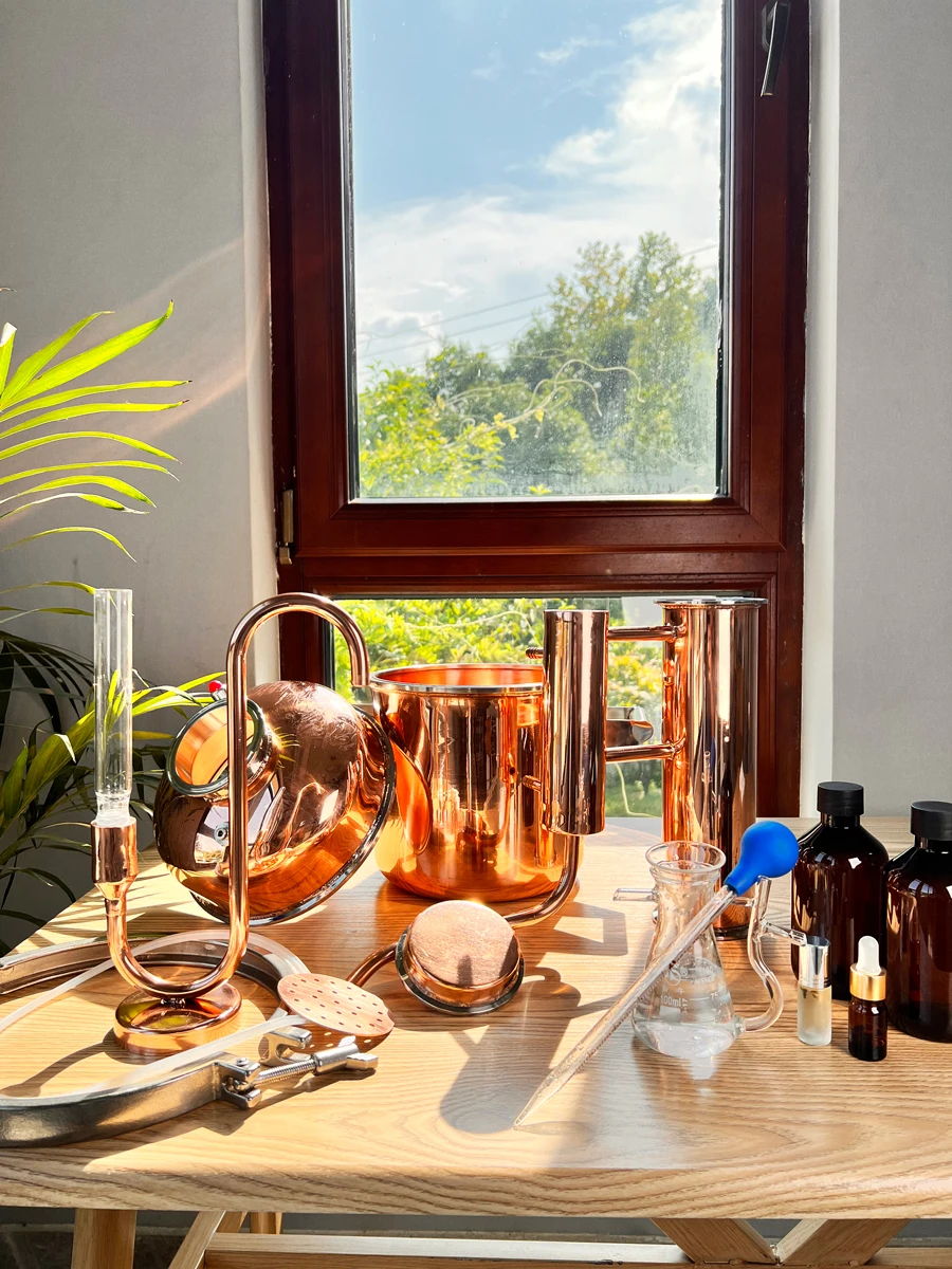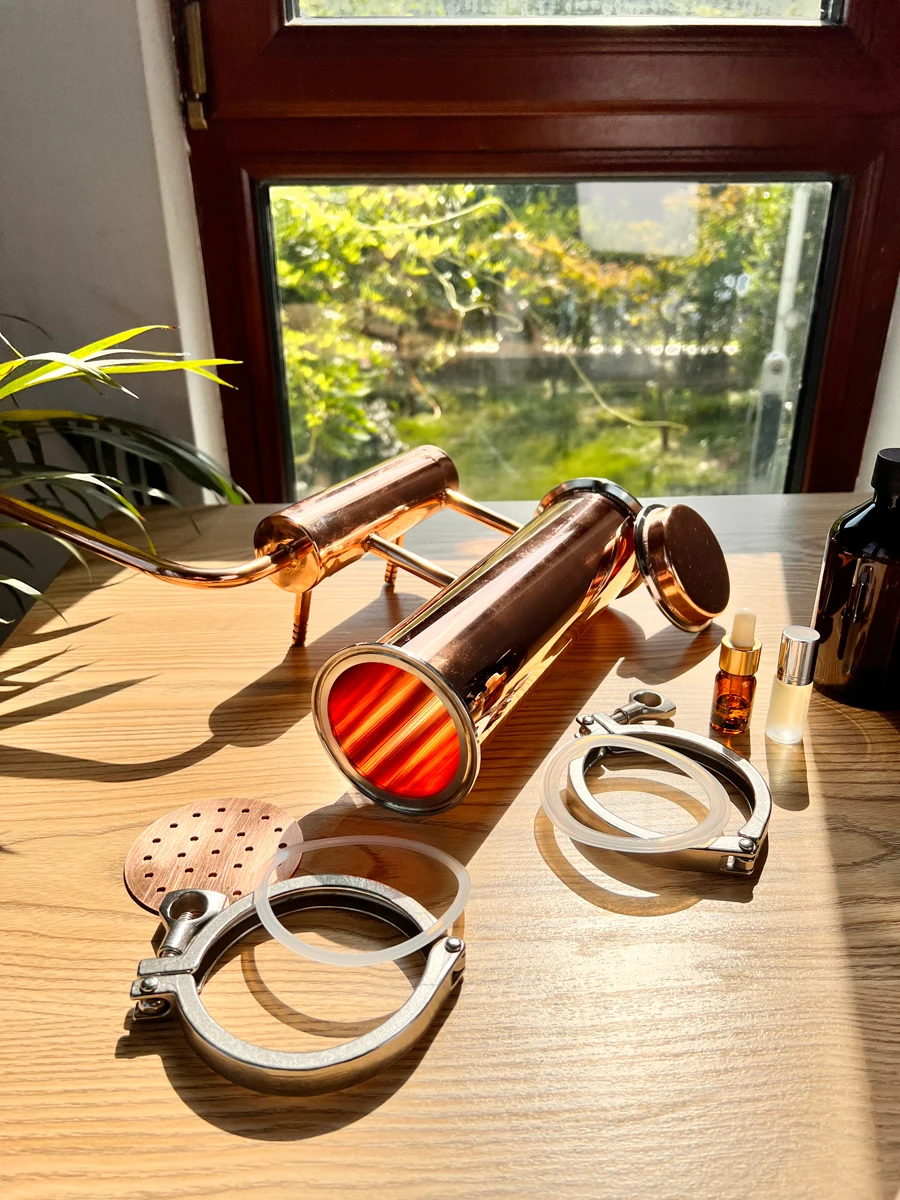 เครื่องกลั่นทองแดงขนาด 8 ลิตรเหมาะสําหรับผู้ที่ต้องการผลิตน้ํามันหอมระเหยคุณภาพสูงที่บ้านหรือในขนาดเล็กทองแดงเป็นวัสดุที่เลือกสรรเนื่องจากมีค่าการนําความร้อนที่ดีเยี่ยมและความสามารถในการกําจัดสารประกอบกํามะถัน ซึ่งอาจส่งผลเสียต่อกลิ่นและคุณภาพของน้ํามันหอมระเหย