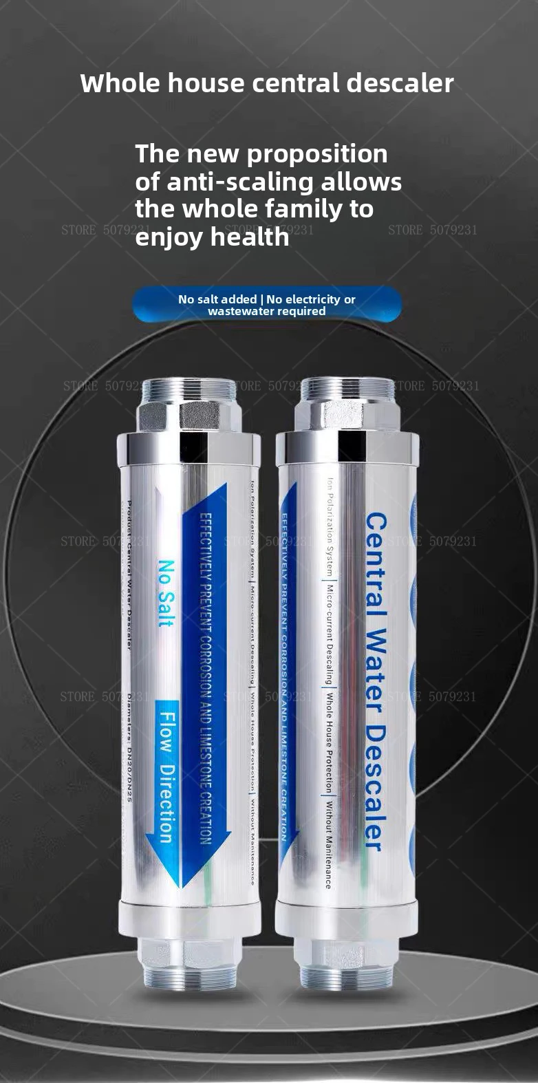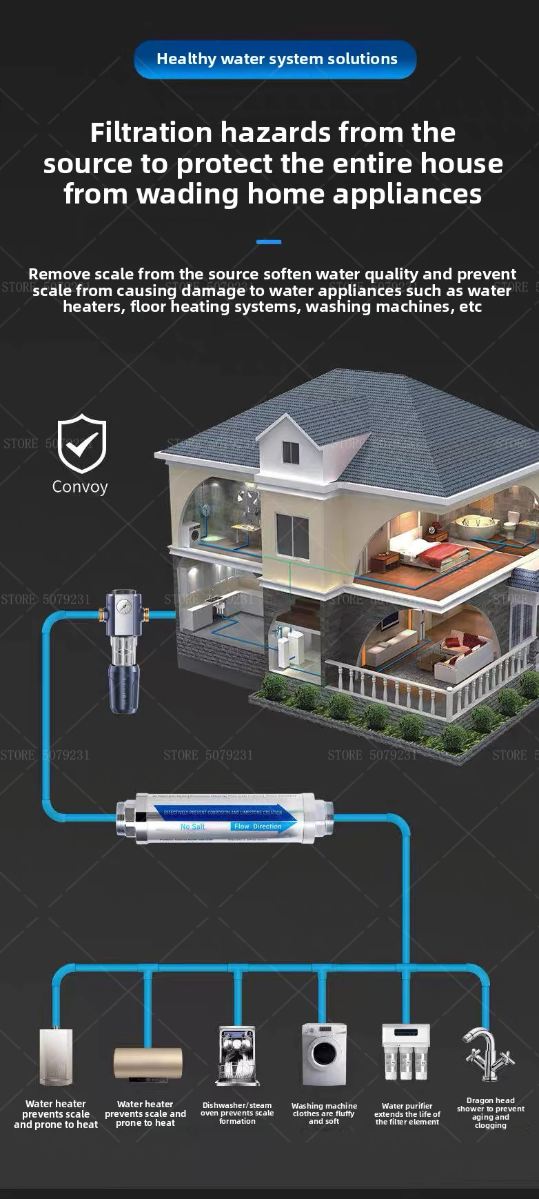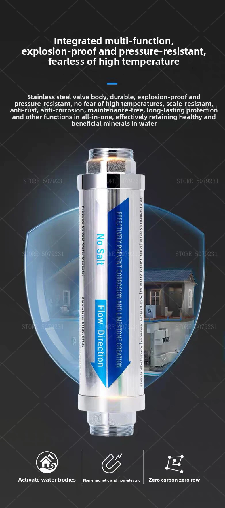 เหมาะสำหรับการลดการสะสมและขจัดคราบตะกรันในทั้งบ้าน ลดการเกิดคราบหินปูนบนอุปกรณ์จ่ายน้ำได้ถึง 86% ช่วยยืดอายุการใช้งานและเพิ่มประสิทธิภาพของอุปกรณ์ (เครื่องทำน้ำอุ่น, ฝักบัว, หม้อต้ม, กาต้มน้ำในเครื่องใช้ไฟฟ้าภายในบ้าน, ท่อประปา, วาล์ว, ก๊อกน้ำ, และเครื่องผสม)