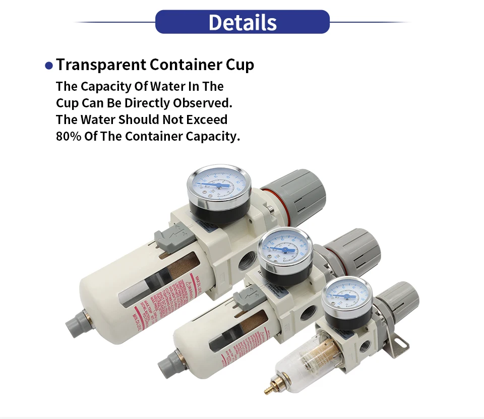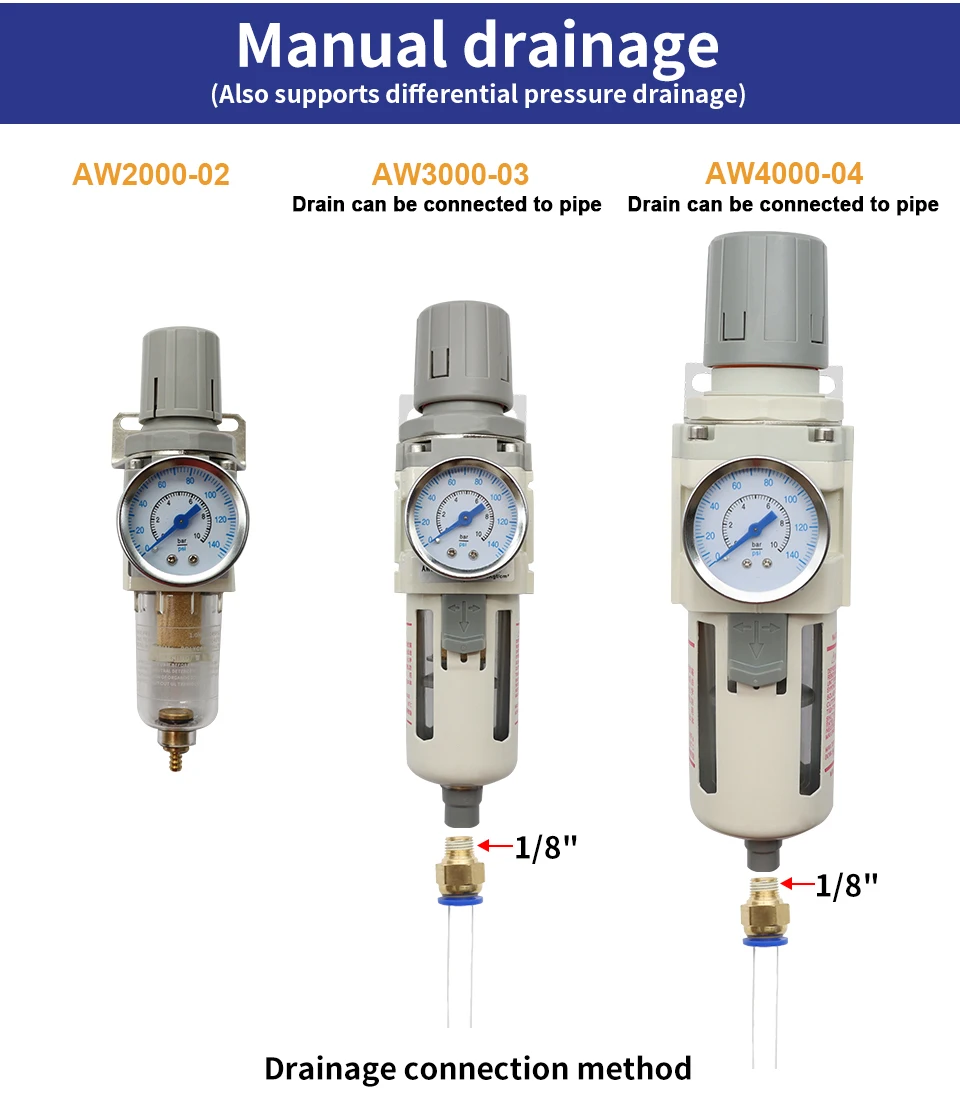 ซีรีส์ AW ได้รับการออกแบบมาให้บำรุงรักษาง่าย ด้วยโครงสร้างที่เรียบง่ายซึ่งช่วยให้เปลี่ยนตัวกรองได้อย่างรวดเร็วและตรงไปตรงมา ตำแหน่งตัวกรองอากาศส่วนกลางเข้าถึงได้ง่าย ทำให้สะดวกสำหรับการตรวจสอบและเปลี่ยนเป็นประจำ ตัวควบคุมช่วยให้มั่นใจได้ว่าแรงดันเอาท์พุตจะสม่ำเสมอ ทำให้มีการจ่ายแรงดันลมให้กับเครื่องมือลมของคุณอย่างเสถียร ไม่ว่าคุณกำลังมองหาอะไหล่ทดแทนสำหรับตัวปรับแรงดันลม หรือระบบกรองอากาศส่วนกลาง ผลิตภัณฑ์นี้เป็นตัวเลือกที่ยอดเยี่ยมในการรักษาประสิทธิภาพและยืดอายุการใช้งานของระบบลมของคุณ