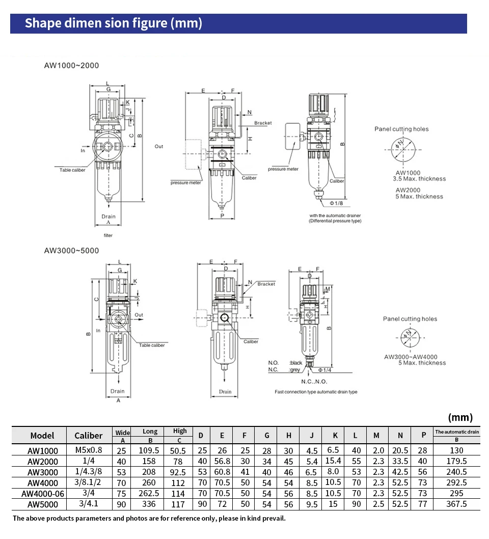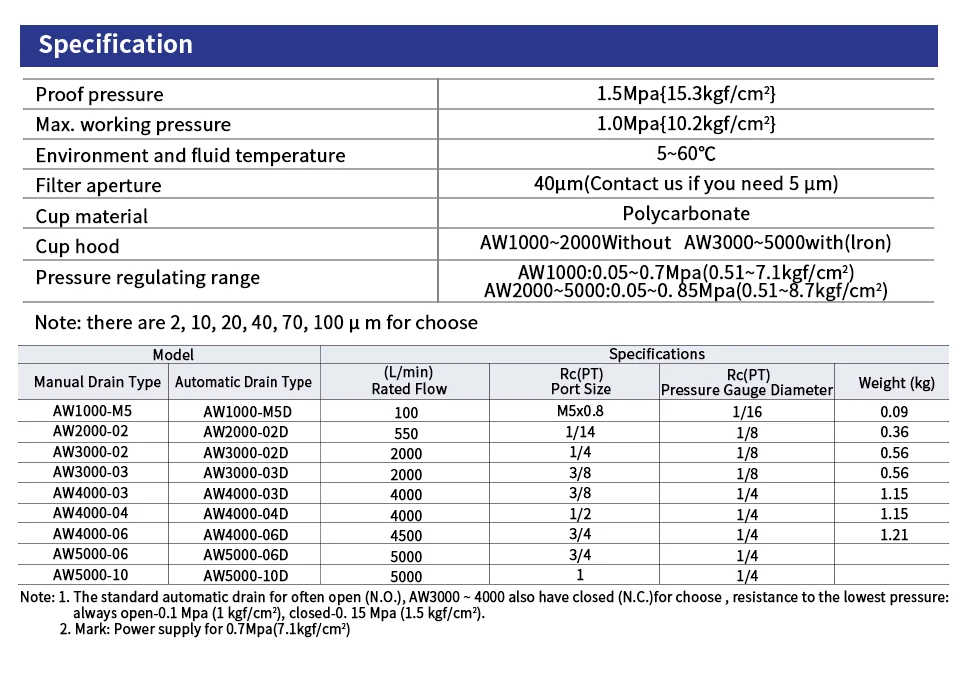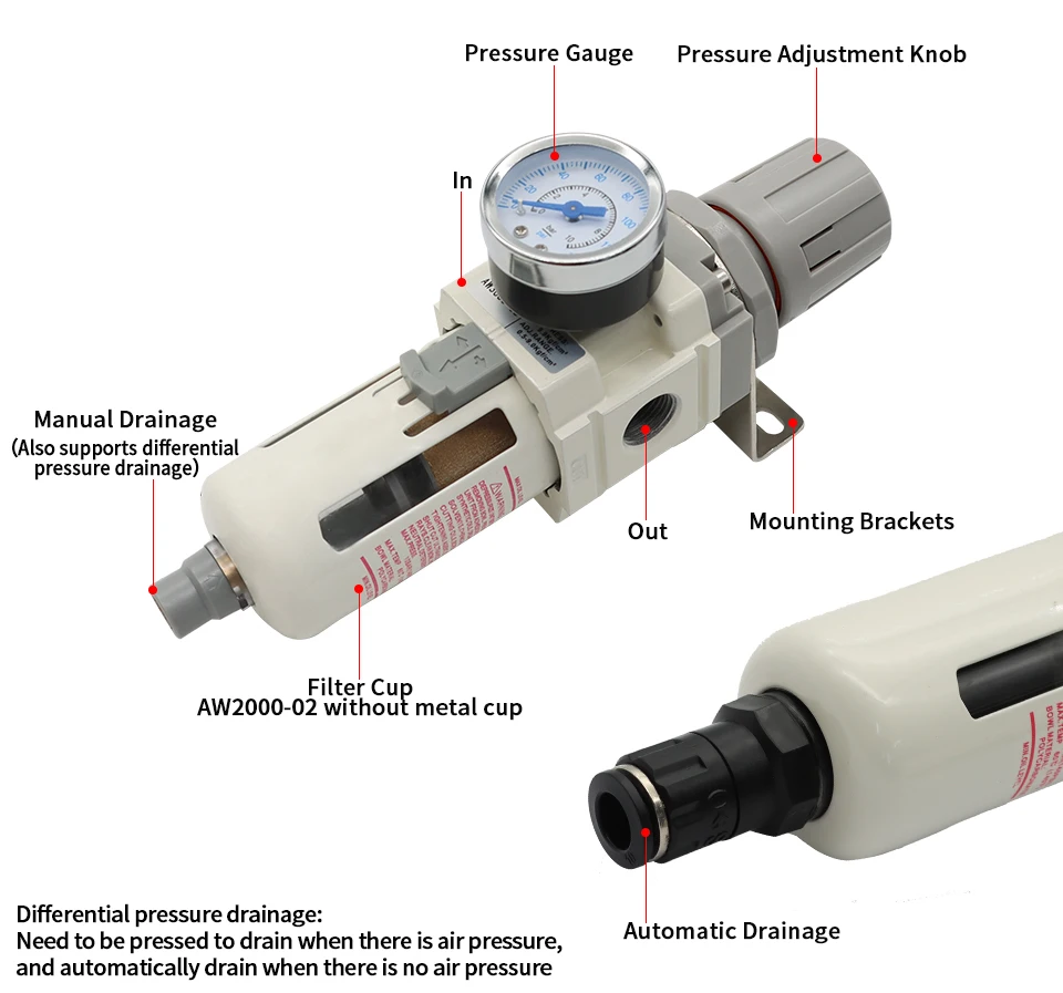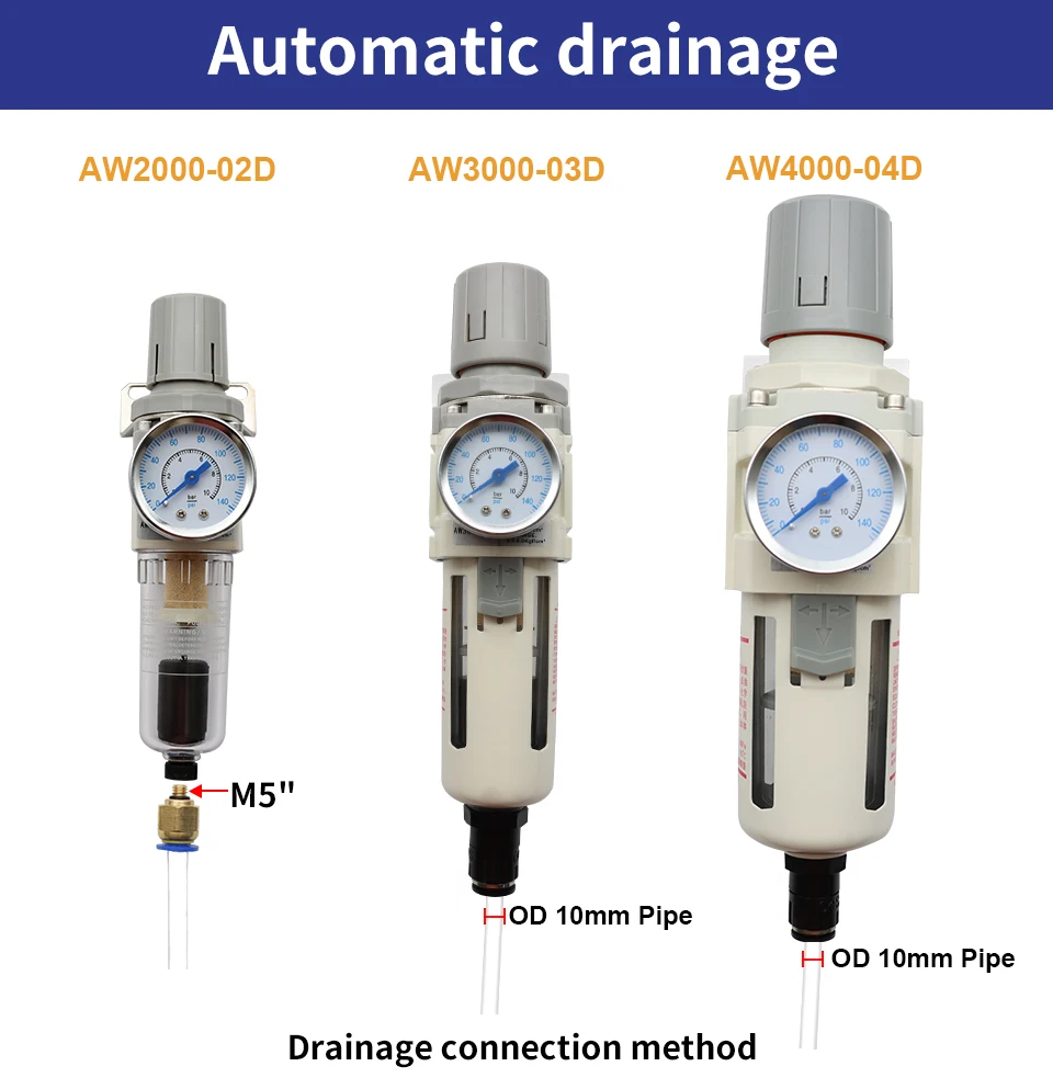 AW Series ไม่ได้เป็นเพียงตัวกรองเท่านั้น แต่ยังเป็นวาล์วควบคุมแรงดันที่ทำงานควบคู่กันเพื่อจ่ายอากาศที่สม่ำเสมอและสะอาดให้กับเครื่องมือลมของคุณส่วนประกอบตัวกรองได้รับการออกแบบทางวิศวกรรมเพื่อขจัดสิ่งปนเปื้อนออกจากแหล่งอากาศ ในขณะที่วาล์วควบคุมช่วยให้มั่นใจได้ว่าแรงดันเอาท์พุตอยู่ในช่วงที่กำหนด ป้องกันความเสียหายต่ออุปกรณ์ที่มีความละเอียดอ่อนช่วงอุณหภูมิการทำงานอยู่ระหว่าง 5-60 องศา℃ ทำให้เหมาะสำหรับสภาพอากาศต่างๆ จึงมั่นใจได้ถึงประสิทธิภาพที่เชื่อถือได้ในสภาพแวดล้อมที่หลากหลาย